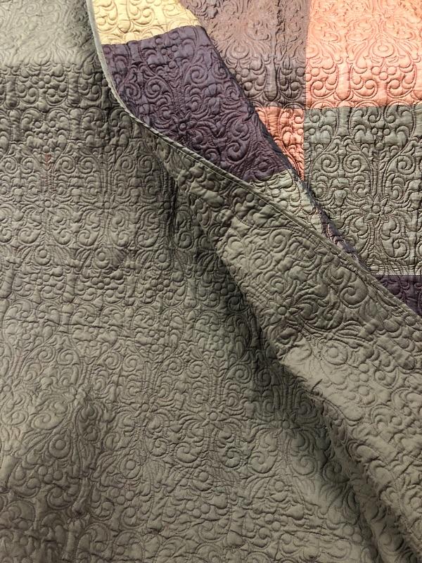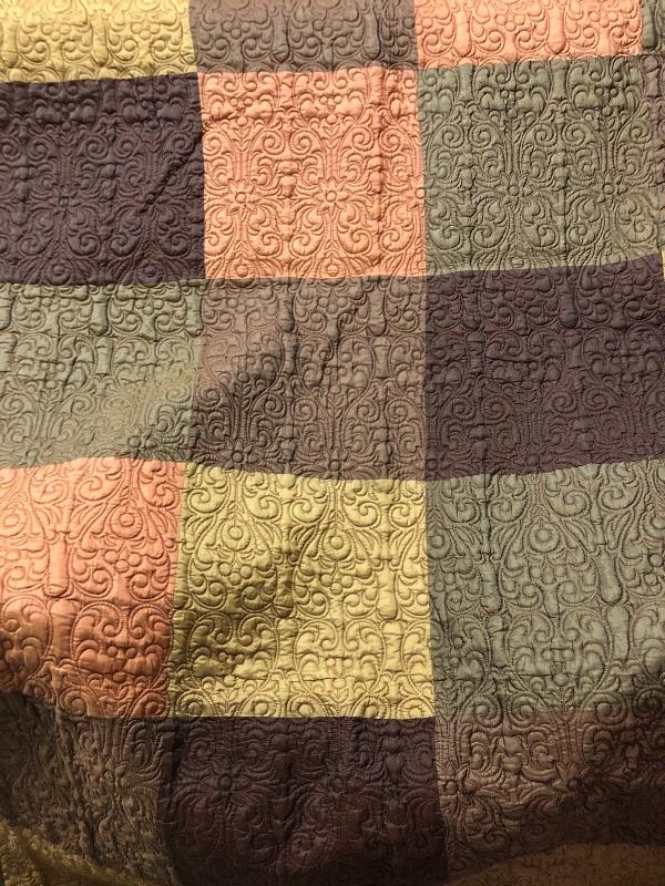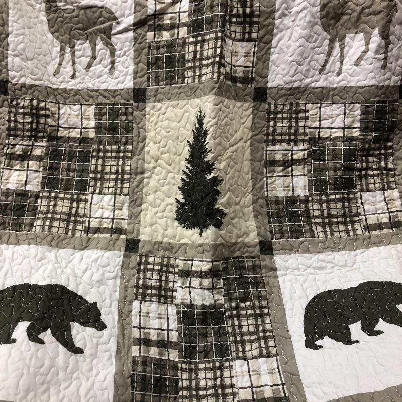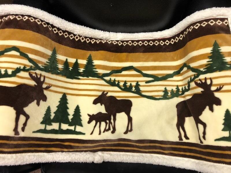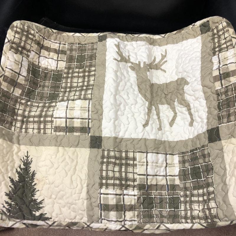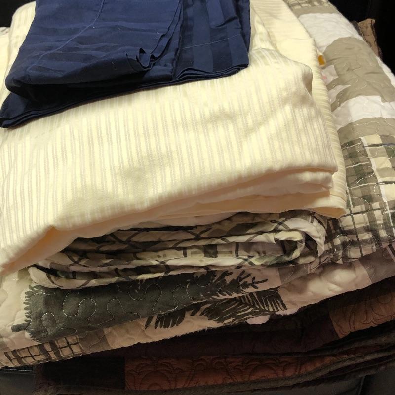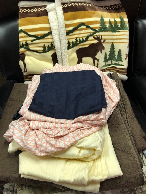 This lot includes many items to keep you warm and your house looking sharp! It includes two bedspreads and the outdoorsy bedspread has pillow sham cases included. The quilted style multi-colored queen size bedspread is almost in new condition. There is also two moose velour like fuzzy warm pillow cases and two sets of full sheets and two blue pillow cases.
