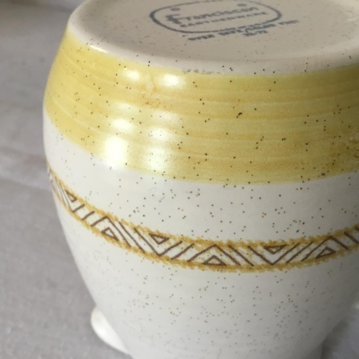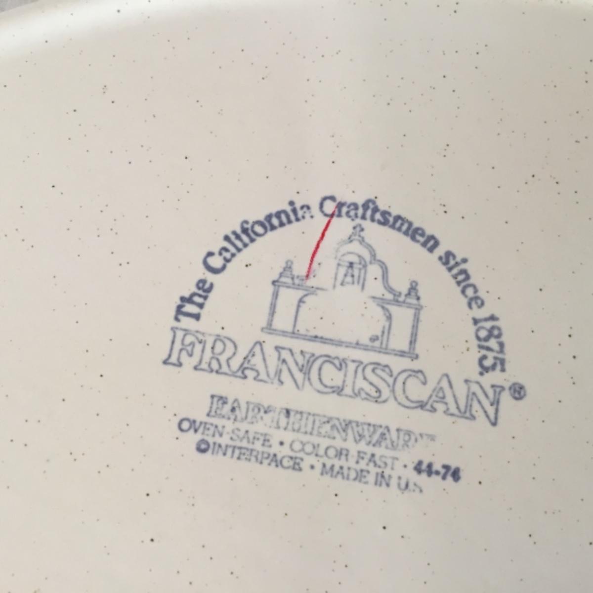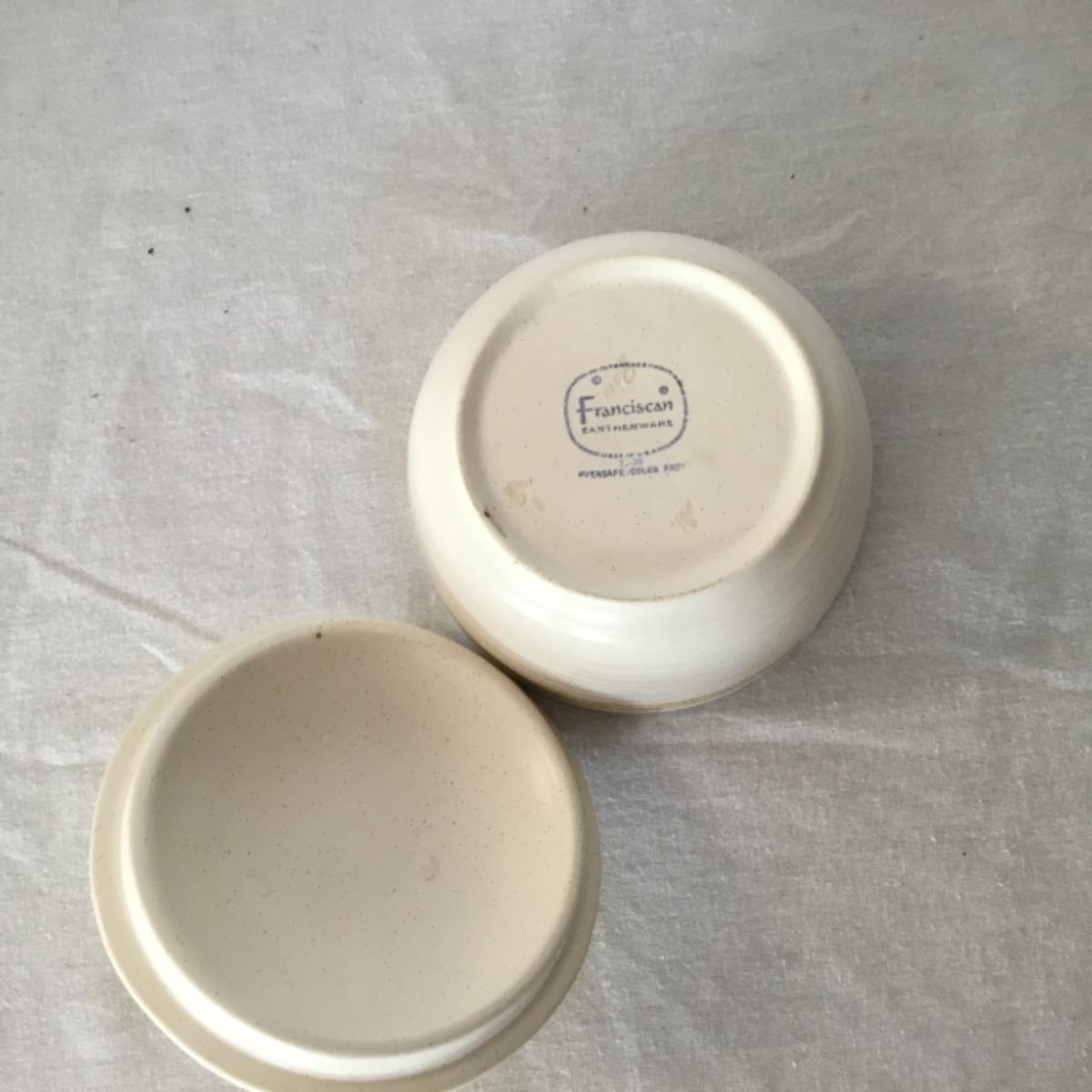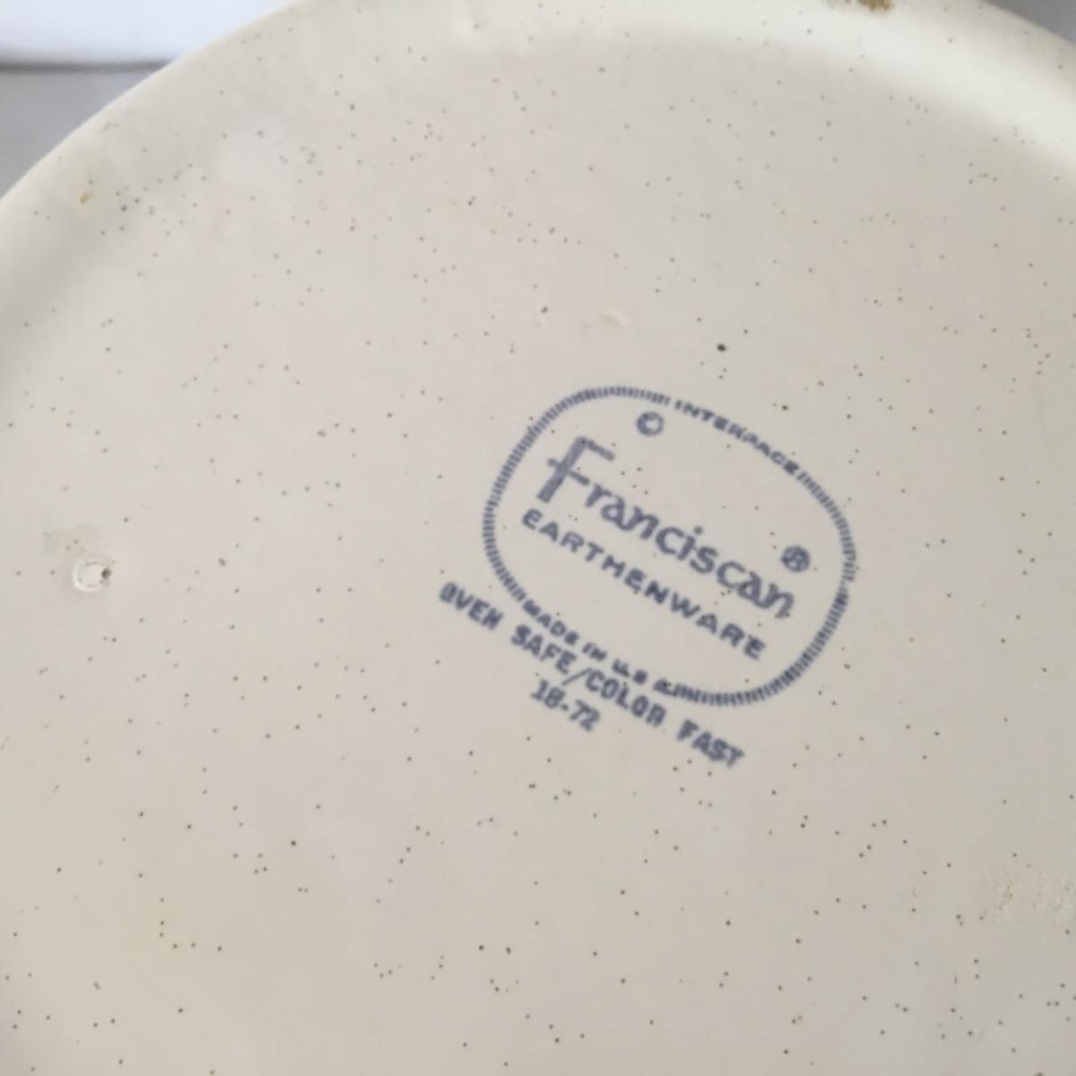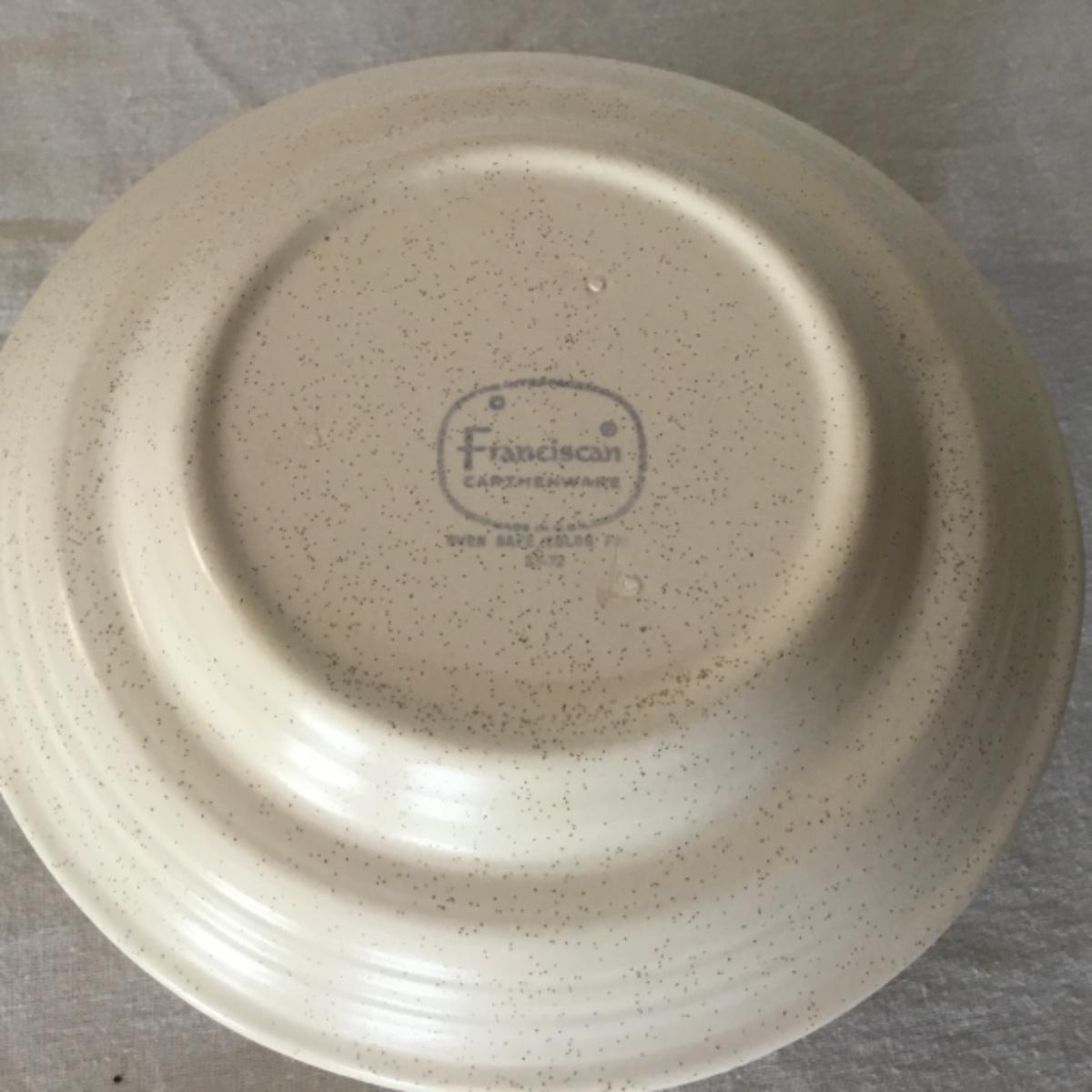 Adorable oven-safe Franciscan Earthware set will brighten and complete any kitchen! This lot includes 1 large bowl with a lid and handles, a diameter of 9.5", 2 smaller bowls with lids, and a butter dish with a lid. Bowls included in the lot are 1 large serving bowl, 4 large salad bowls, 3 medium/large bowls, 9 traditional cereal bowls with a diameter of 6.5" and 1 additional small bow. Plates in the lot include 2 serving platters that are 14" long, 15 dinner plates, 2 deeper serving plates that are NOT Franciscan but has similar design, 13 salad plates, and 24 teacup plates with diameters of 6.5". Lot includes tea/coffe items such as an 8.5" tall pitcher with handle and lid, 2 coffee mugs, and 17 teacups that have diameters of 4" and stand 3" tall. More pitchers without lids are included in this lot; 2 large that stands 8" tall, 1 medium, and 2 small pitchers. The last serving and hosting items in the lot are 2 chip & dip platters, 2 gravy bowls, and 4 salt and pepper shakers. The set is in fairly good condition considering age and use. See photos! Local pickup only.