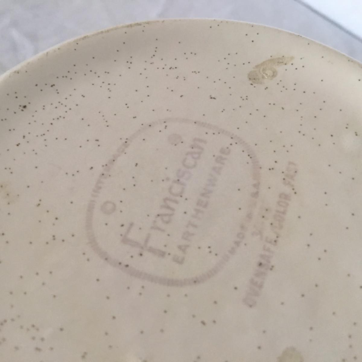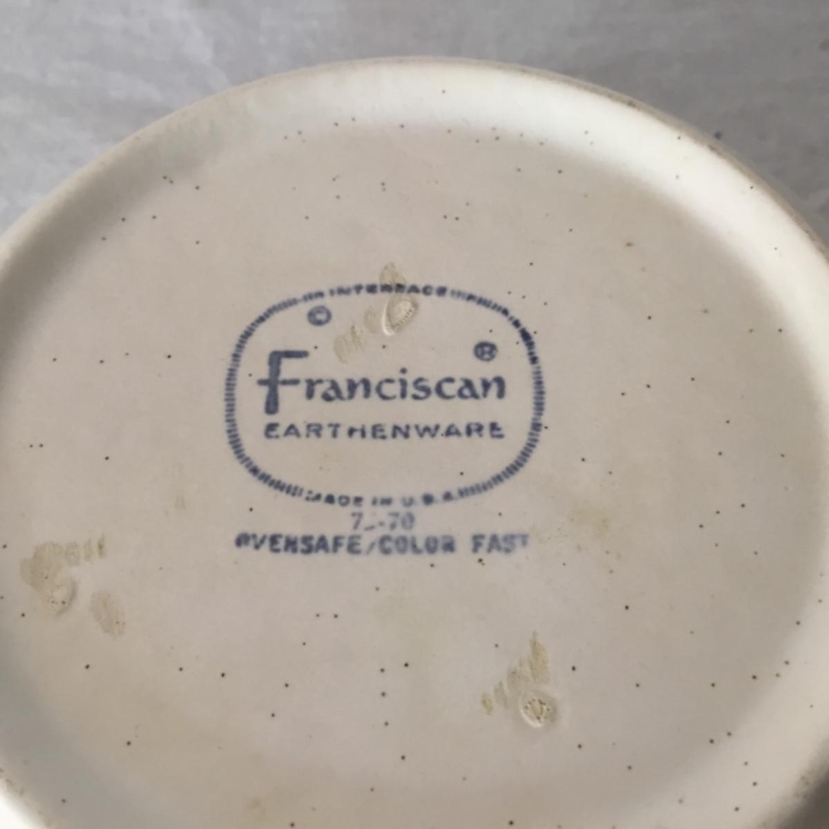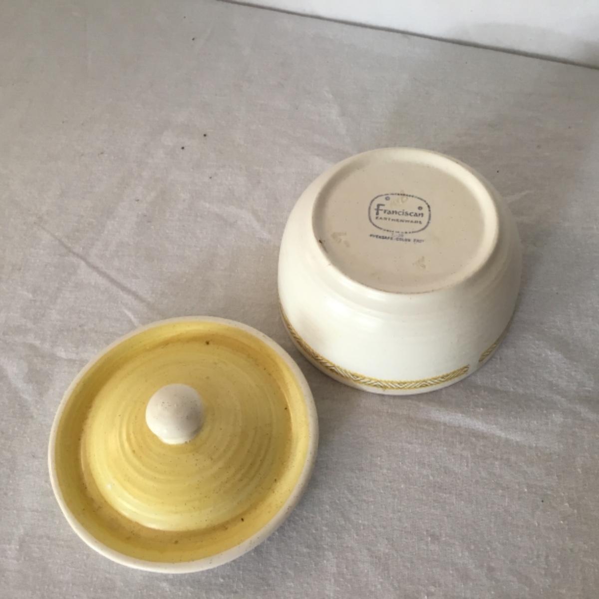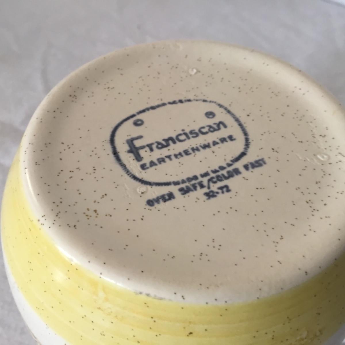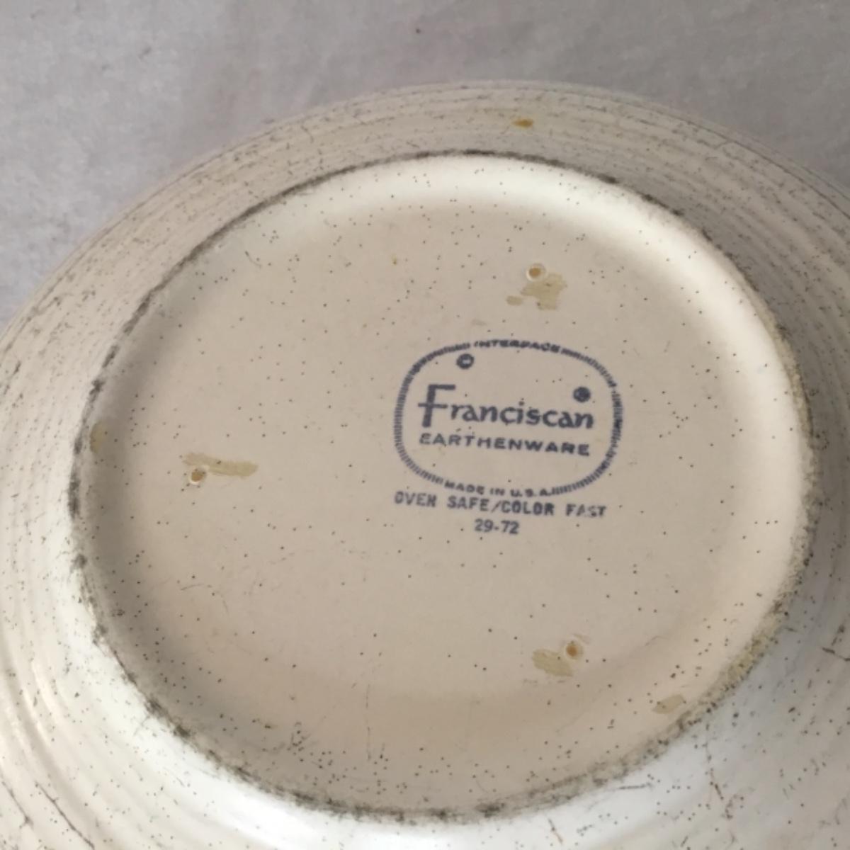 Adorable oven-safe Franciscan Earthware set will brighten and complete any kitchen! This lot includes 1 large bowl with a lid and handles, a diameter of 9.5", 2 smaller bowls with lids, and a butter dish with a lid. Bowls included in the lot are 1 large serving bowl, 4 large salad bowls, 3 medium/large bowls, 9 traditional cereal bowls with a diameter of 6.5" and 1 additional small bow. Plates in the lot include 2 serving platters that are 14" long, 15 dinner plates, 2 deeper serving plates that are NOT Franciscan but has similar design, 13 salad plates, and 24 teacup plates with diameters of 6.5". Lot includes tea/coffe items such as an 8.5" tall pitcher with handle and lid, 2 coffee mugs, and 17 teacups that have diameters of 4" and stand 3" tall. More pitchers without lids are included in this lot; 2 large that stands 8" tall, 1 medium, and 2 small pitchers. The last serving and hosting items in the lot are 2 chip & dip platters, 2 gravy bowls, and 4 salt and pepper shakers. The set is in fairly good condition considering age and use. See photos! Local pickup only.