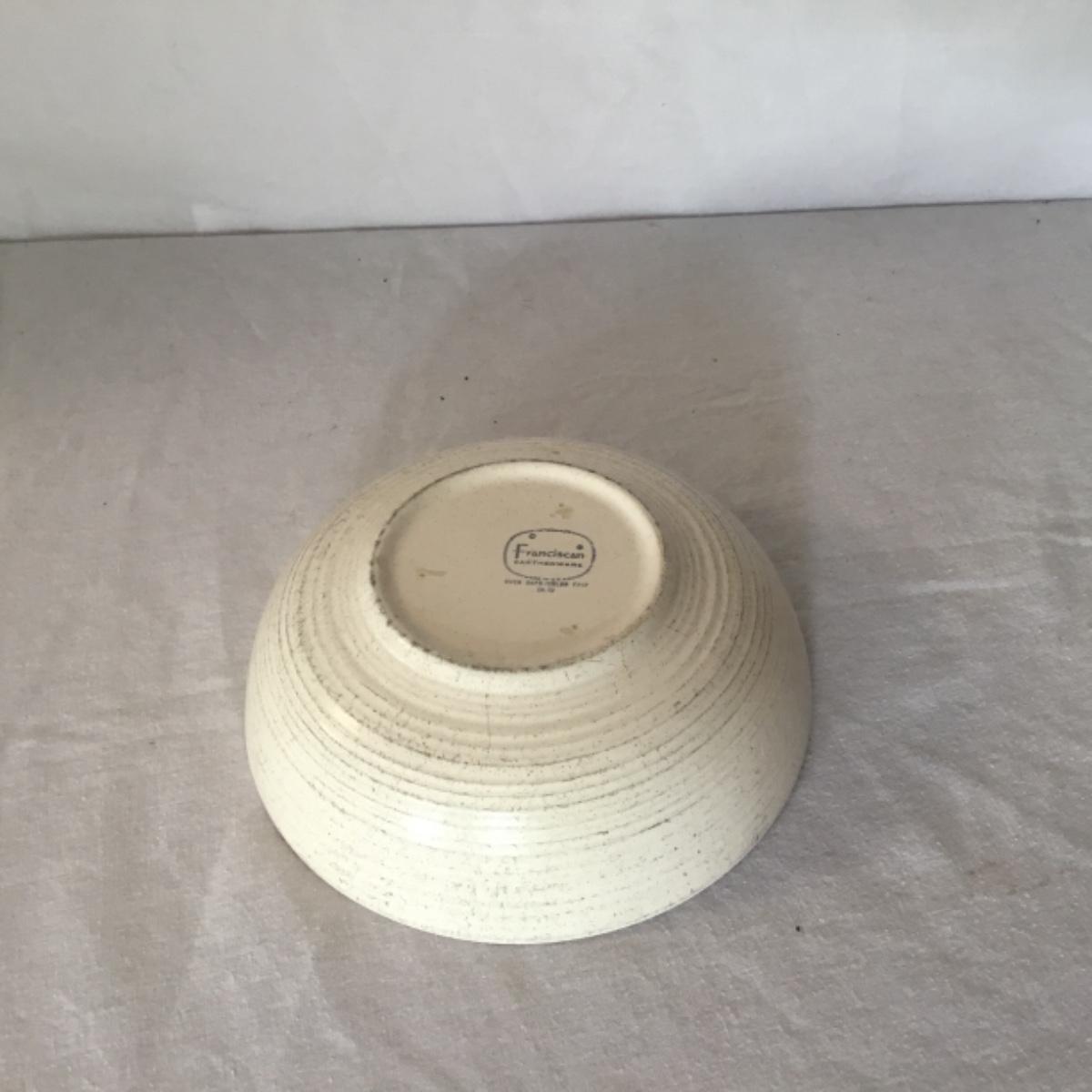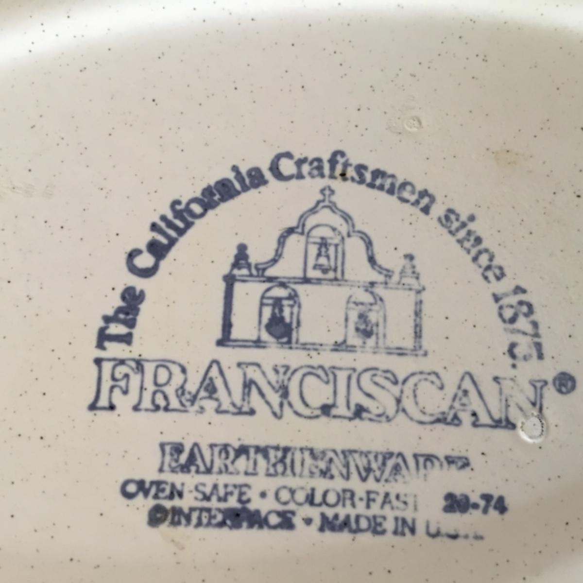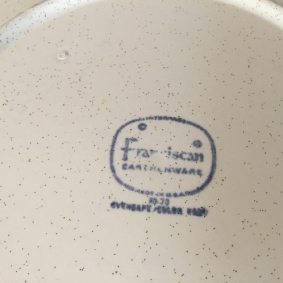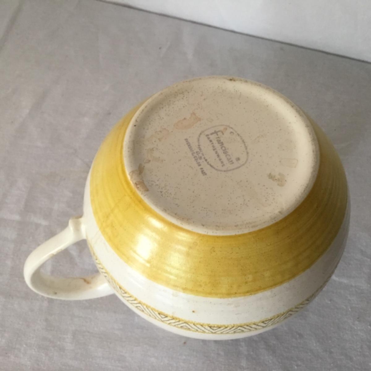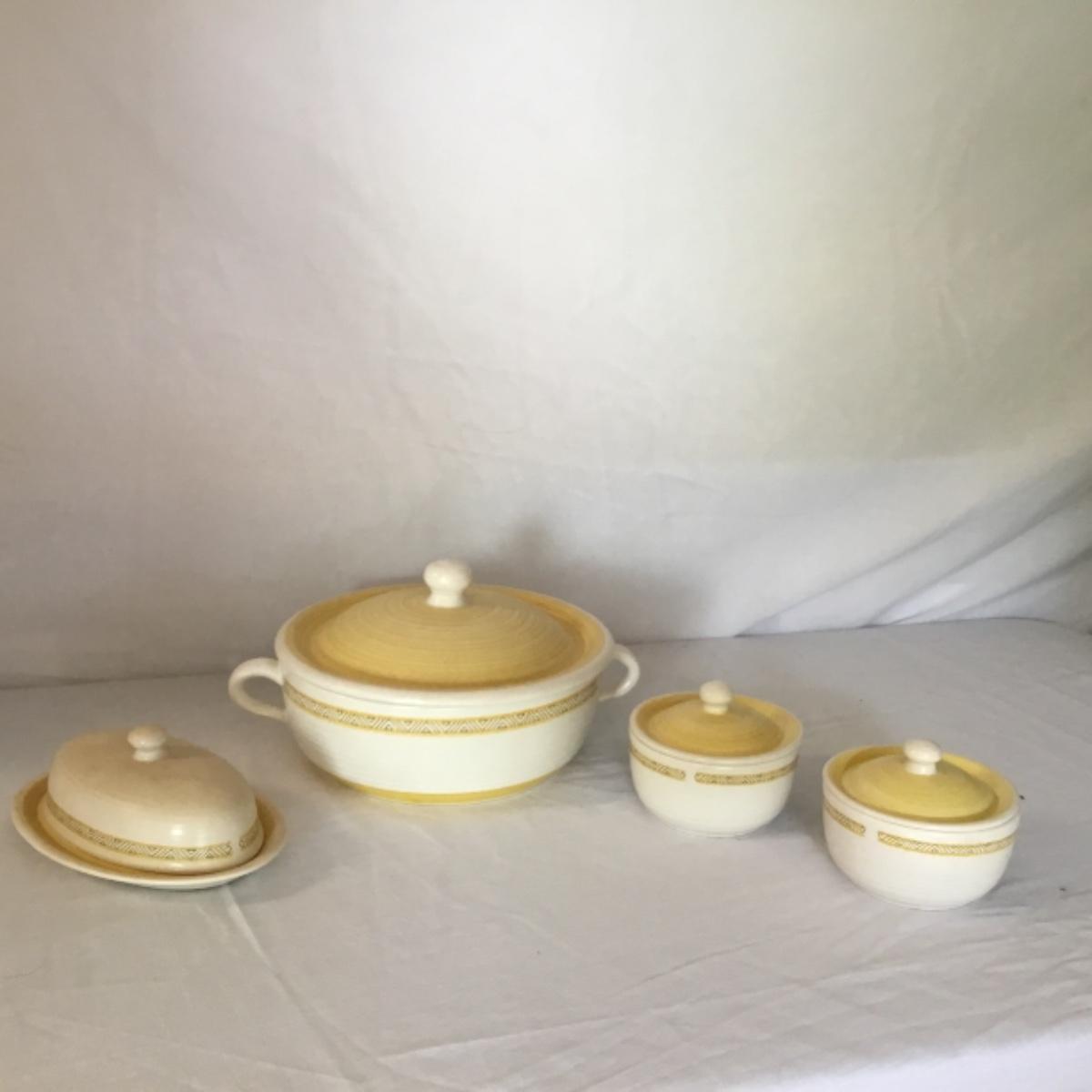 Adorable oven-safe Franciscan Earthware set will brighten and complete any kitchen! This lot includes 1 large bowl with a lid and handles, a diameter of 9.5", 2 smaller bowls with lids, and a butter dish with a lid. Bowls included in the lot are 1 large serving bowl, 4 large salad bowls, 3 medium/large bowls, 9 traditional cereal bowls with a diameter of 6.5" and 1 additional small bow. Plates in the lot include 2 serving platters that are 14" long, 15 dinner plates, 2 deeper serving plates that are NOT Franciscan but has similar design, 13 salad plates, and 24 teacup plates with diameters of 6.5". Lot includes tea/coffe items such as an 8.5" tall pitcher with handle and lid, 2 coffee mugs, and 17 teacups that have diameters of 4" and stand 3" tall. More pitchers without lids are included in this lot; 2 large that stands 8" tall, 1 medium, and 2 small pitchers. The last serving and hosting items in the lot are 2 chip & dip platters, 2 gravy bowls, and 4 salt and pepper shakers. The set is in fairly good condition considering age and use. See photos! Local pickup only.