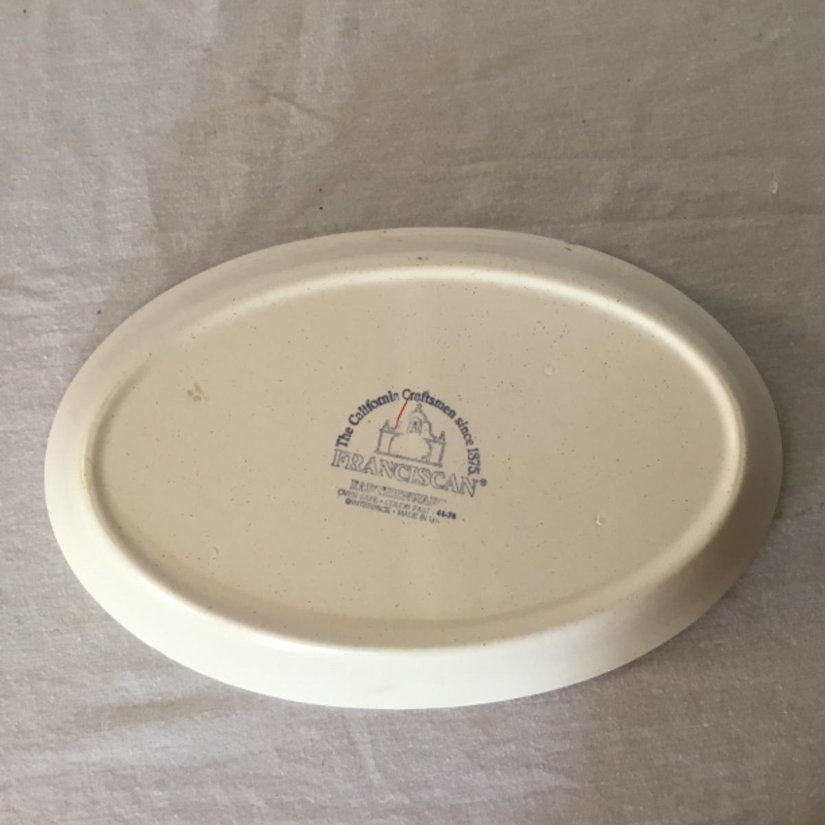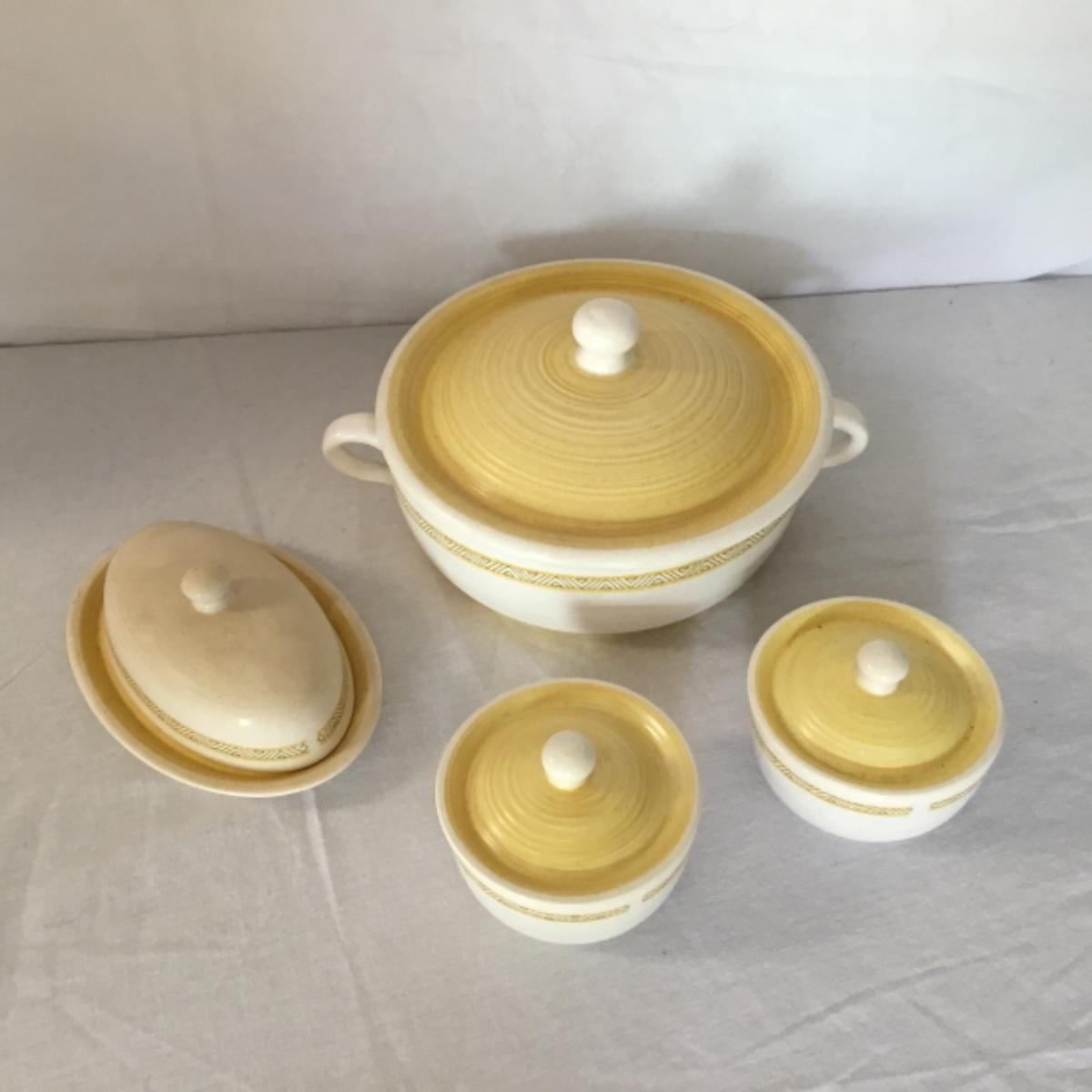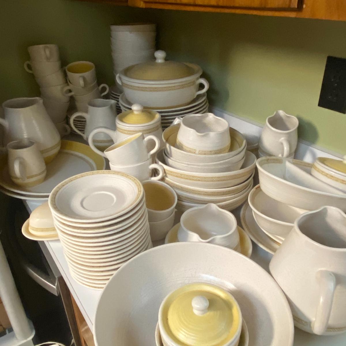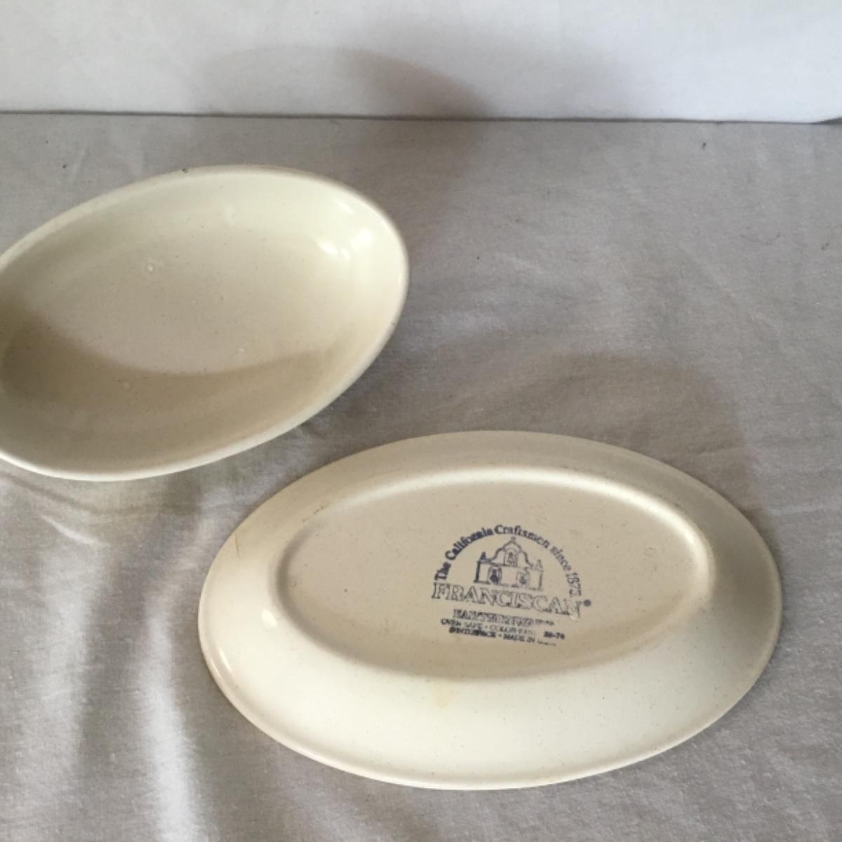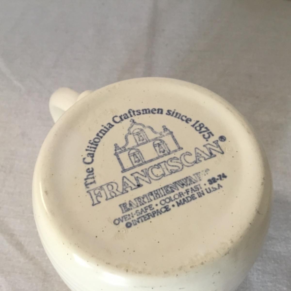 Adorable oven-safe Franciscan Earthware set will brighten and complete any kitchen! This lot includes 1 large bowl with a lid and handles, a diameter of 9.5", 2 smaller bowls with lids, and a butter dish with a lid. Bowls included in the lot are 1 large serving bowl, 4 large salad bowls, 3 medium/large bowls, 9 traditional cereal bowls with a diameter of 6.5" and 1 additional small bow. Plates in the lot include 2 serving platters that are 14" long, 15 dinner plates, 2 deeper serving plates that are NOT Franciscan but has similar design, 13 salad plates, and 24 teacup plates with diameters of 6.5". Lot includes tea/coffe items such as an 8.5" tall pitcher with handle and lid, 2 coffee mugs, and 17 teacups that have diameters of 4" and stand 3" tall. More pitchers without lids are included in this lot; 2 large that stands 8" tall, 1 medium, and 2 small pitchers. The last serving and hosting items in the lot are 2 chip & dip platters, 2 gravy bowls, and 4 salt and pepper shakers. The set is in fairly good condition considering age and use. See photos! Local pickup only.