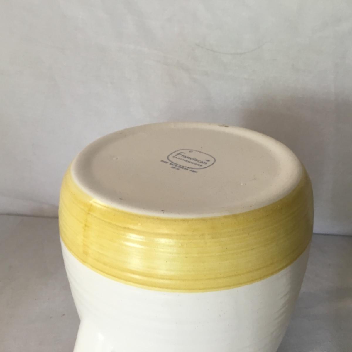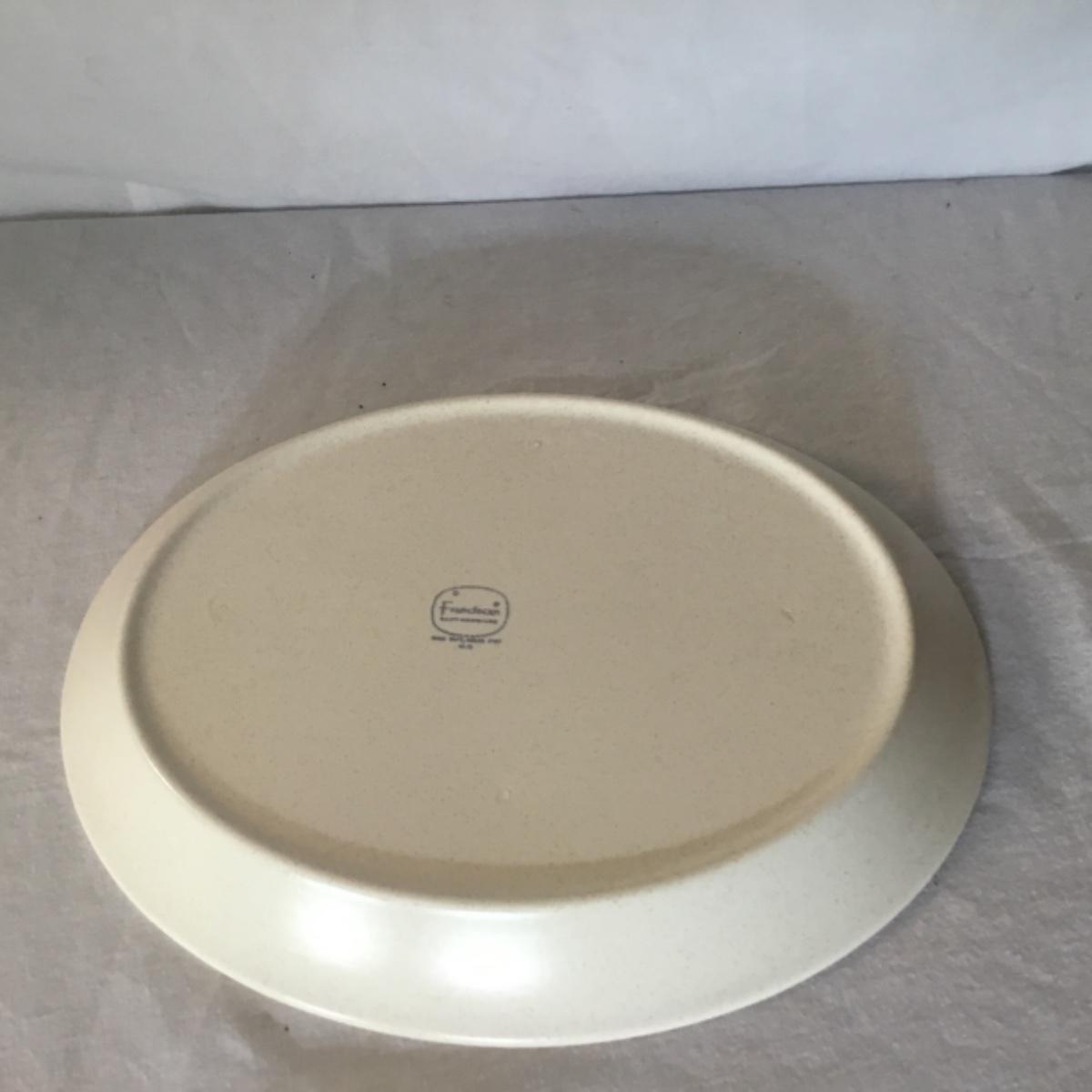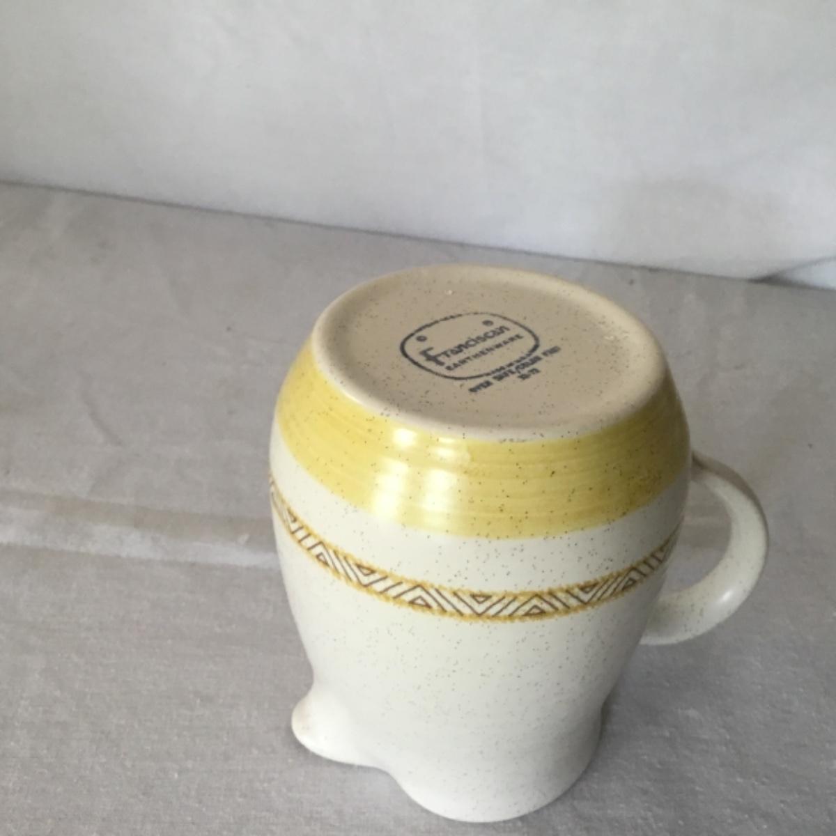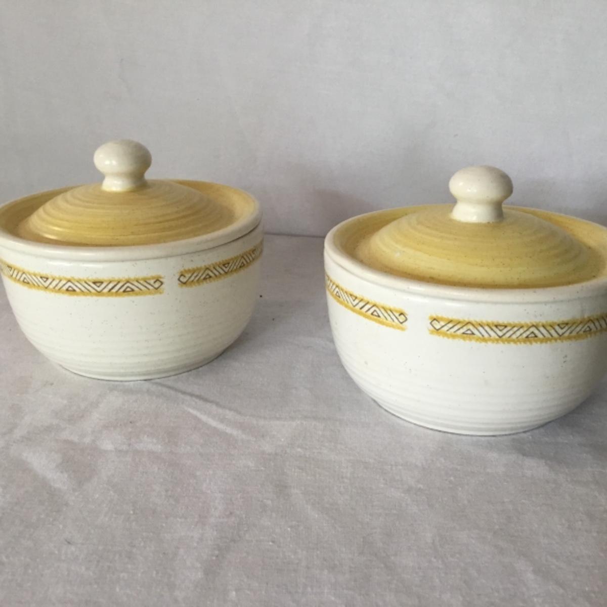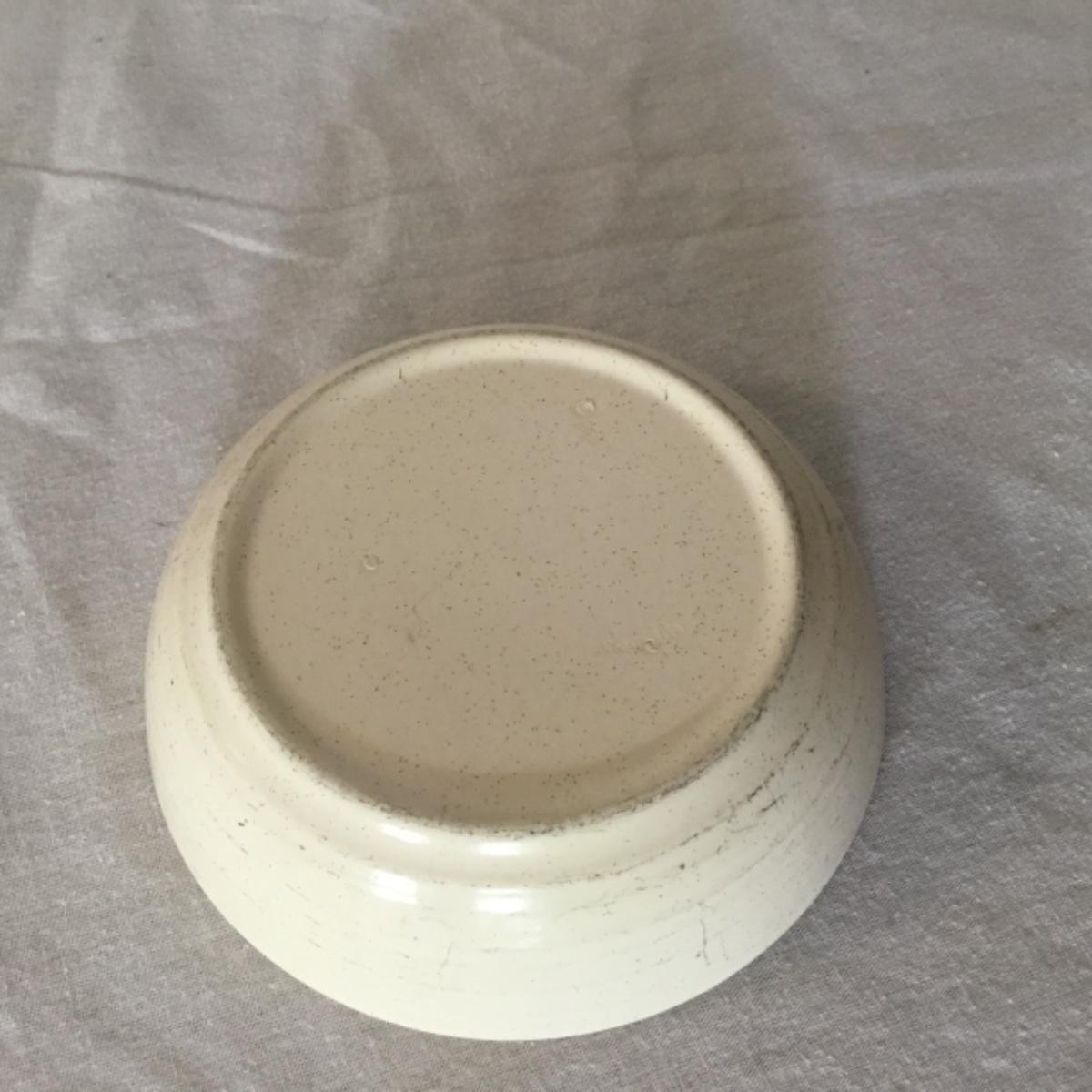 Adorable oven-safe Franciscan Earthware set will brighten and complete any kitchen! This lot includes 1 large bowl with a lid and handles, a diameter of 9.5", 2 smaller bowls with lids, and a butter dish with a lid. Bowls included in the lot are 1 large serving bowl, 4 large salad bowls, 3 medium/large bowls, 9 traditional cereal bowls with a diameter of 6.5" and 1 additional small bow. Plates in the lot include 2 serving platters that are 14" long, 15 dinner plates, 2 deeper serving plates that are NOT Franciscan but has similar design, 13 salad plates, and 24 teacup plates with diameters of 6.5". Lot includes tea/coffe items such as an 8.5" tall pitcher with handle and lid, 2 coffee mugs, and 17 teacups that have diameters of 4" and stand 3" tall. More pitchers without lids are included in this lot; 2 large that stands 8" tall, 1 medium, and 2 small pitchers. The last serving and hosting items in the lot are 2 chip & dip platters, 2 gravy bowls, and 4 salt and pepper shakers. The set is in fairly good condition considering age and use. See photos! Local pickup only.