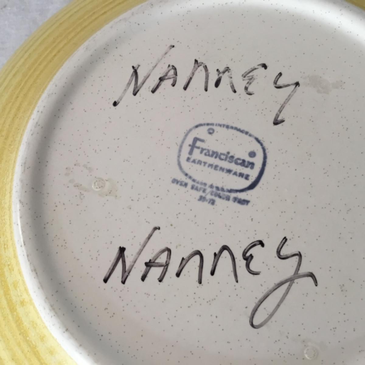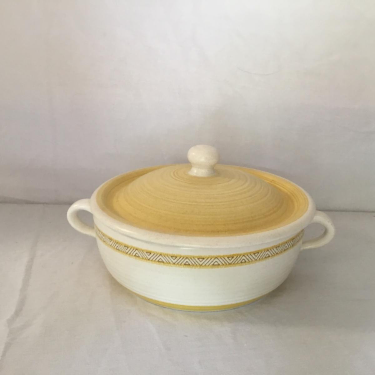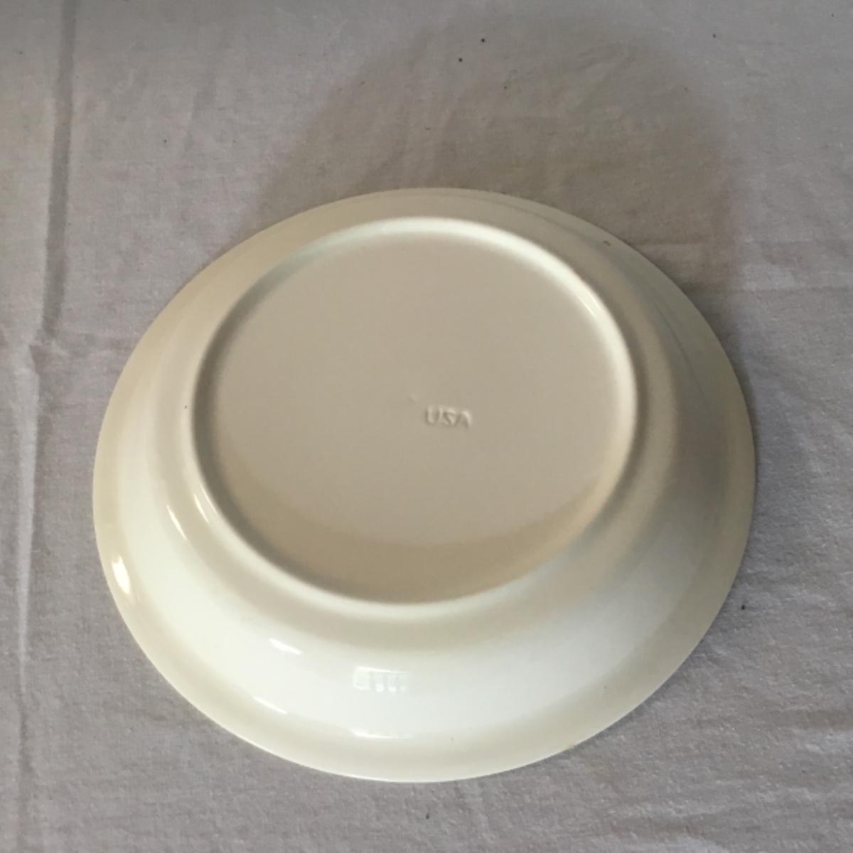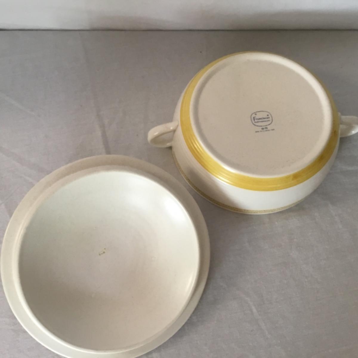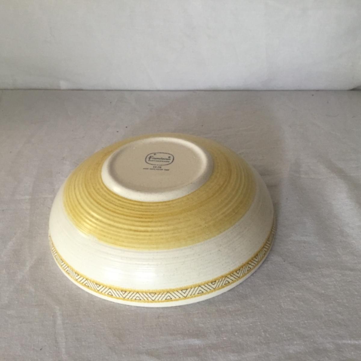 Adorable oven-safe Franciscan Earthware set will brighten and complete any kitchen! This lot includes 1 large bowl with a lid and handles, a diameter of 9.5", 2 smaller bowls with lids, and a butter dish with a lid. Bowls included in the lot are 1 large serving bowl, 4 large salad bowls, 3 medium/large bowls, 9 traditional cereal bowls with a diameter of 6.5" and 1 additional small bow. Plates in the lot include 2 serving platters that are 14" long, 15 dinner plates, 2 deeper serving plates that are NOT Franciscan but has similar design, 13 salad plates, and 24 teacup plates with diameters of 6.5". Lot includes tea/coffe items such as an 8.5" tall pitcher with handle and lid, 2 coffee mugs, and 17 teacups that have diameters of 4" and stand 3" tall. More pitchers without lids are included in this lot; 2 large that stands 8" tall, 1 medium, and 2 small pitchers. The last serving and hosting items in the lot are 2 chip & dip platters, 2 gravy bowls, and 4 salt and pepper shakers. The set is in fairly good condition considering age and use. See photos! Local pickup only.