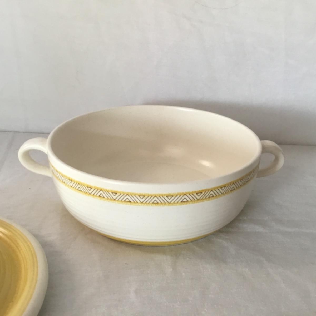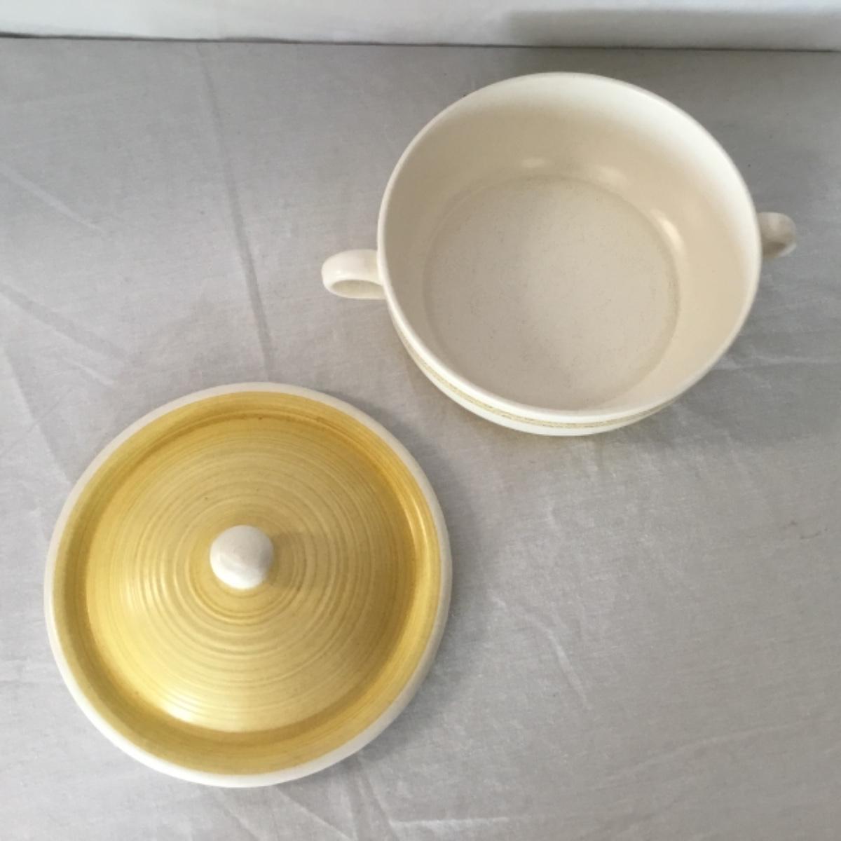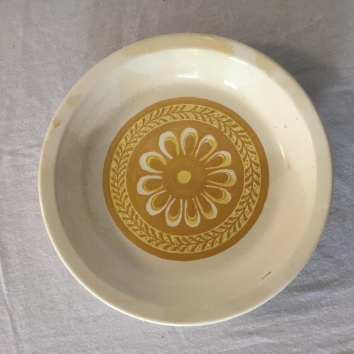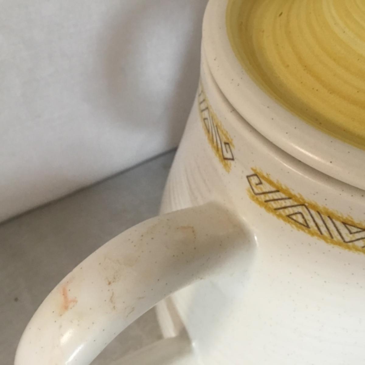 Adorable oven-safe Franciscan Earthware set will brighten and complete any kitchen! This lot includes 1 large bowl with a lid and handles, a diameter of 9.5", 2 smaller bowls with lids, and a butter dish with a lid. Bowls included in the lot are 1 large serving bowl, 4 large salad bowls, 3 medium/large bowls, 9 traditional cereal bowls with a diameter of 6.5" and 1 additional small bow. Plates in the lot include 2 serving platters that are 14" long, 15 dinner plates, 2 deeper serving plates that are NOT Franciscan but has similar design, 13 salad plates, and 24 teacup plates with diameters of 6.5". Lot includes tea/coffe items such as an 8.5" tall pitcher with handle and lid, 2 coffee mugs, and 17 teacups that have diameters of 4" and stand 3" tall. More pitchers without lids are included in this lot; 2 large that stands 8" tall, 1 medium, and 2 small pitchers. The last serving and hosting items in the lot are 2 chip & dip platters, 2 gravy bowls, and 4 salt and pepper shakers. The set is in fairly good condition considering age and use. See photos! Local pickup only.