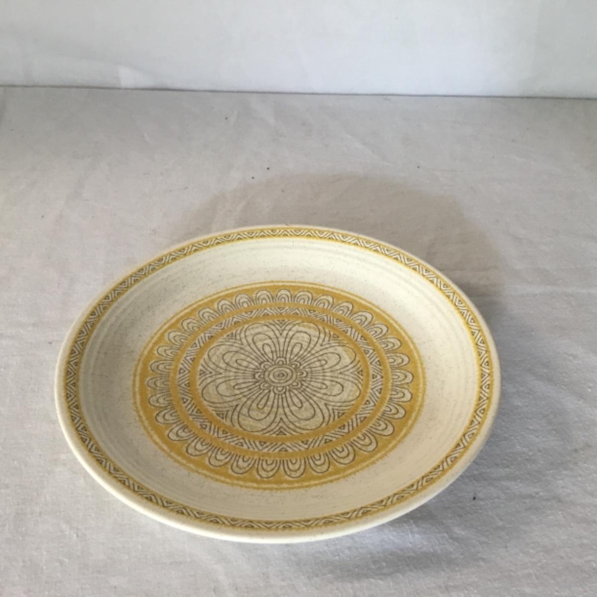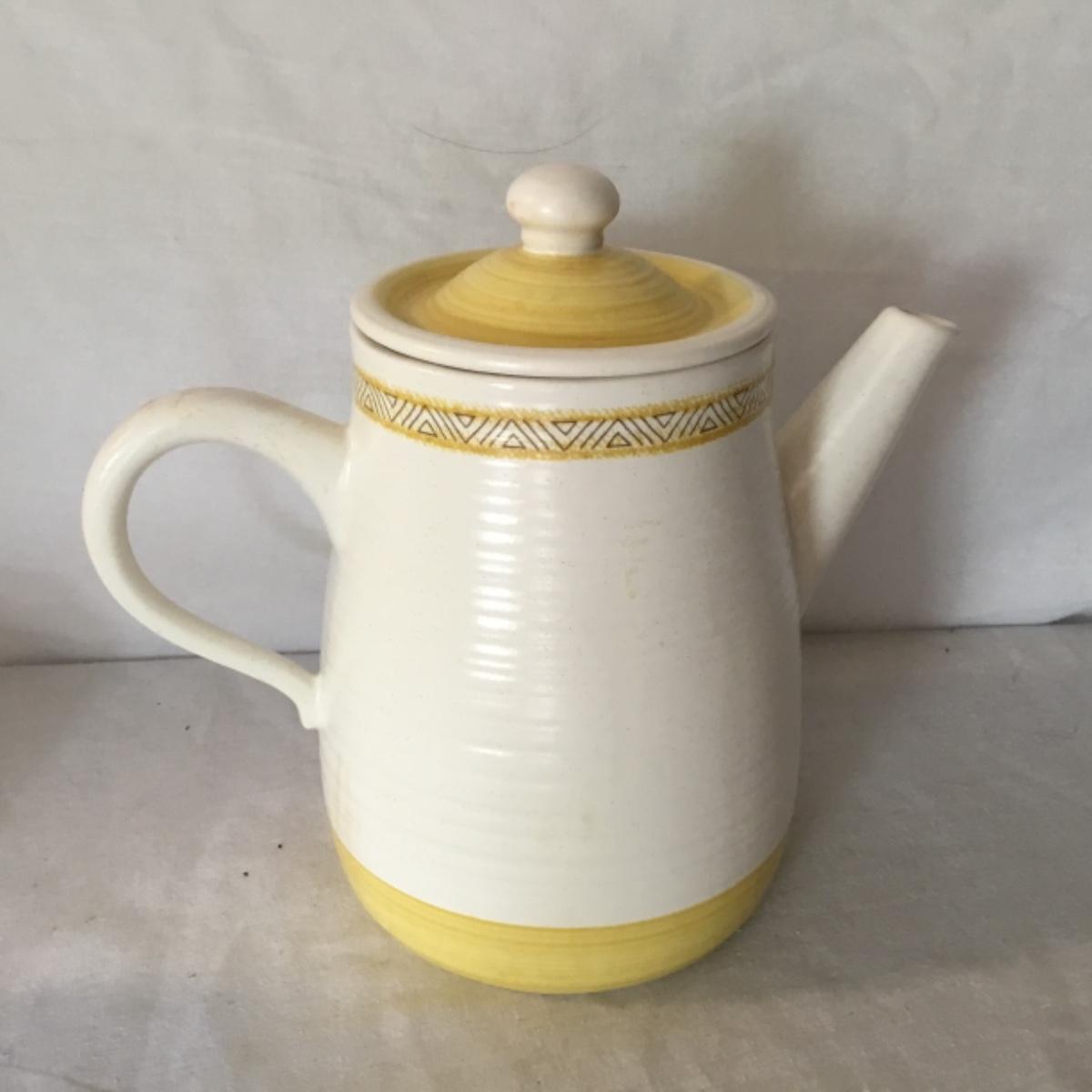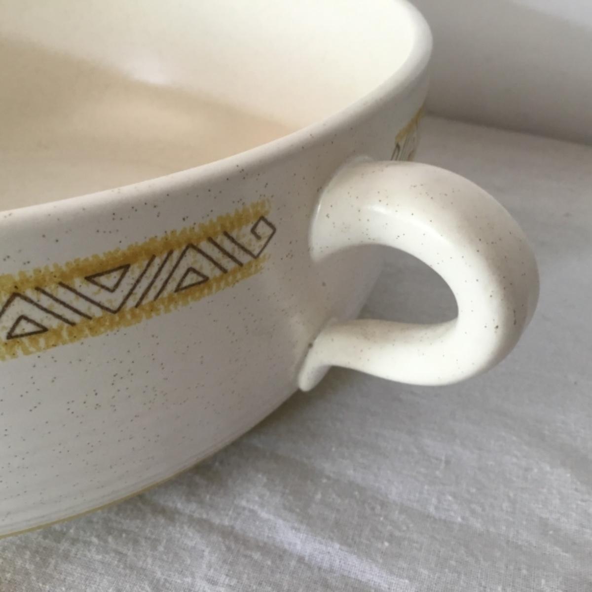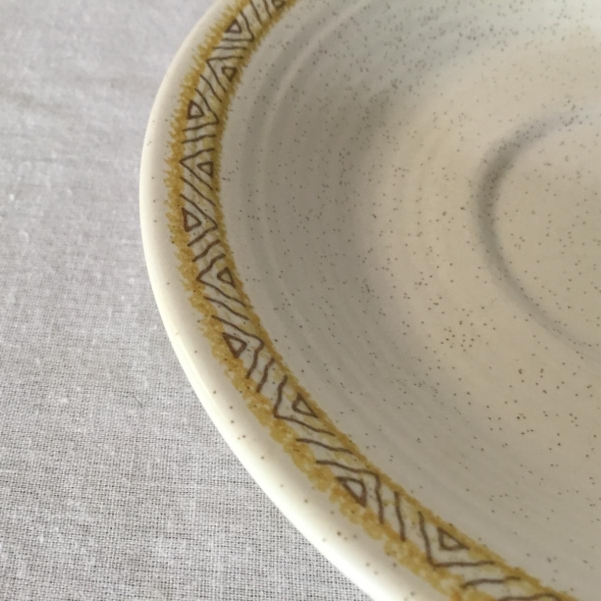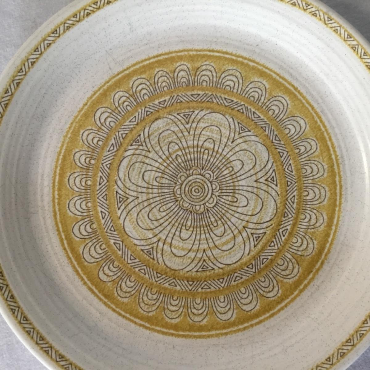 Adorable oven-safe Franciscan Earthware set will brighten and complete any kitchen! This lot includes 1 large bowl with a lid and handles, a diameter of 9.5", 2 smaller bowls with lids, and a butter dish with a lid. Bowls included in the lot are 1 large serving bowl, 4 large salad bowls, 3 medium/large bowls, 9 traditional cereal bowls with a diameter of 6.5" and 1 additional small bow. Plates in the lot include 2 serving platters that are 14" long, 15 dinner plates, 2 deeper serving plates that are NOT Franciscan but has similar design, 13 salad plates, and 24 teacup plates with diameters of 6.5". Lot includes tea/coffe items such as an 8.5" tall pitcher with handle and lid, 2 coffee mugs, and 17 teacups that have diameters of 4" and stand 3" tall. More pitchers without lids are included in this lot; 2 large that stands 8" tall, 1 medium, and 2 small pitchers. The last serving and hosting items in the lot are 2 chip & dip platters, 2 gravy bowls, and 4 salt and pepper shakers. The set is in fairly good condition considering age and use. See photos! Local pickup only.