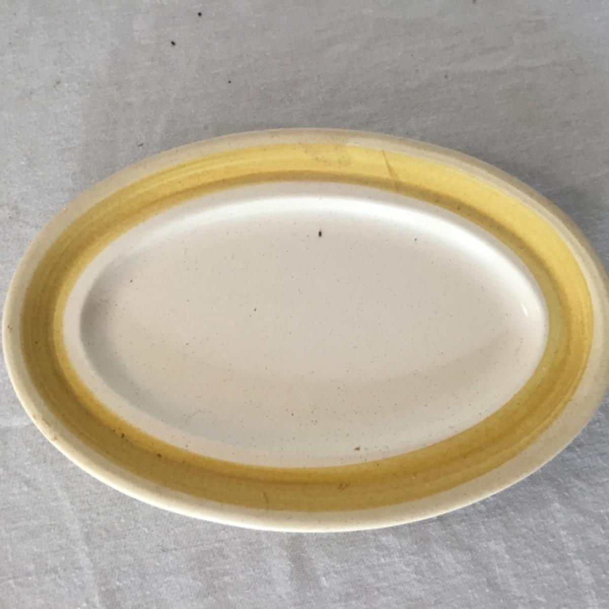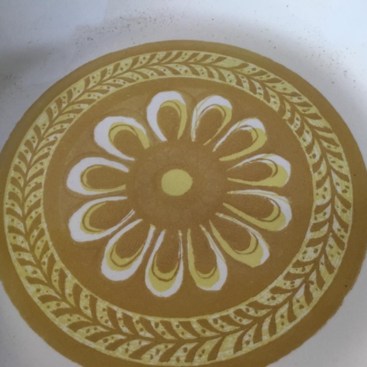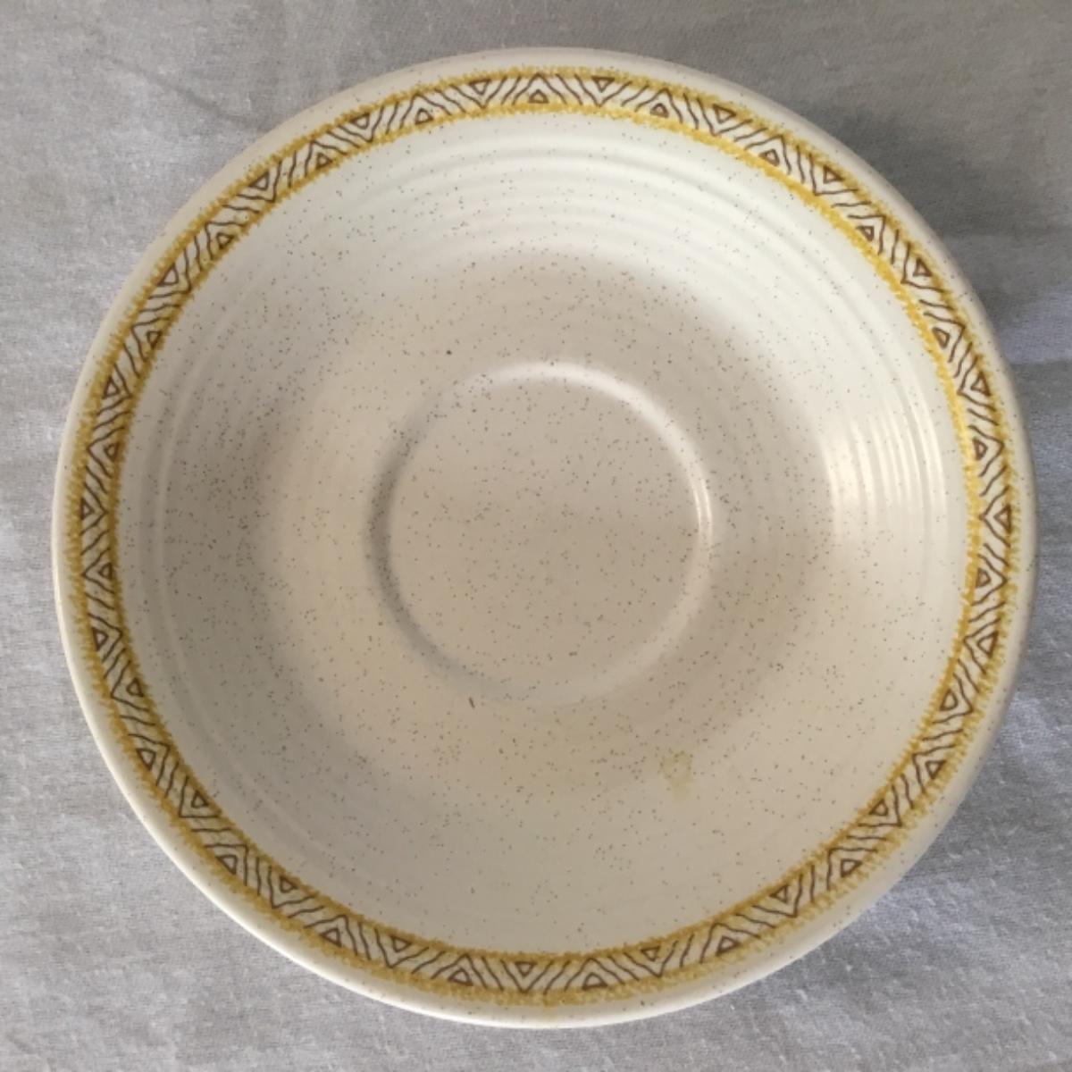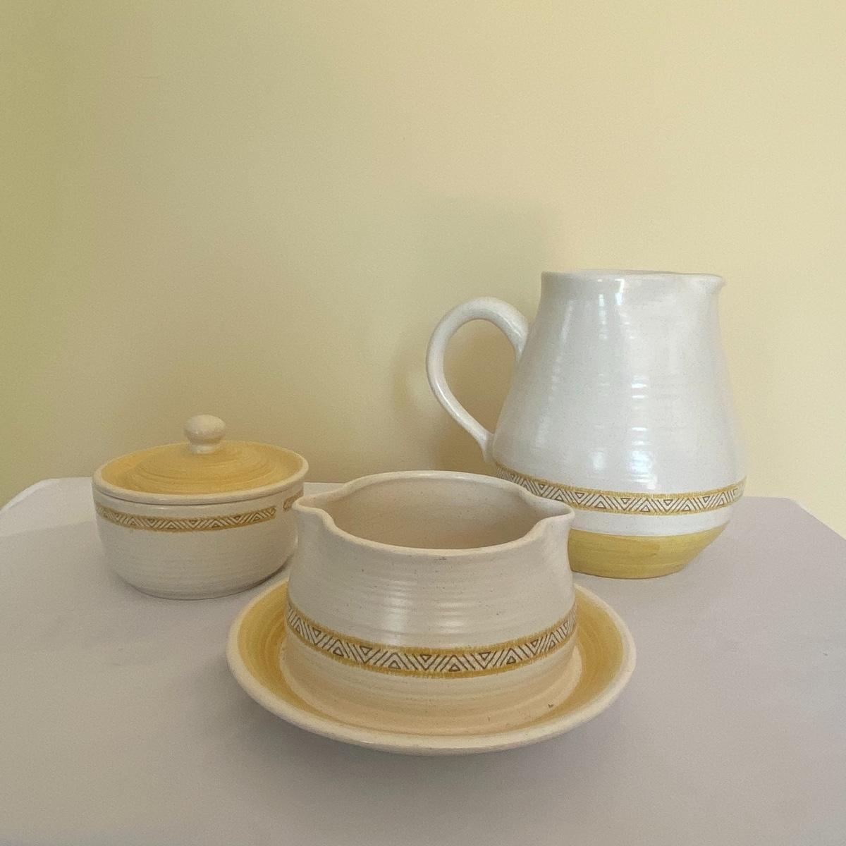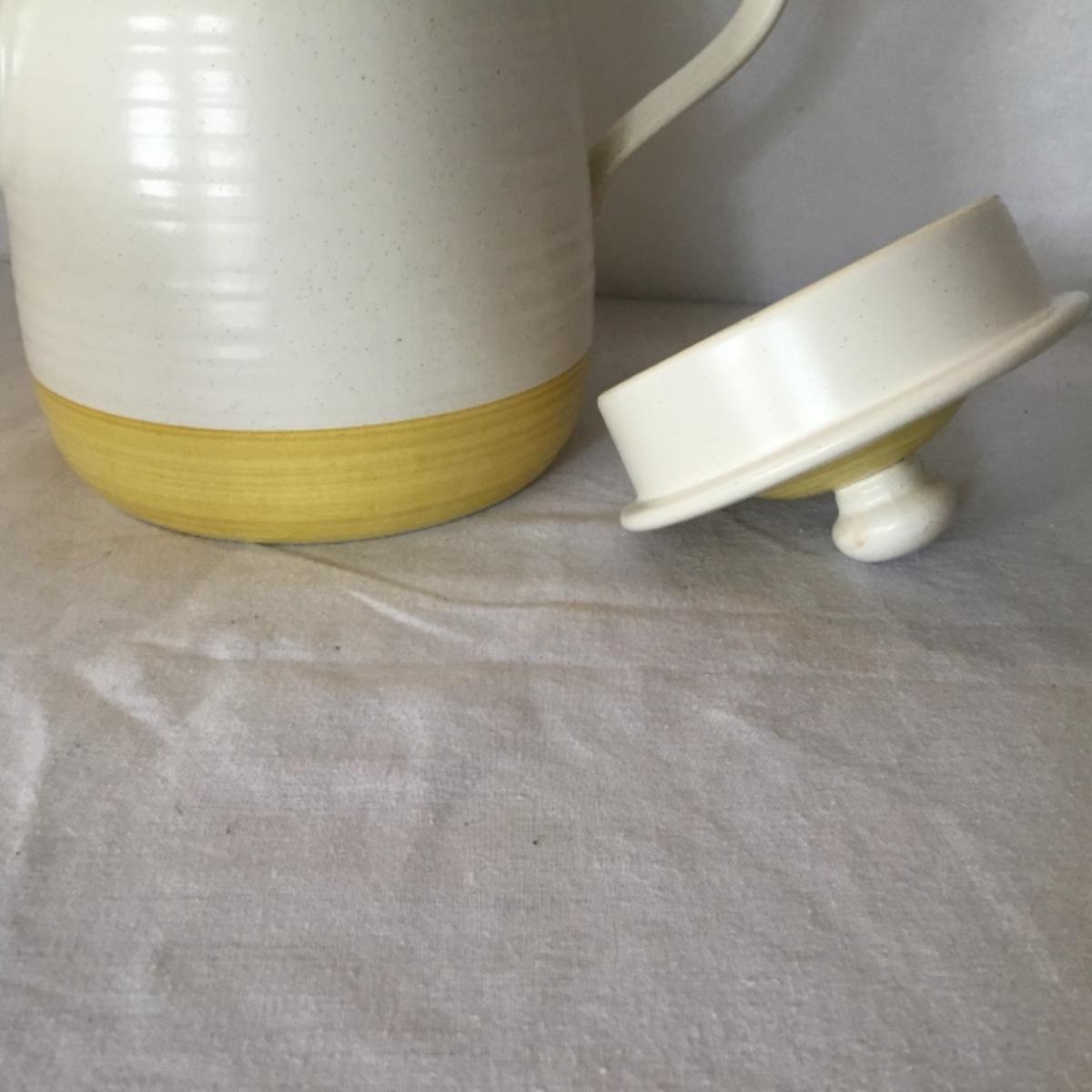 Adorable oven-safe Franciscan Earthware set will brighten and complete any kitchen! This lot includes 1 large bowl with a lid and handles, a diameter of 9.5", 2 smaller bowls with lids, and a butter dish with a lid. Bowls included in the lot are 1 large serving bowl, 4 large salad bowls, 3 medium/large bowls, 9 traditional cereal bowls with a diameter of 6.5" and 1 additional small bow. Plates in the lot include 2 serving platters that are 14" long, 15 dinner plates, 2 deeper serving plates that are NOT Franciscan but has similar design, 13 salad plates, and 24 teacup plates with diameters of 6.5". Lot includes tea/coffe items such as an 8.5" tall pitcher with handle and lid, 2 coffee mugs, and 17 teacups that have diameters of 4" and stand 3" tall. More pitchers without lids are included in this lot; 2 large that stands 8" tall, 1 medium, and 2 small pitchers. The last serving and hosting items in the lot are 2 chip & dip platters, 2 gravy bowls, and 4 salt and pepper shakers. The set is in fairly good condition considering age and use. See photos! Local pickup only.