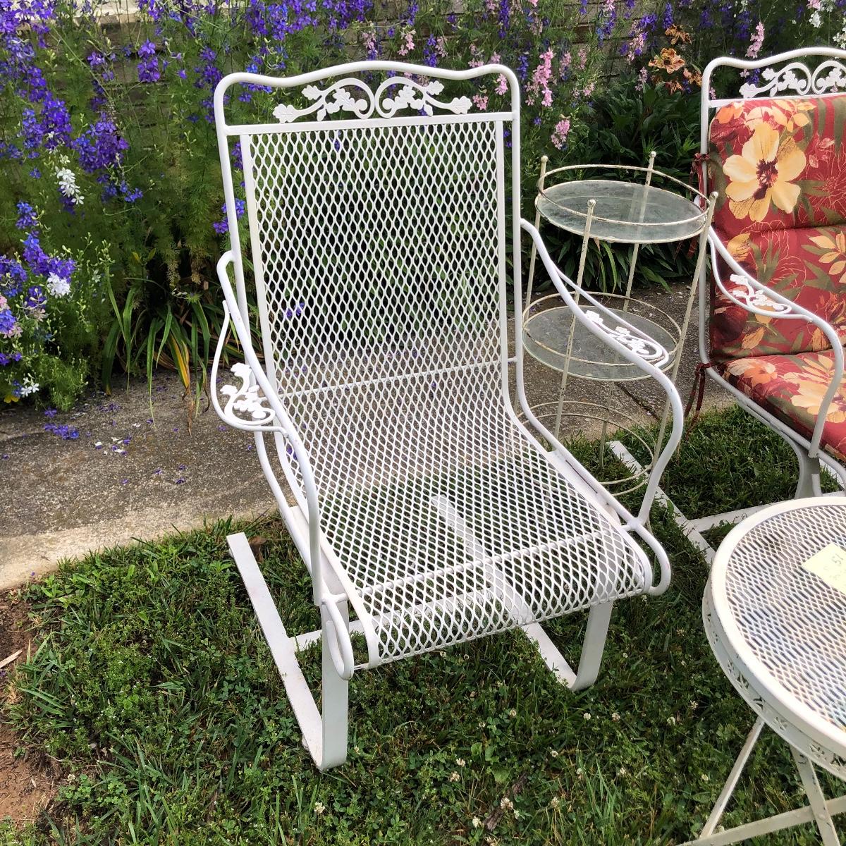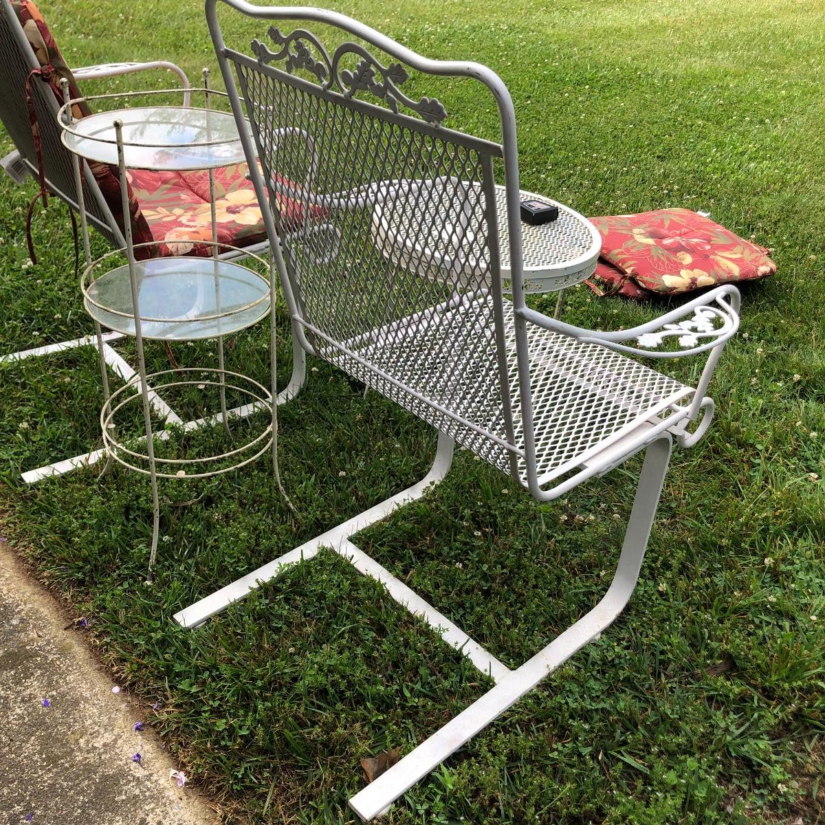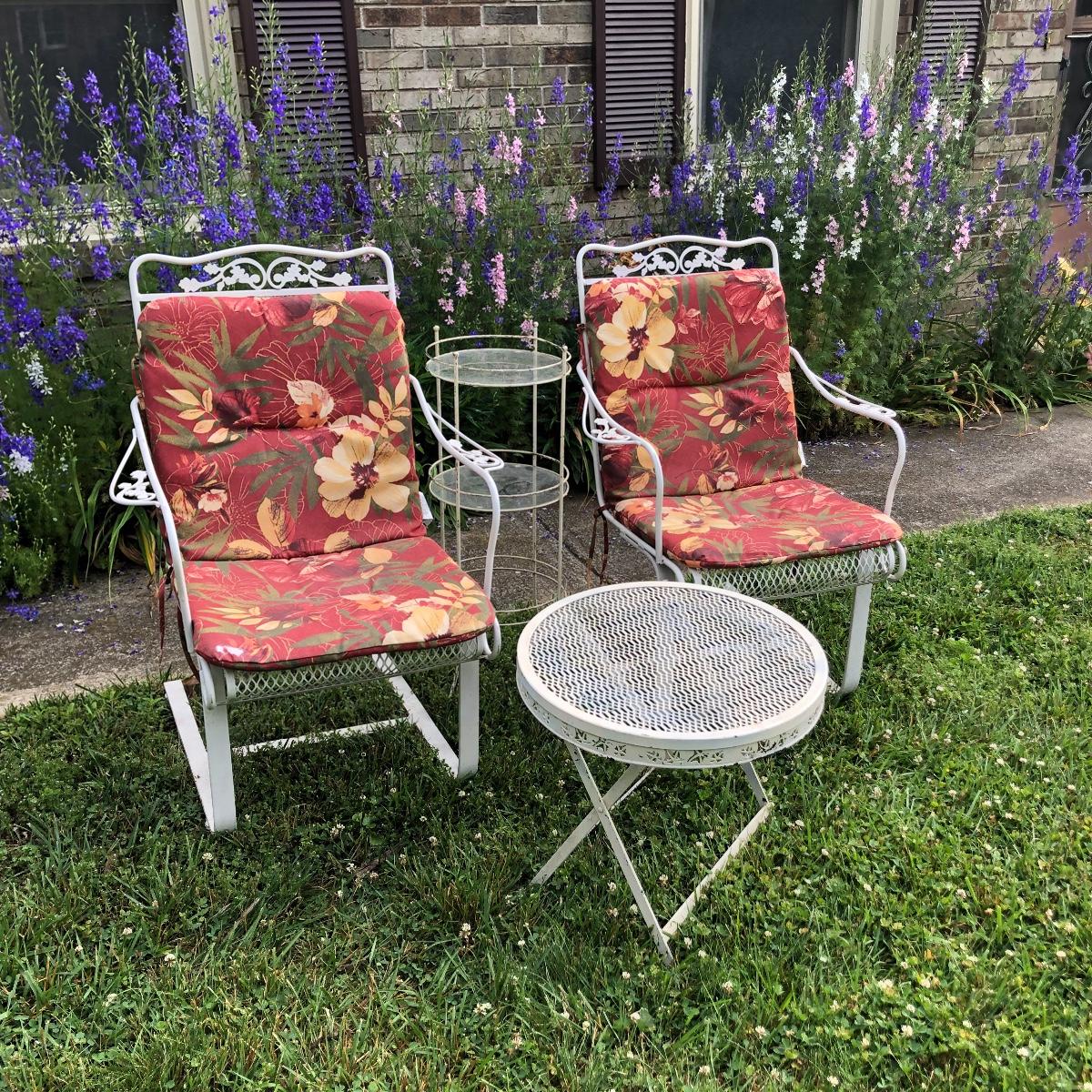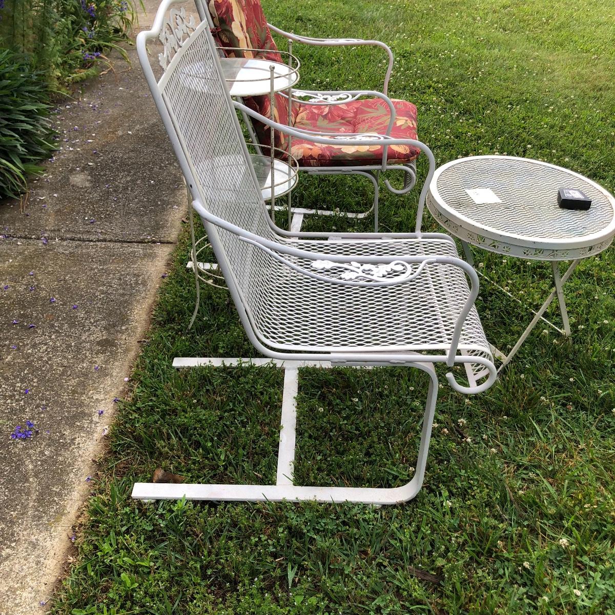 Two matching rocker chairs, a small table and plant stand are in this lot. All items have that attractive aged vintage look that can be repainted if you prefer a newer look. All pieces are metal with some chipped paint but no rust. The two floral chair cushions are included. The plant stand is missing one of its 3 glass inserts.