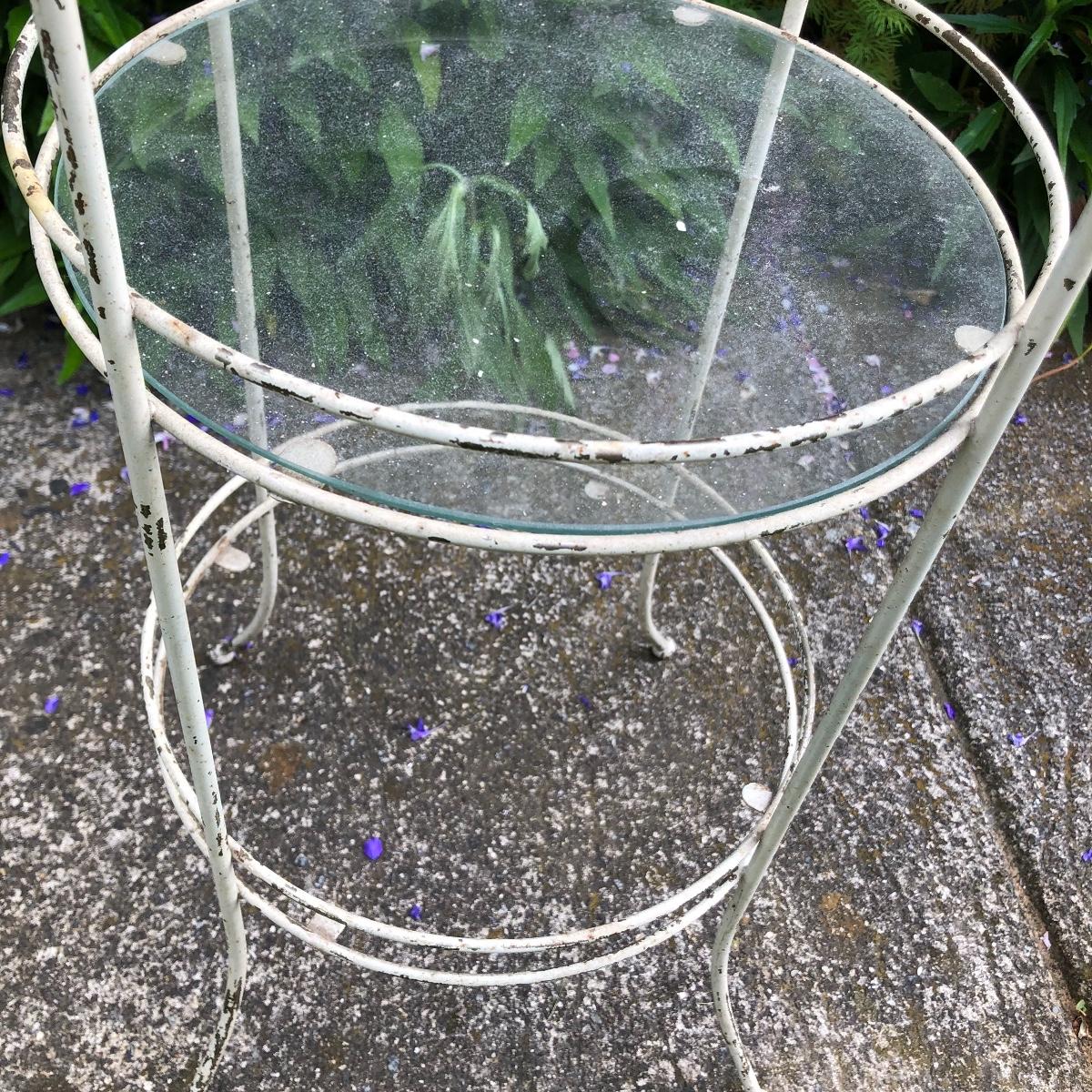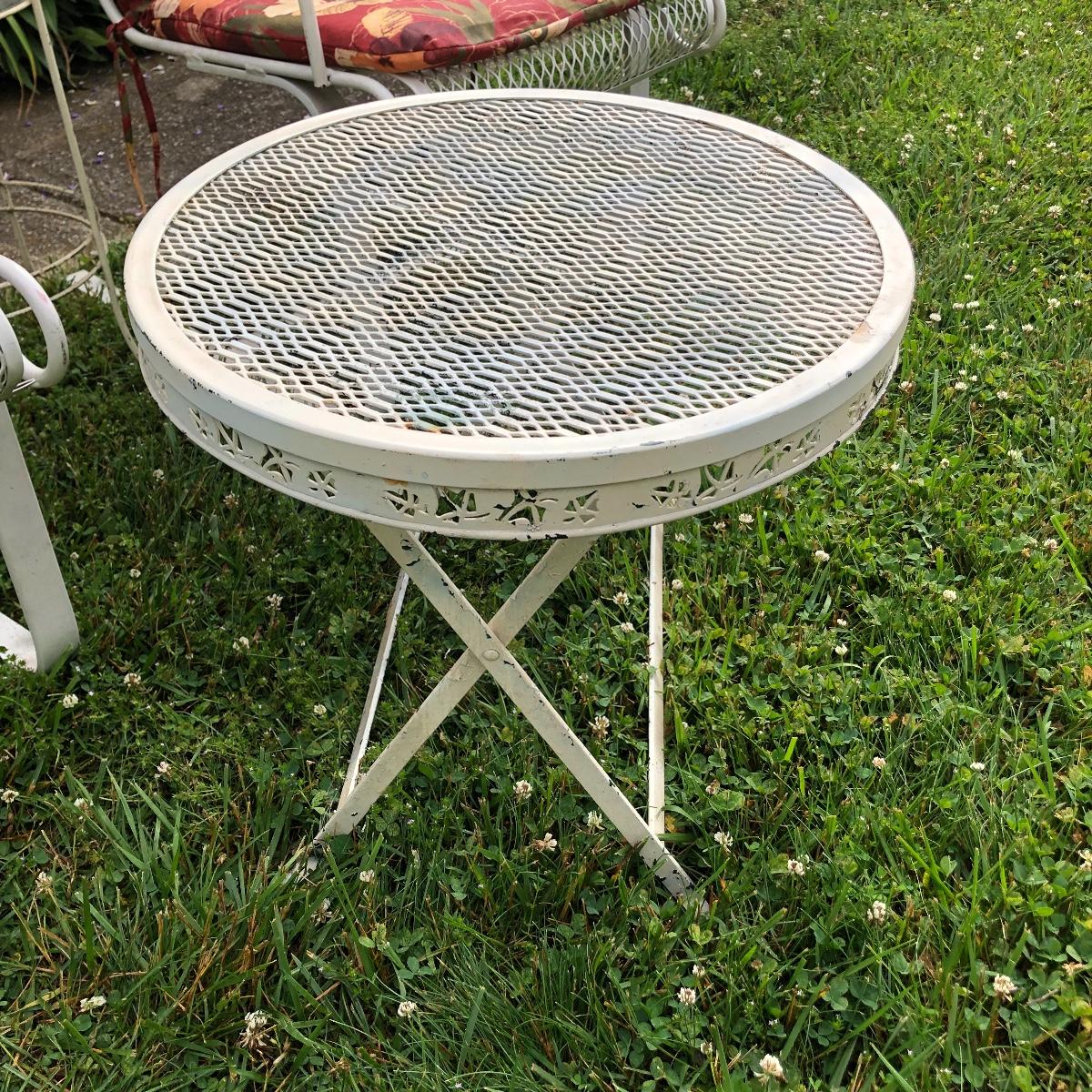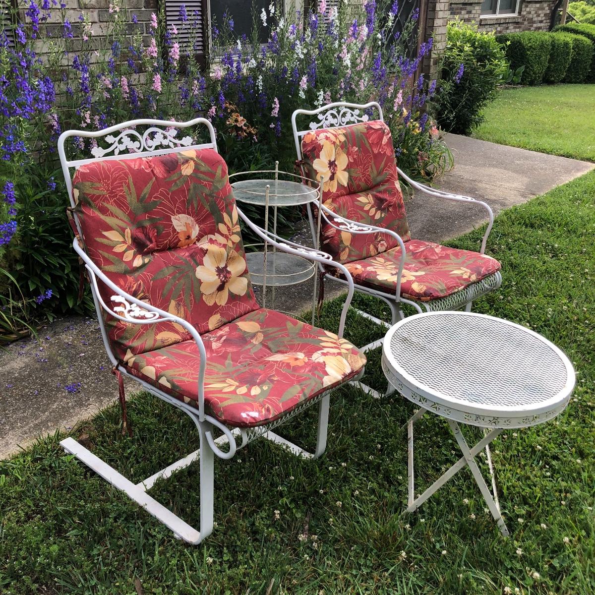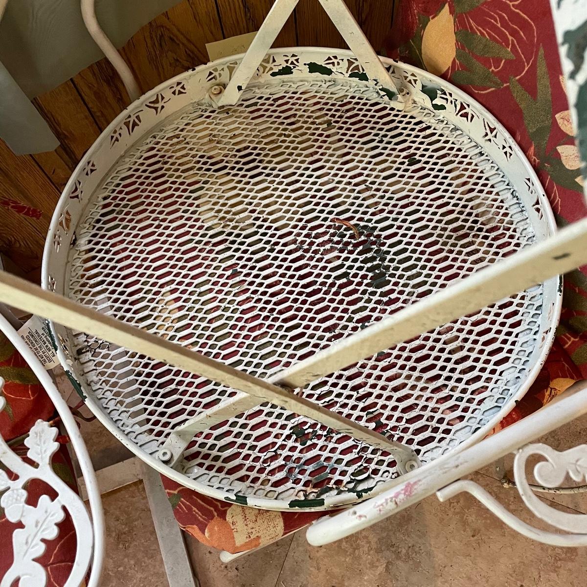 Two matching rocker chairs, a small table and plant stand are in this lot. All items have that attractive aged vintage look that can be repainted if you prefer a newer look. All pieces are metal with some chipped paint but no rust. The two floral chair cushions are included. The plant stand is missing one of its 3 glass inserts.
