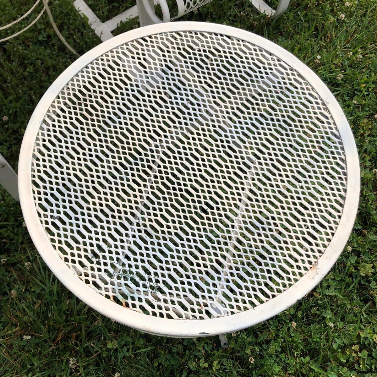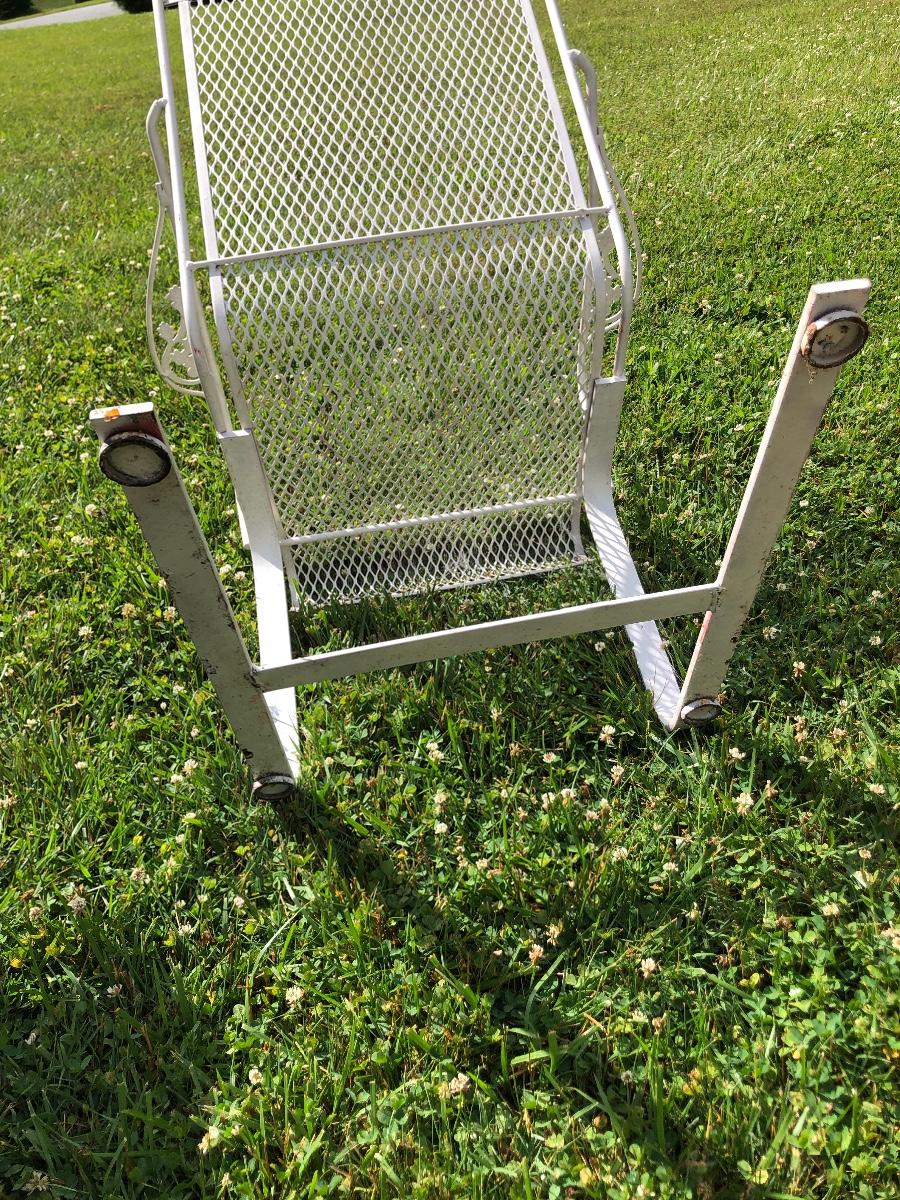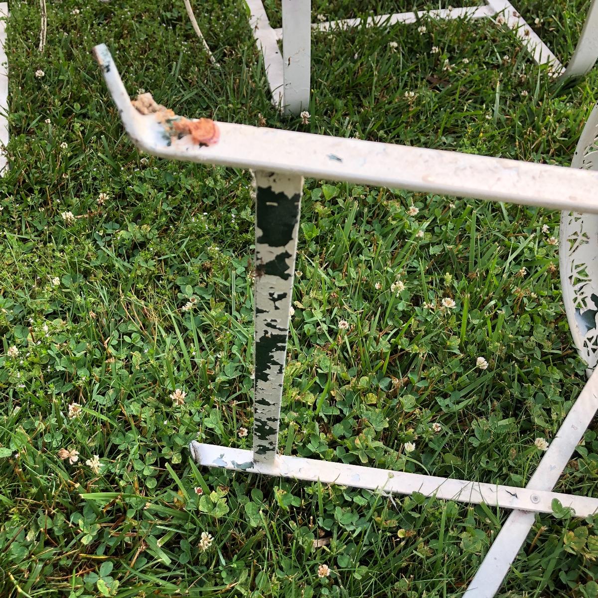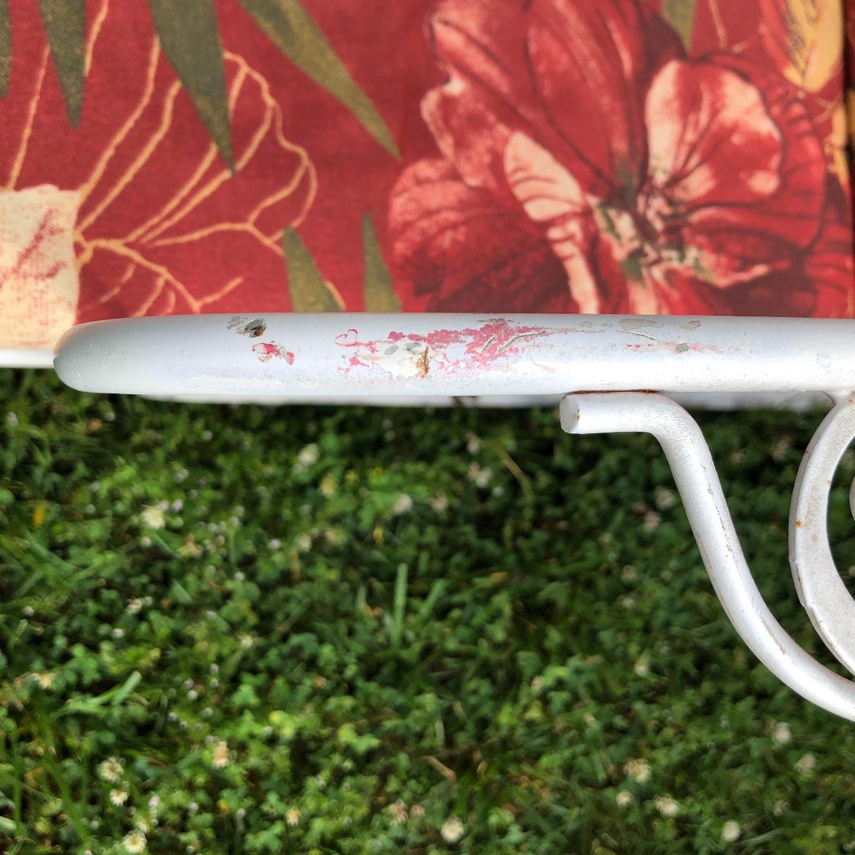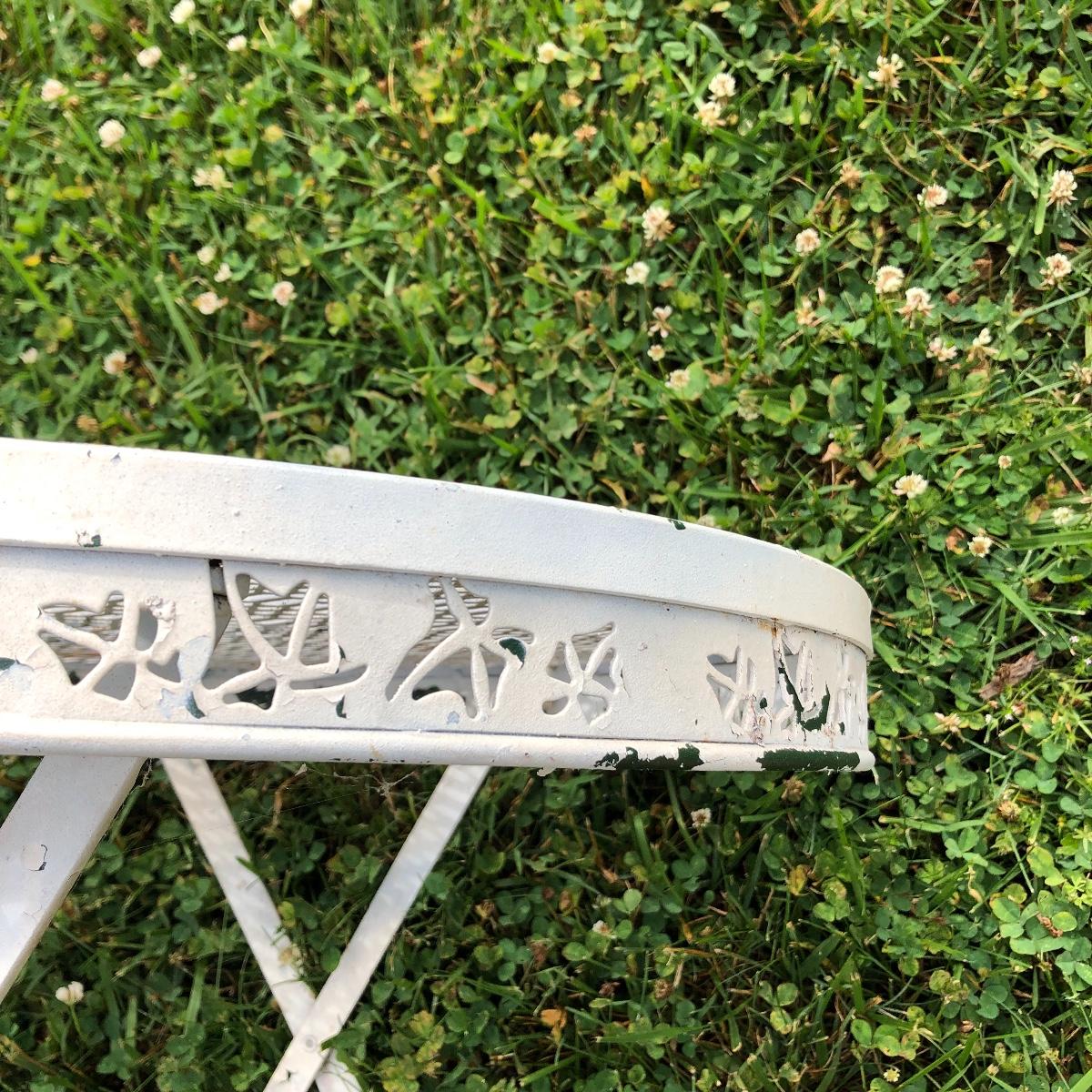Two matching rocker chairs, a small table and plant stand are in this lot. All items have that attractive aged vintage look that can be repainted if you prefer a newer look. All pieces are metal with some chipped paint but no rust. The two floral chair cushions are included. The plant stand is missing one of its 3 glass inserts.