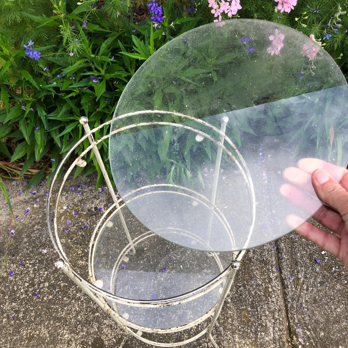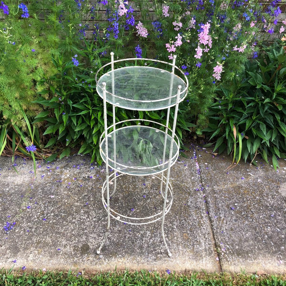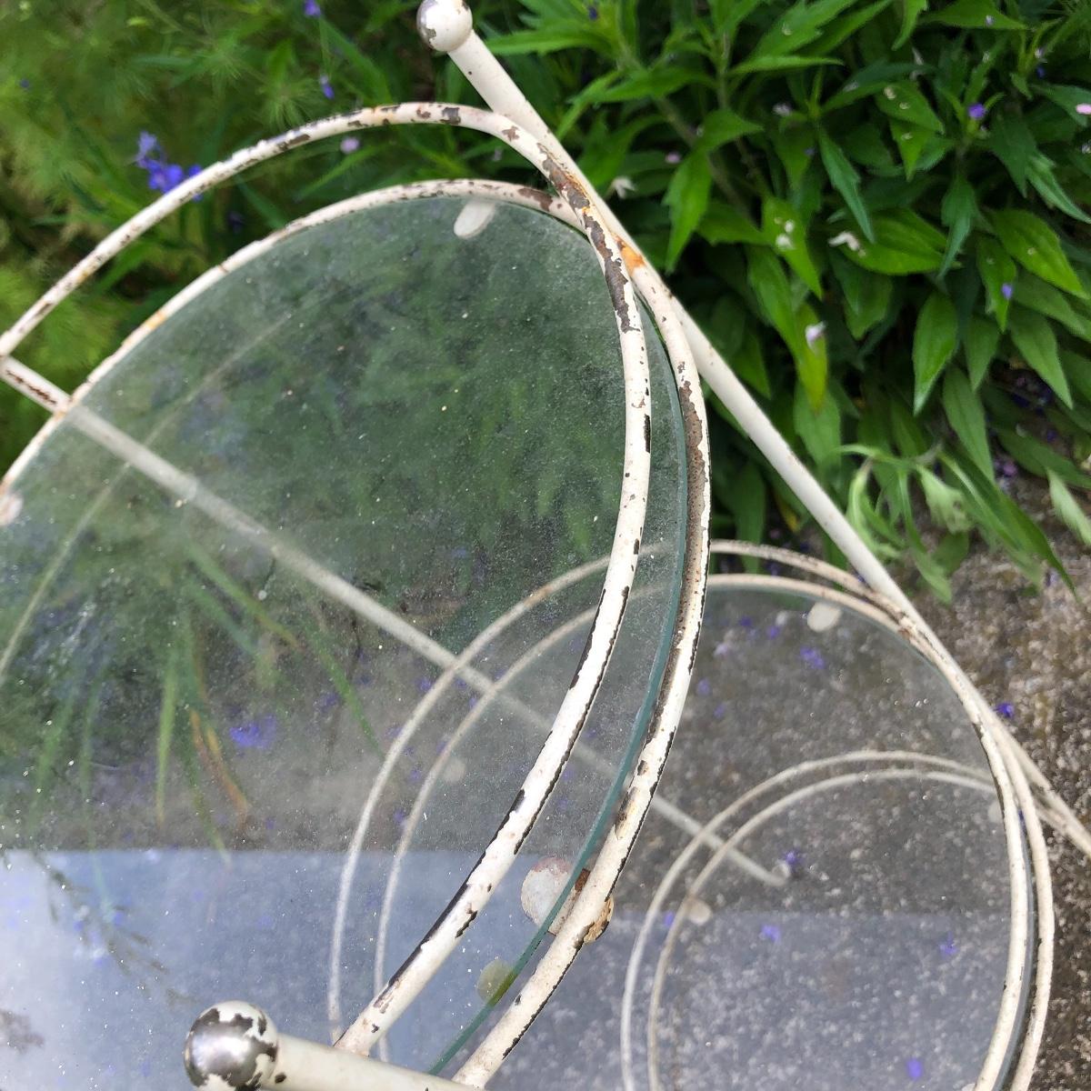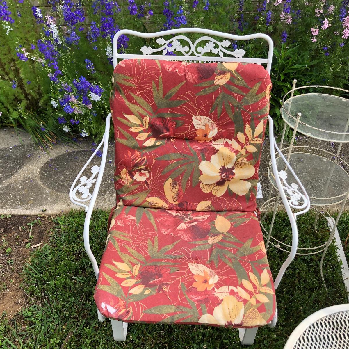 Two matching rocker chairs, a small table and plant stand are in this lot. All items have that attractive aged vintage look that can be repainted if you prefer a newer look. All pieces are metal with some chipped paint but no rust. The two floral chair cushions are included. The plant stand is missing one of its 3 glass inserts.