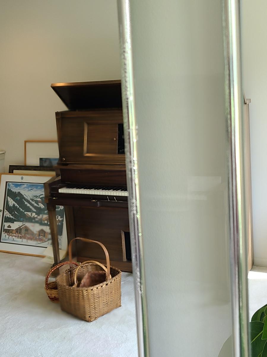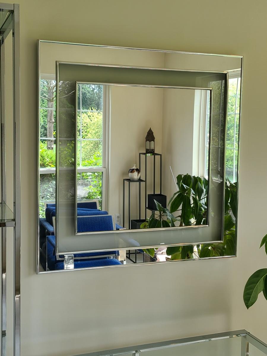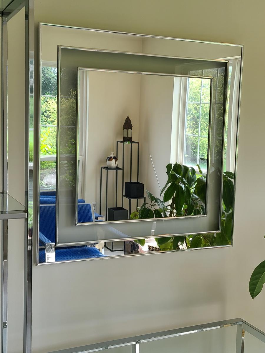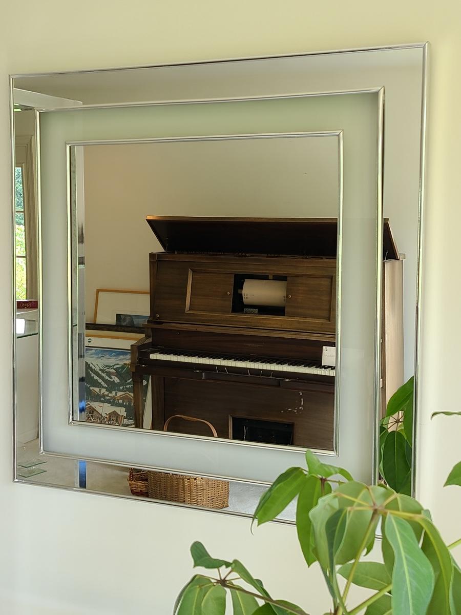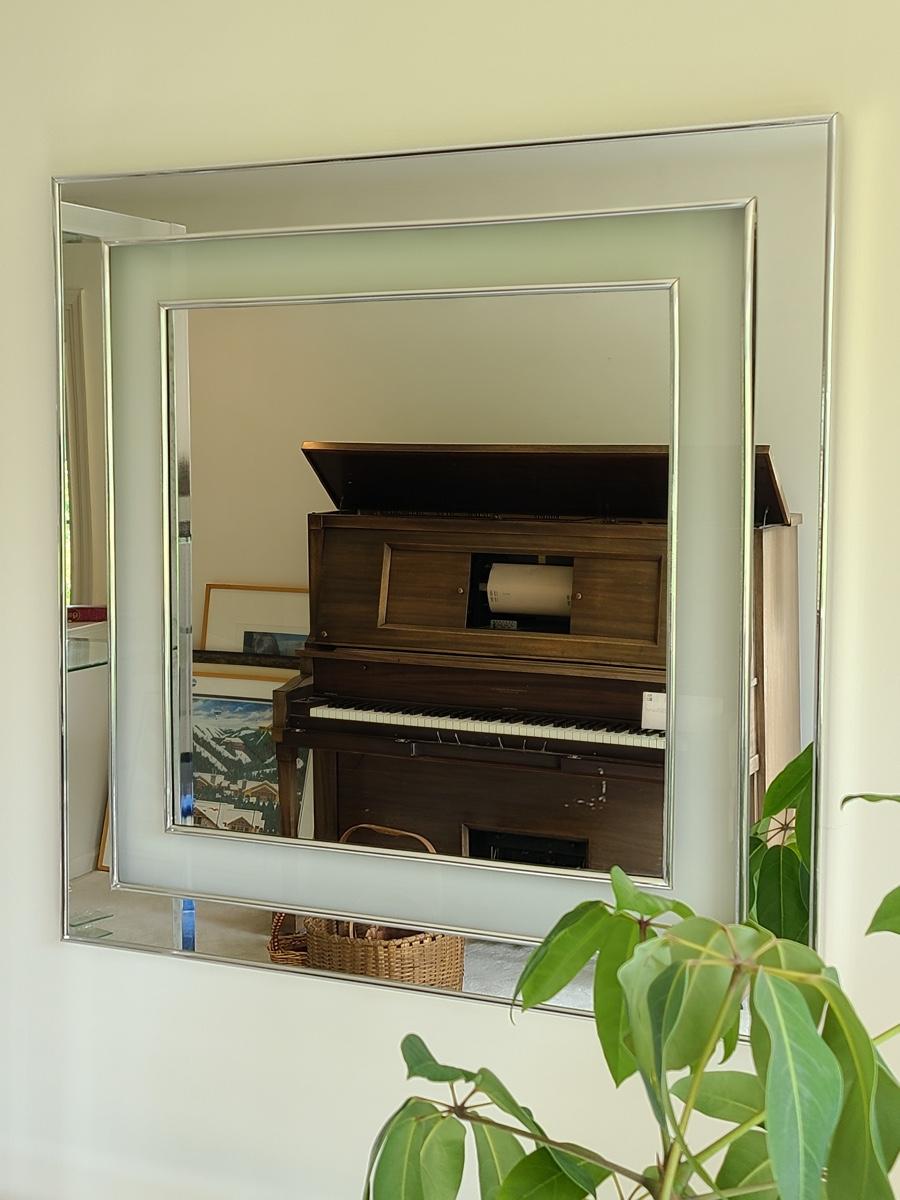 30x30 inches. This vintage mirror has chrome accents and matched the set in the livingroom. It does show some minor wear, and needs a small glue repair where the edge is coming up, a two second fix. Great design! Please see all pictures for content of the lot, condition of the lot, and measurements if taken. Pictures are the best representation of the items listed and items are untested unless indicated in description. Thank you for looking and have fun bidding![