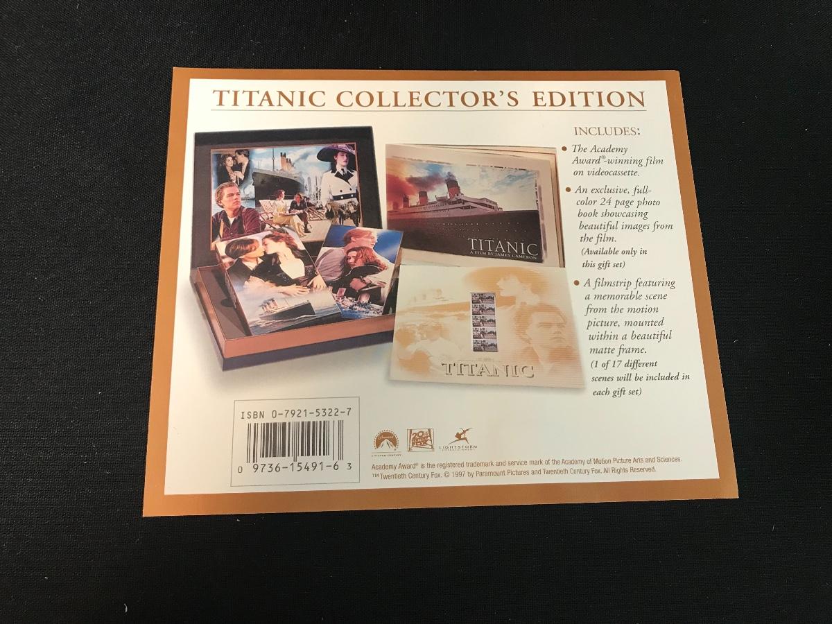 Titanic VHS Collector’s Edition - Sealed Tapes, Collectibles - Package includes a two-VHS tape version of the movie, which are still sealed in their boxes, a photo booklet and a matte-framed strip of cells from the film. Case is unsealed and shows some shelf wear. Please see all pictures as they are the best representation of the items. The pictures show condition, measurements if taken, and what is included in the lot. Due to the large amount that we photograph and the time frame, we are not always able to take measurements. All items unless noted, are pre-owned and have been used. If you purchased furniture, you must bring help. We do not allow one person to carry large furniture out on their own. Bring help, tools and a truck for the safety of our client’s homes, and your personal safety. Company policy. Thank you.