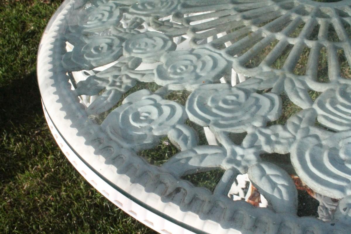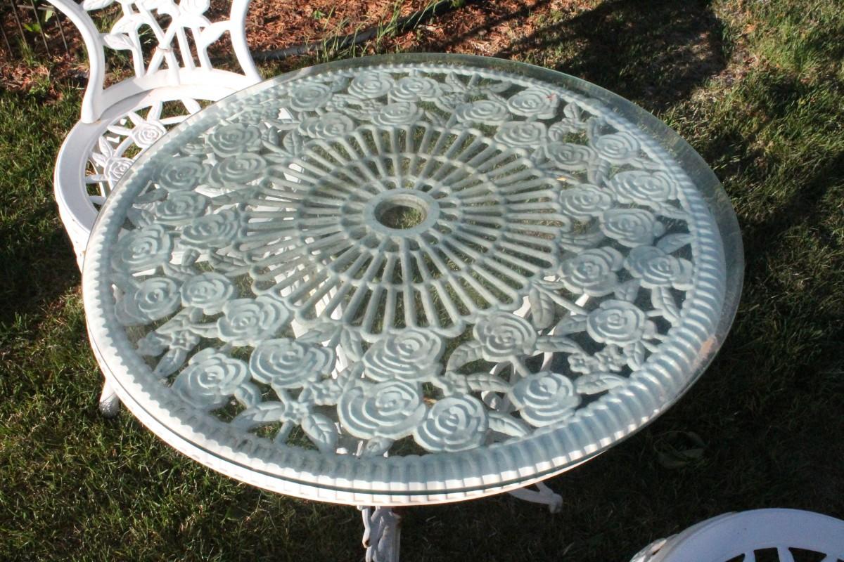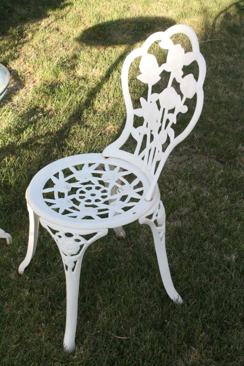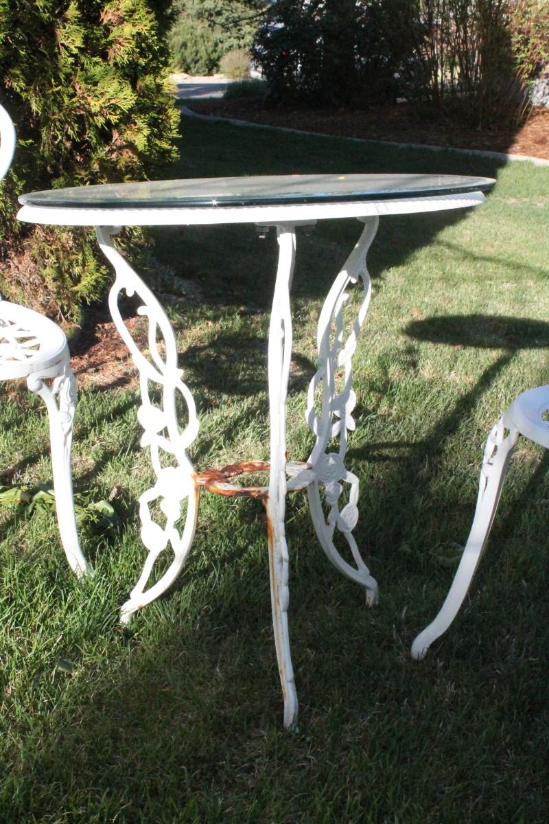 Lot 51: Vintage Cast Iron Outdoor Garden Patio Dining Set w/ (2) Chairs and Table featuring glass top