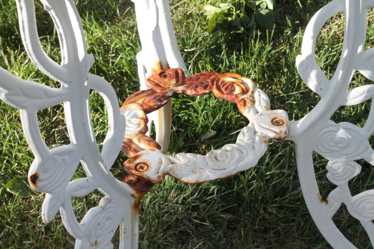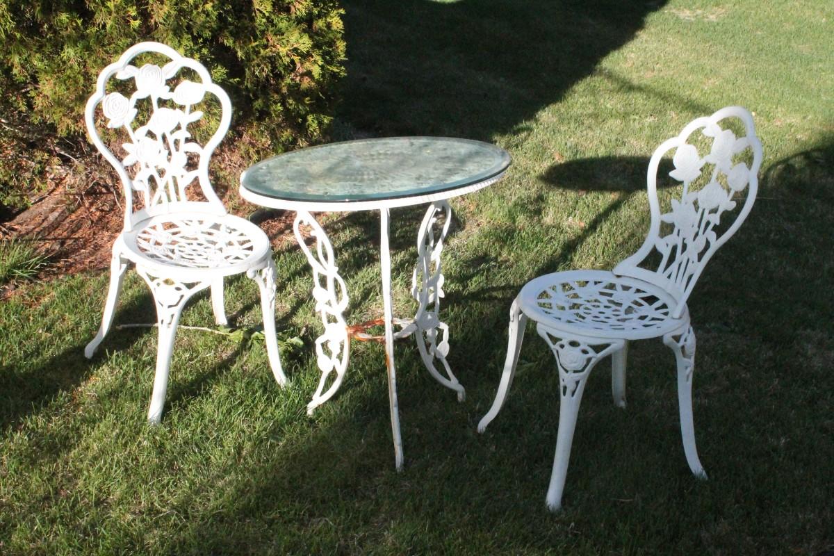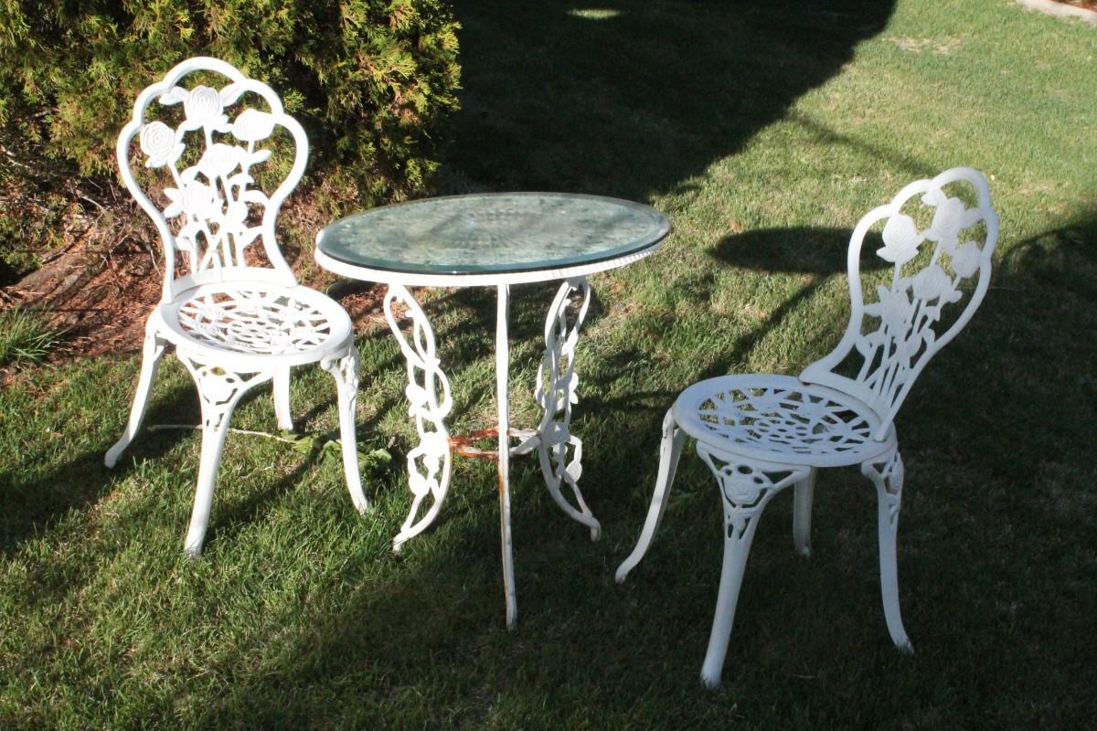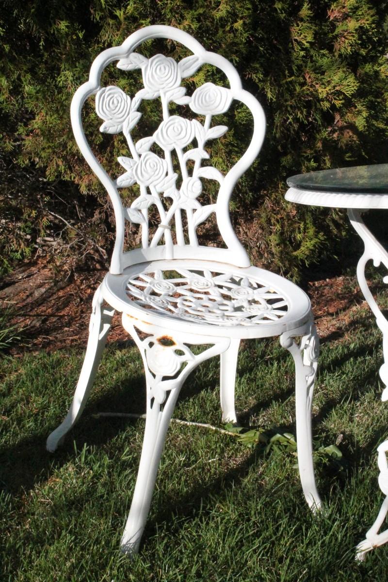 Lot 51: Vintage Cast Iron Outdoor Garden Patio Dining Set w/ (2) Chairs and Table featuring glass top