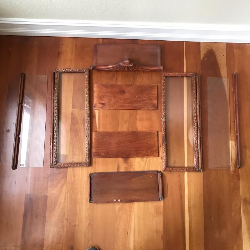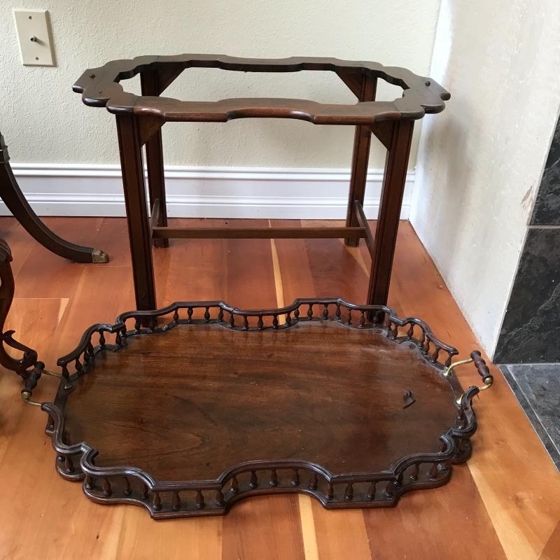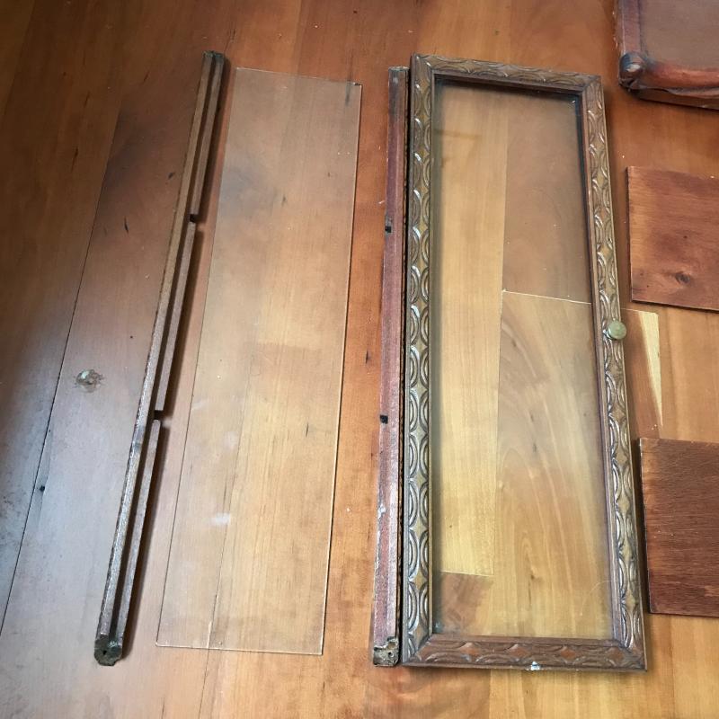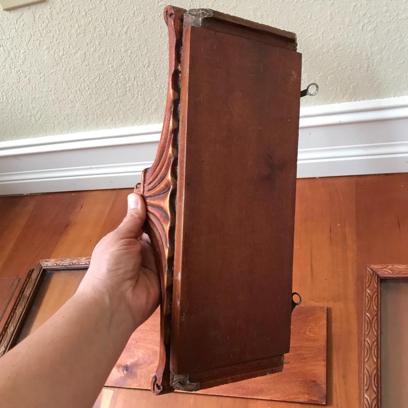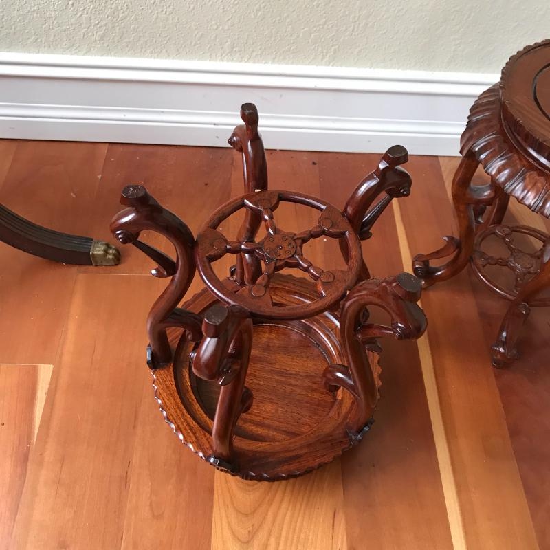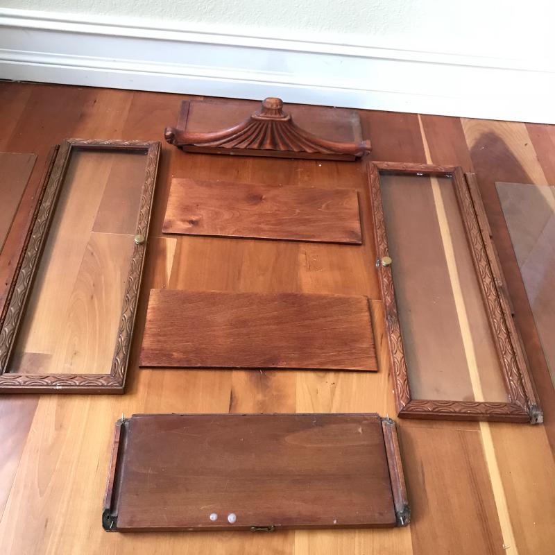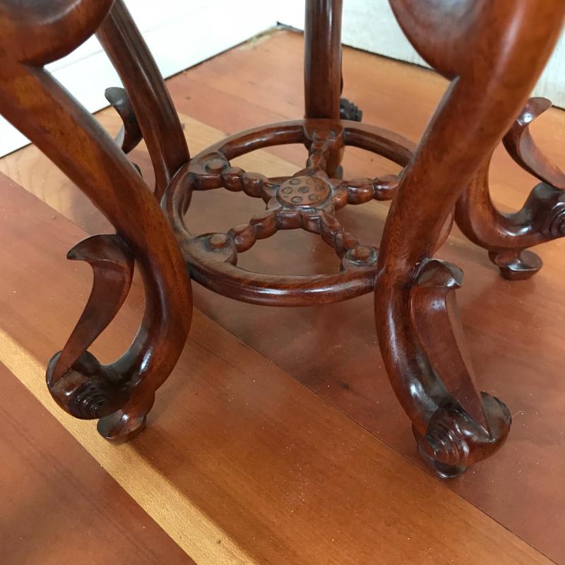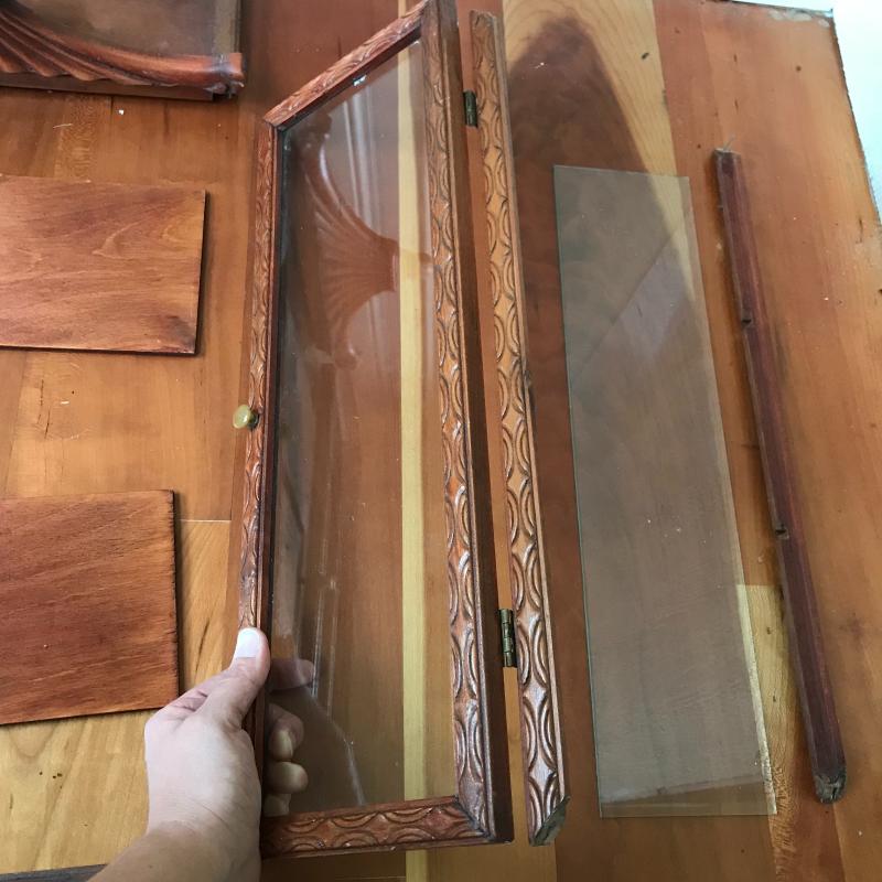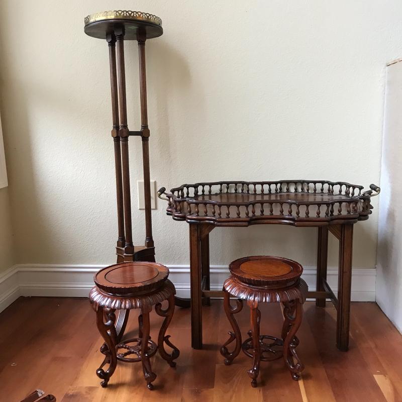 Every piece in this lot is ornate and amazing! Photos start with a 41” tall claw foot plant stand with water damage to the top base, but the legs and feet are almost flawless. Next is the tea service table measuring 28.5” x 17” x 19”. The handles have brass hardware and the wood legs and table surface is in great condition. The fence is fragile and broken in some spots, see photos. Collection also includes two 12” tall matching display stands in pristine condition. Lastly a deconstructed open-backed hanging display case. The case would measure approximately 14” x 6” x 23”. No shipping.