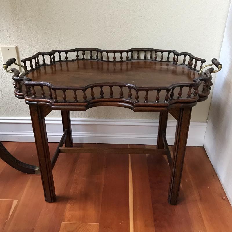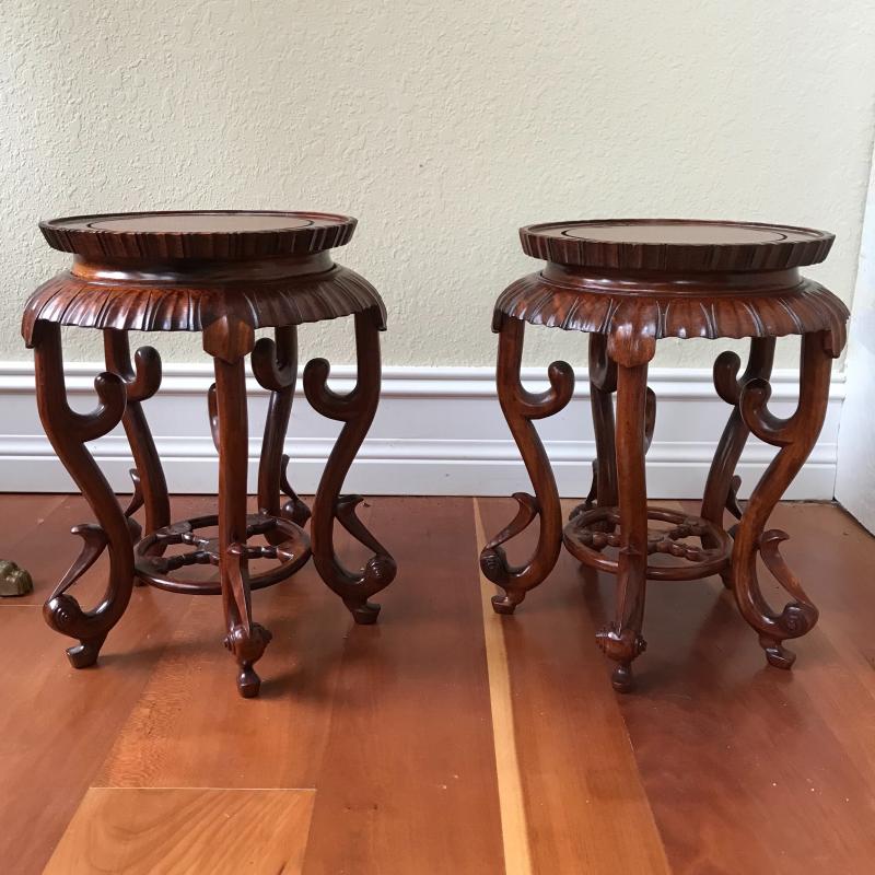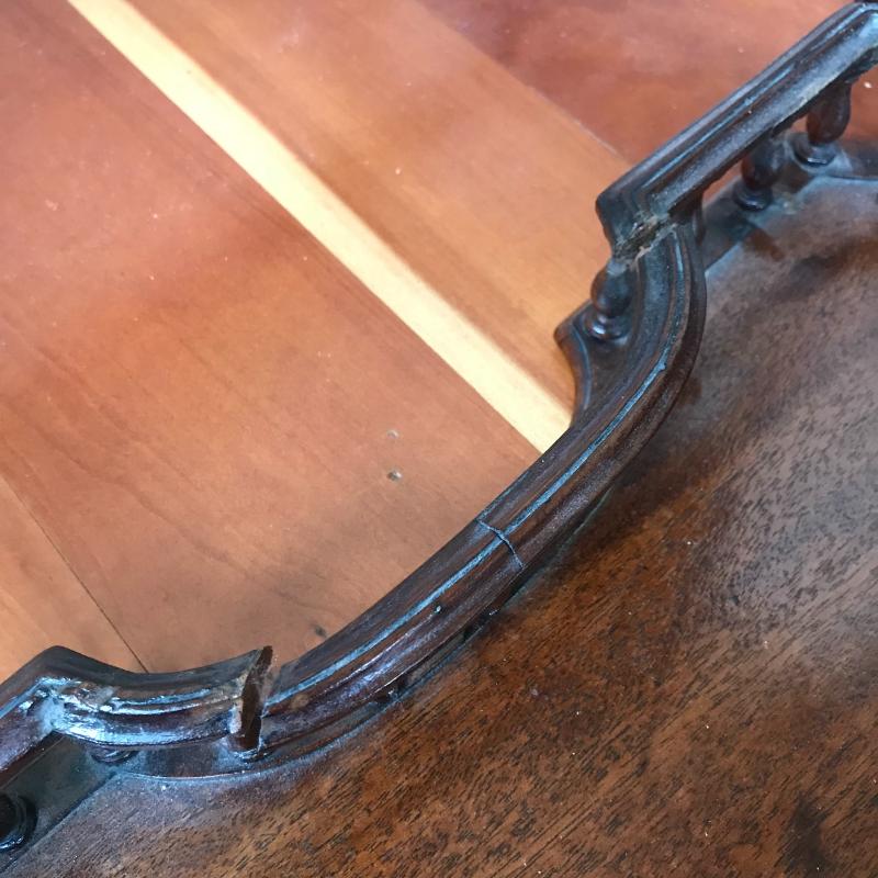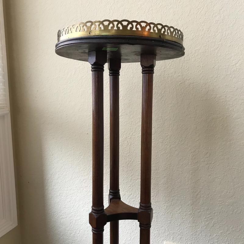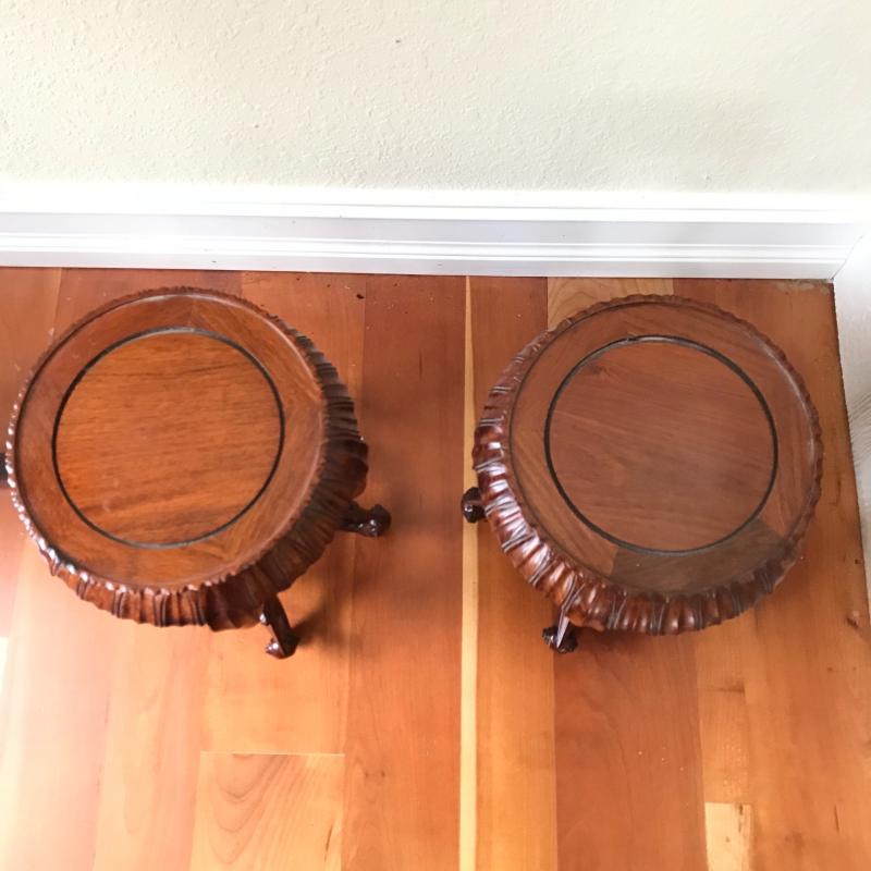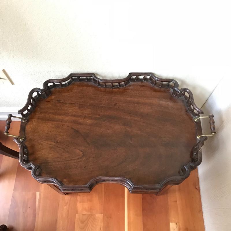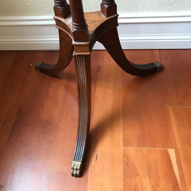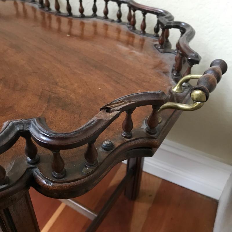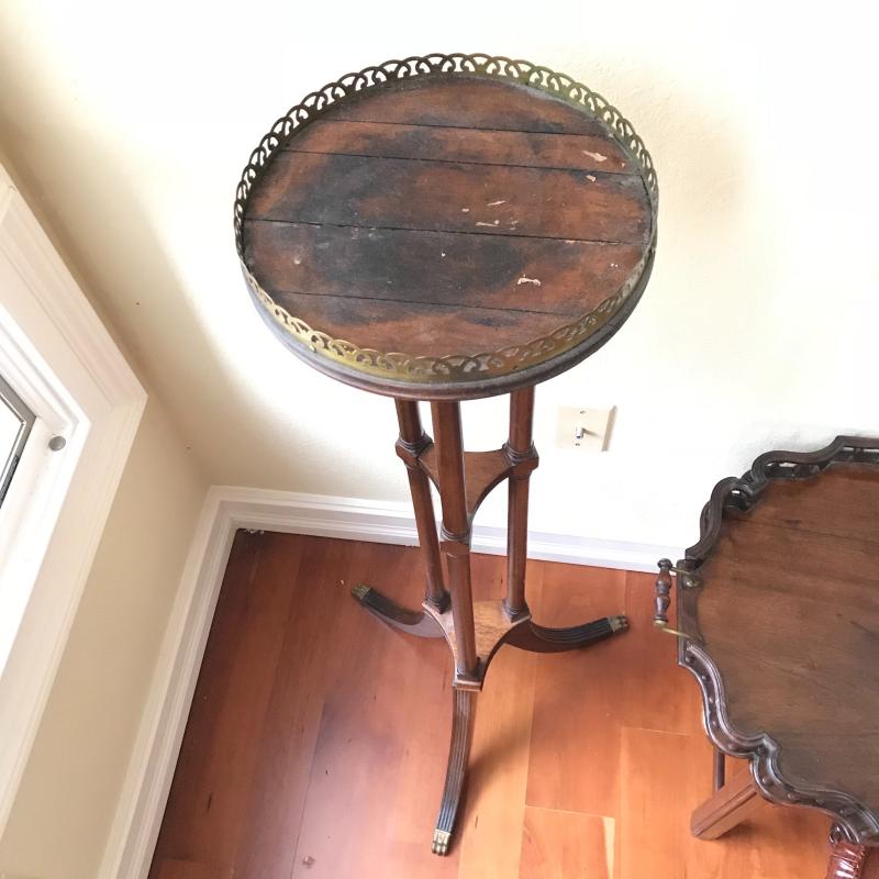 Every piece in this lot is ornate and amazing! Photos start with a 41” tall claw foot plant stand with water damage to the top base, but the legs and feet are almost flawless. Next is the tea service table measuring 28.5” x 17” x 19”. The handles have brass hardware and the wood legs and table surface is in great condition. The fence is fragile and broken in some spots, see photos. Collection also includes two 12” tall matching display stands in pristine condition. Lastly a deconstructed open-backed hanging display case. The case would measure approximately 14” x 6” x 23”. No shipping.
