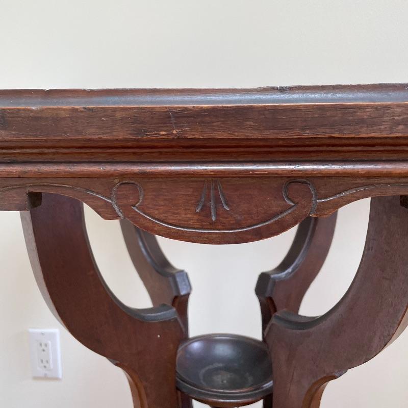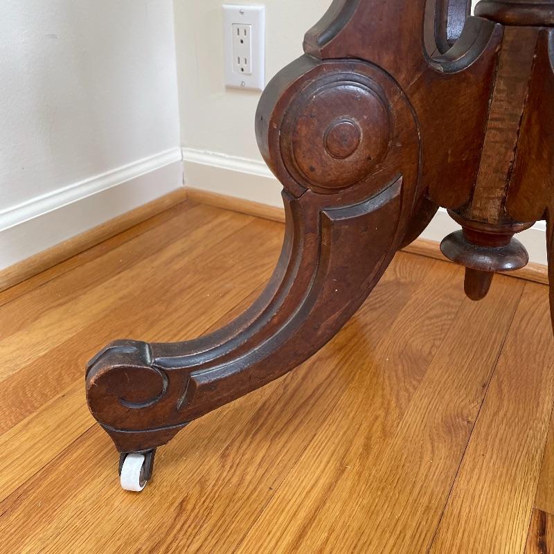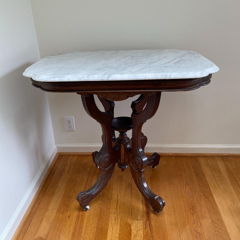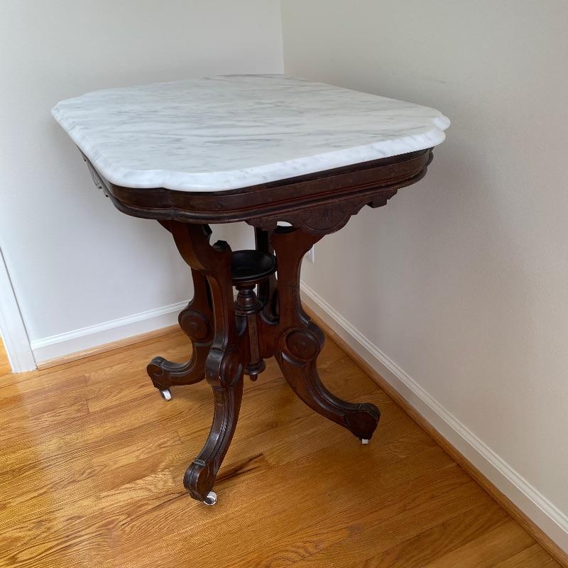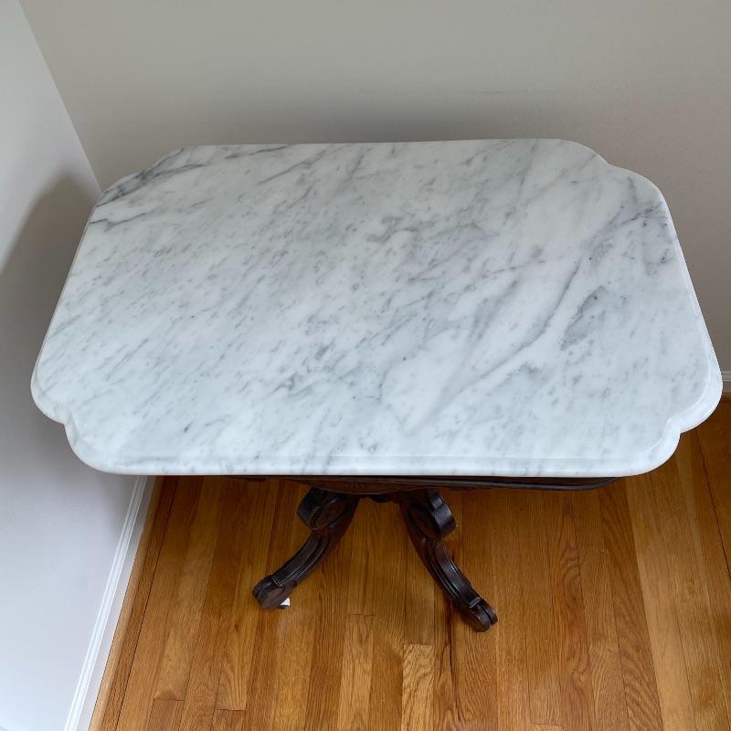 Here is a gorgeous antique marble topped table. The wood is dark with just a slight hint of red and beautifully carved. The marble top is a mix of white with gray and in amazing shape. The white casters also add to the charm of the table, but don’t roll easily. This piece is in amazing condition for its age and will be one we remember for a long time. Marble top measures approximately 32.25” x 23” and table is about 30.25” tall. See photos. Local pick up only.