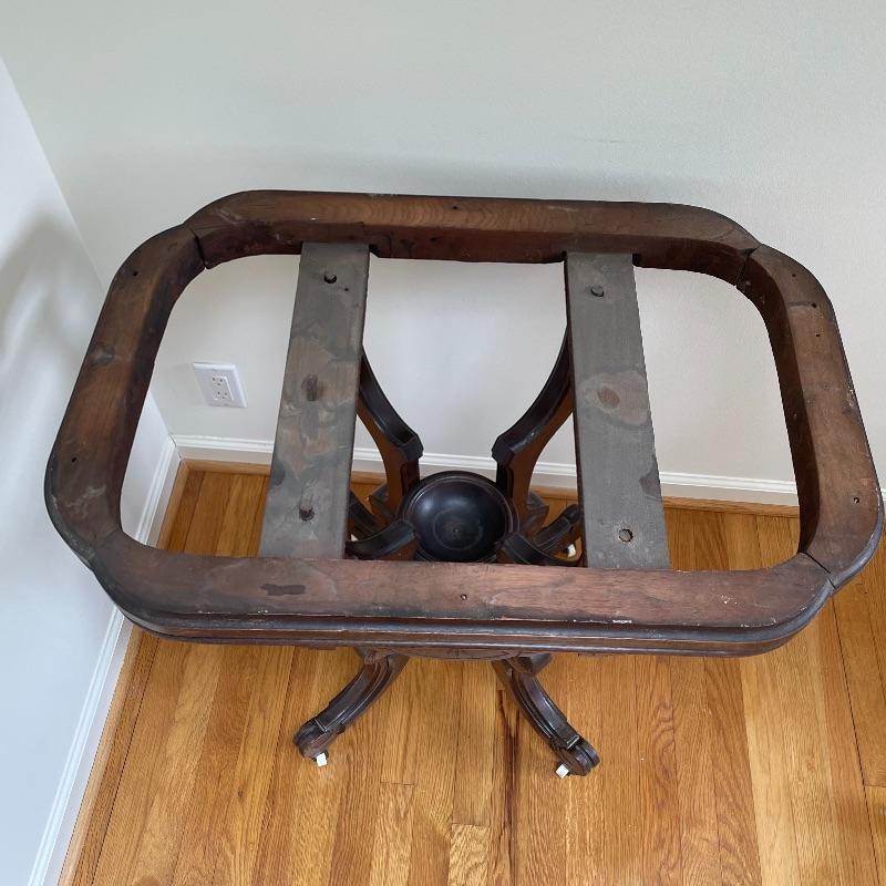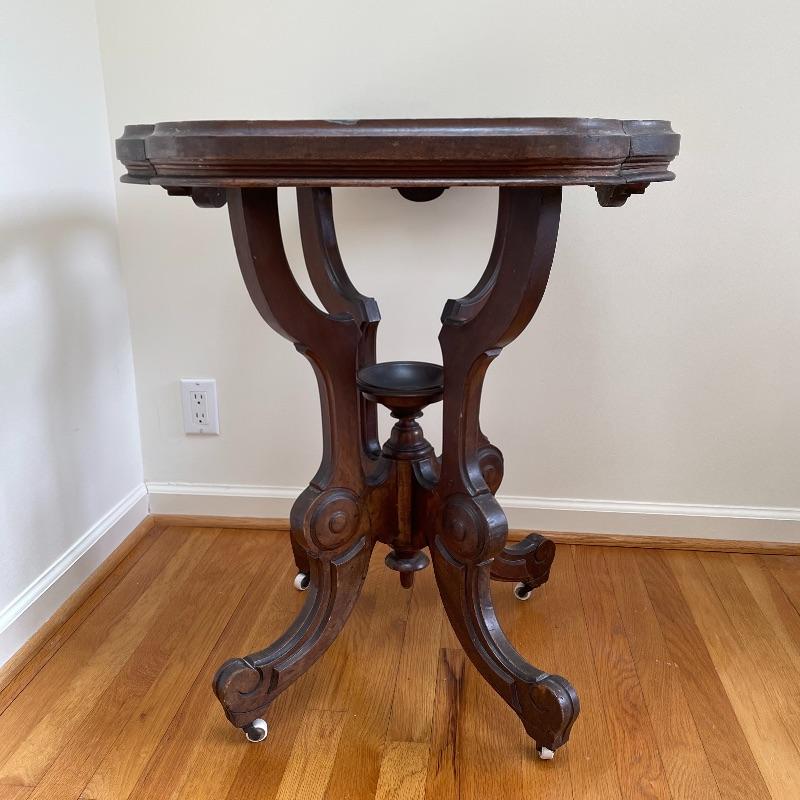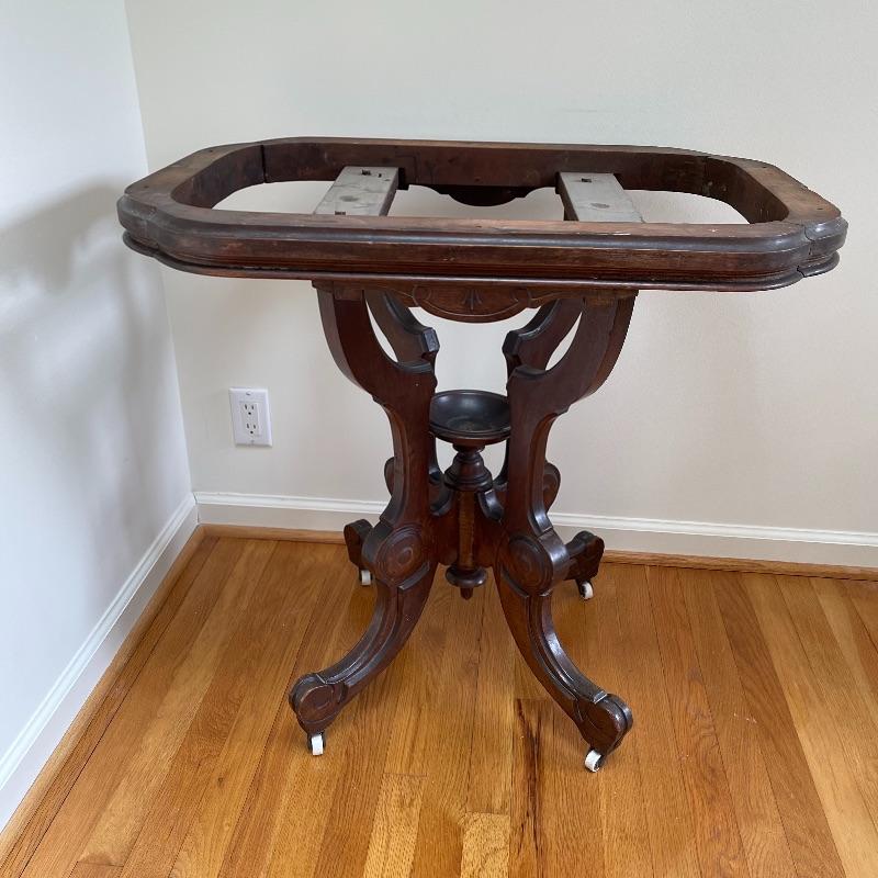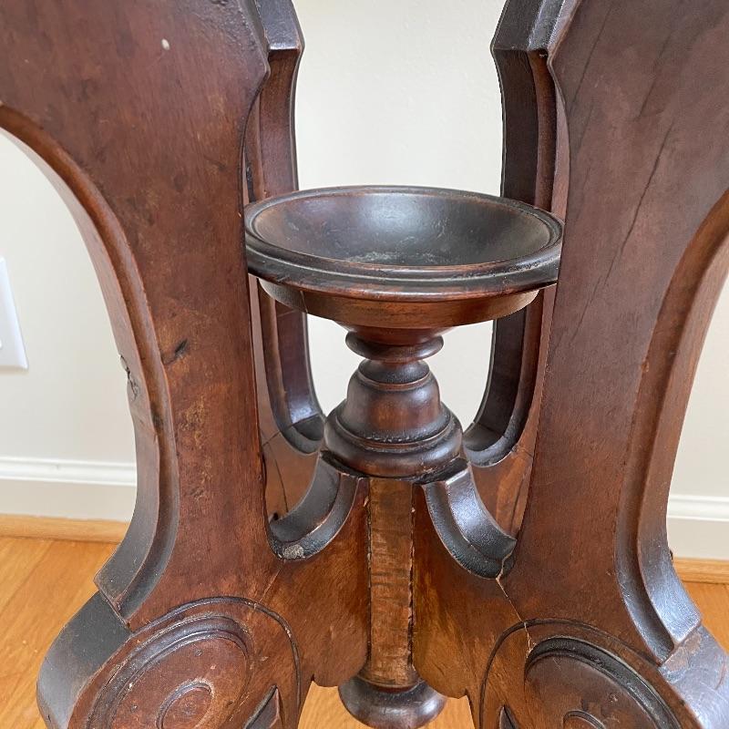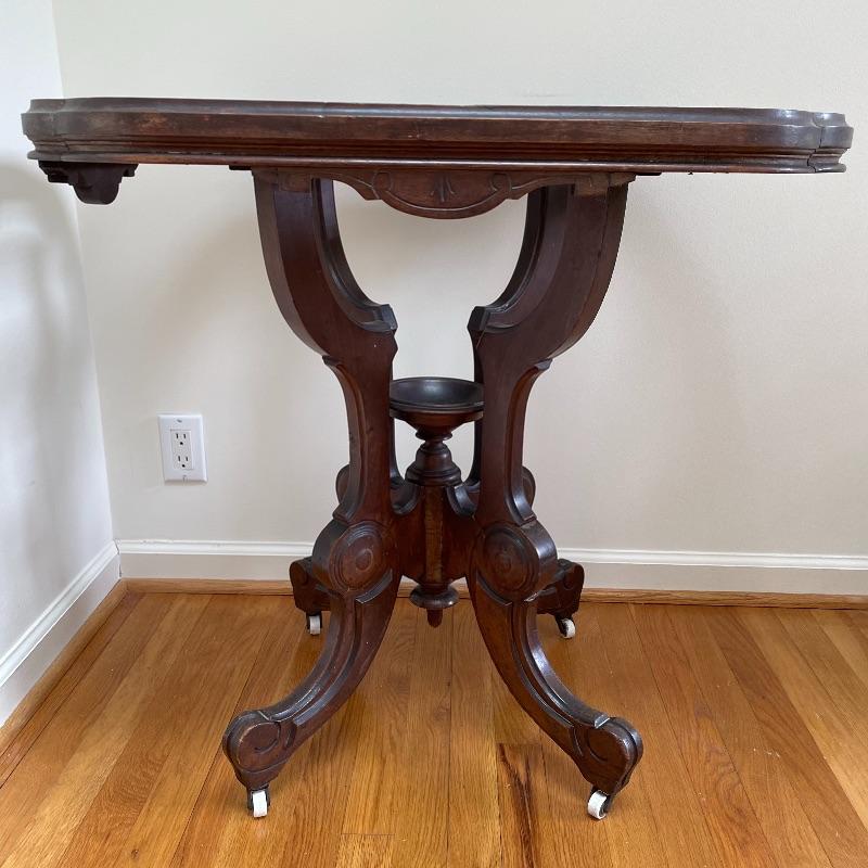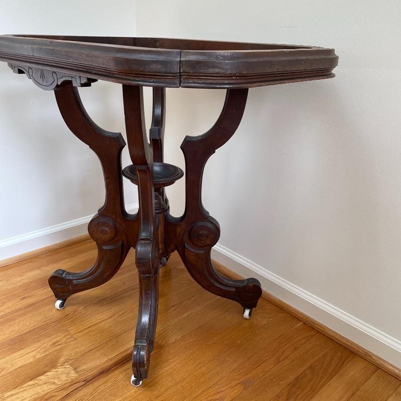 Here is a gorgeous antique marble topped table. The wood is dark with just a slight hint of red and beautifully carved. The marble top is a mix of white with gray and in amazing shape. The white casters also add to the charm of the table, but don’t roll easily. This piece is in amazing condition for its age and will be one we remember for a long time. Marble top measures approximately 32.25” x 23” and table is about 30.25” tall. See photos. Local pick up only.