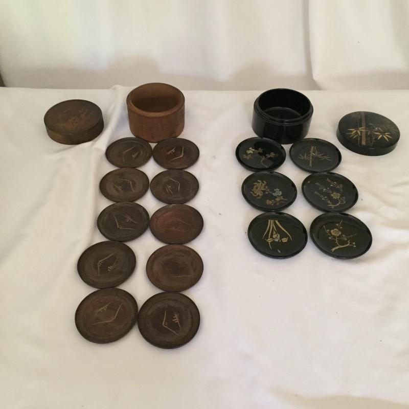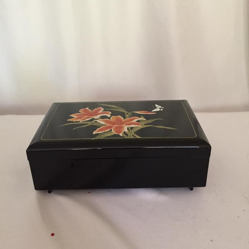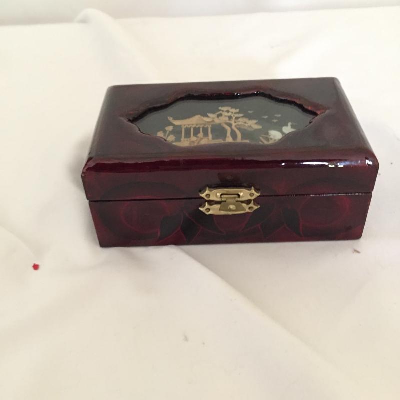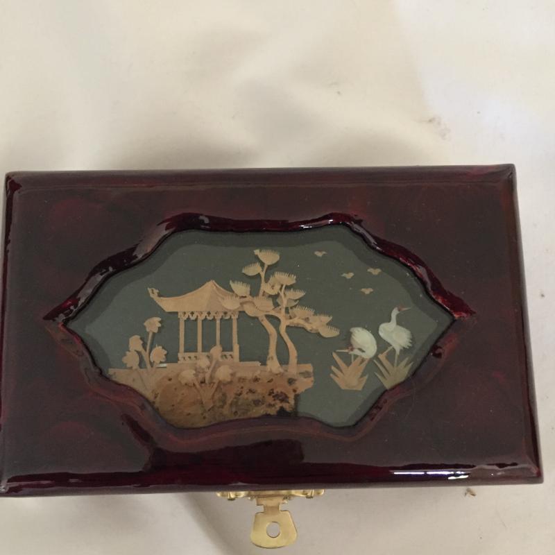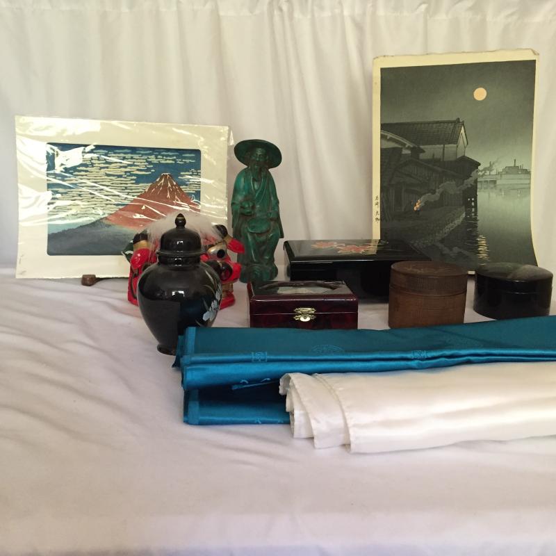 Great collection of Asian Collectables. You’ll find some artwork (possible wood block), a black lacquer jewelry box, a wooden Chinese dragon face, Two coaster sets in cases,a jade colored statue, and aqua blue silk like fabric. Music Box Measures 8” x 5” 2.75”. Blue Fabric Measures 36” x 180”. Shipping Available