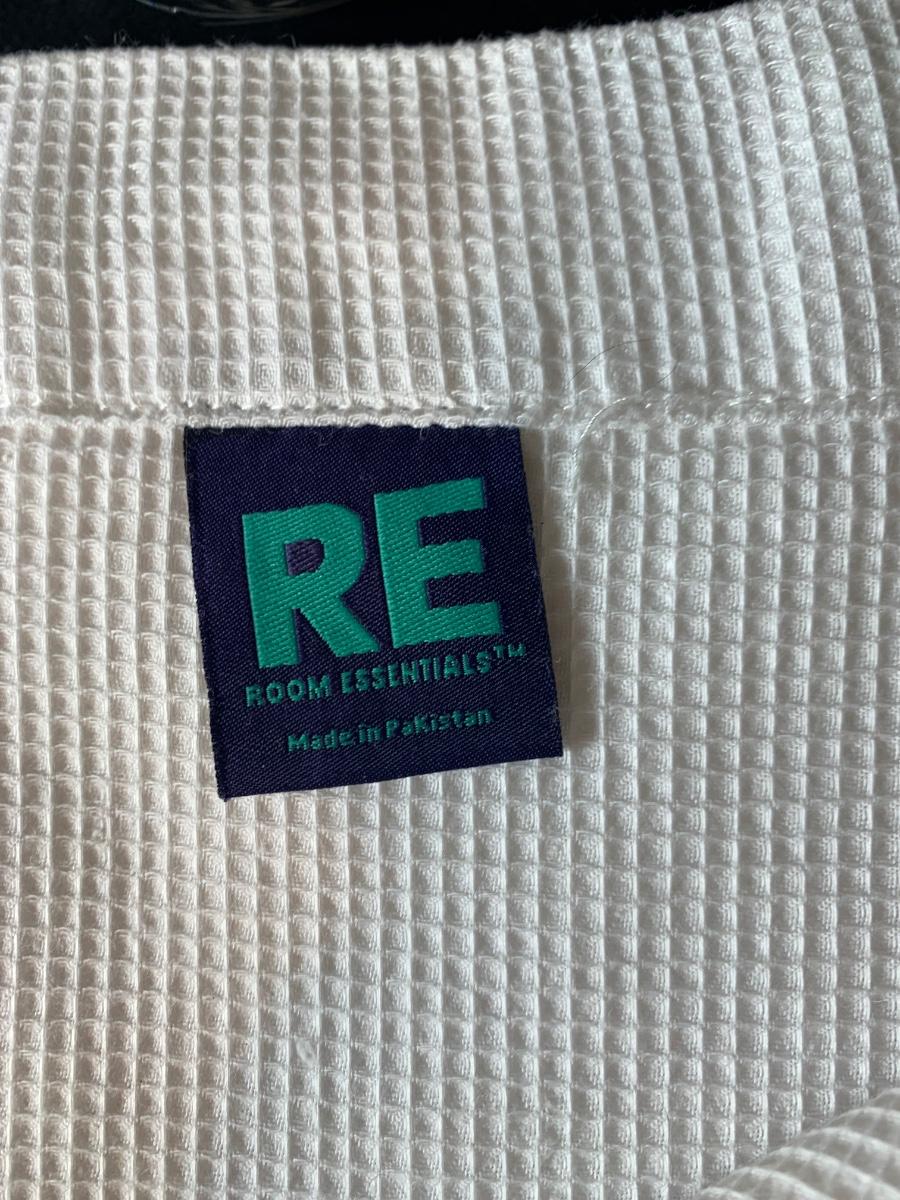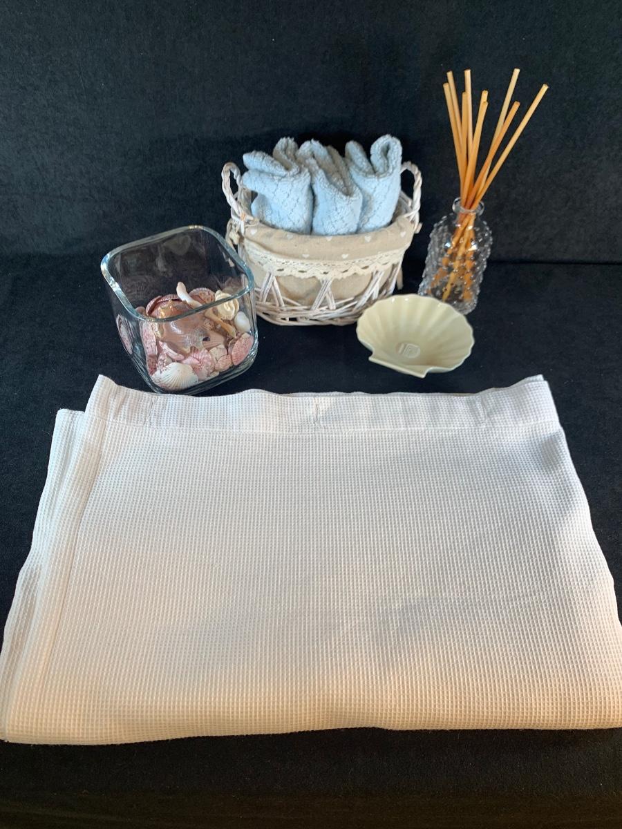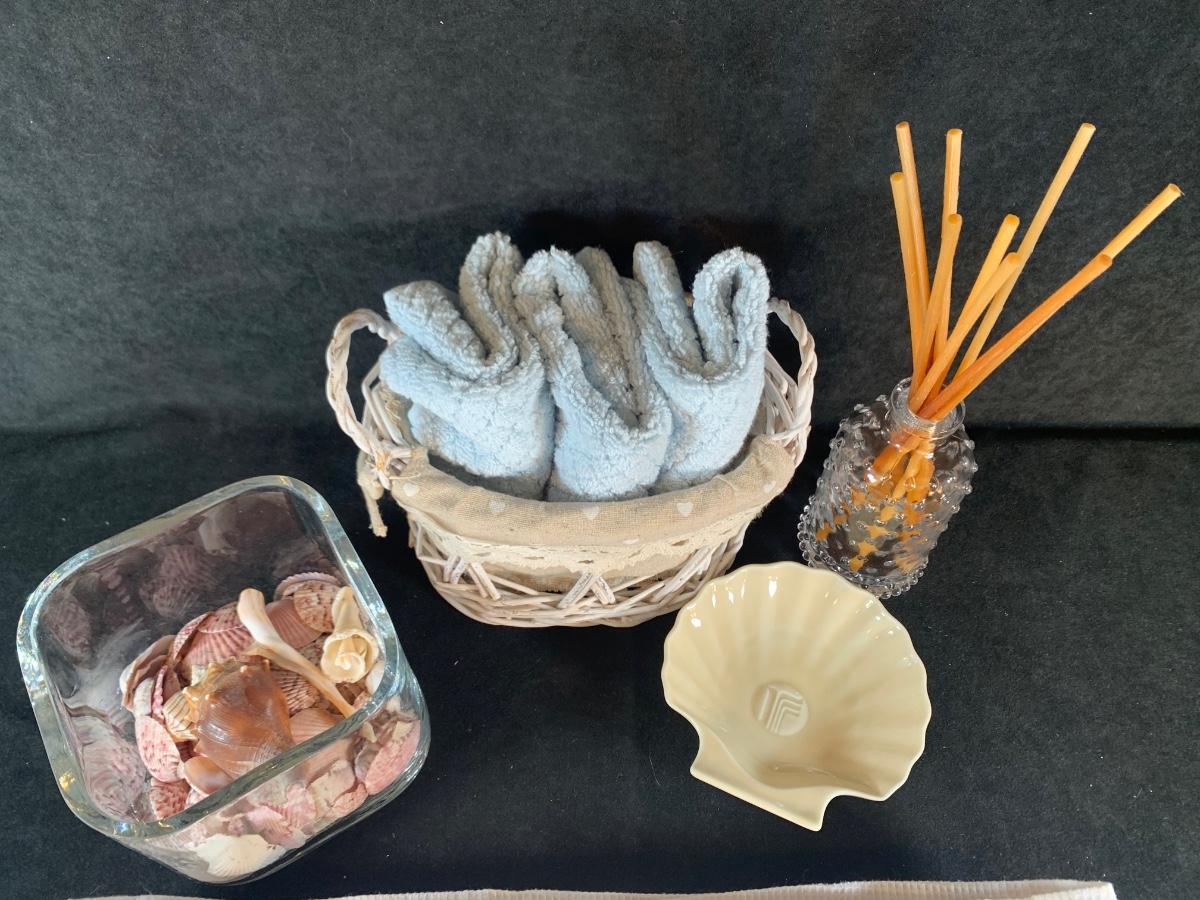 Includes RE Room Essentials White Shower Curtain, Reed Diffuser, Glass Dish with Sea Shells, a small lined basket with 3 Wash Cloths and a Shell shaped soap dish.
