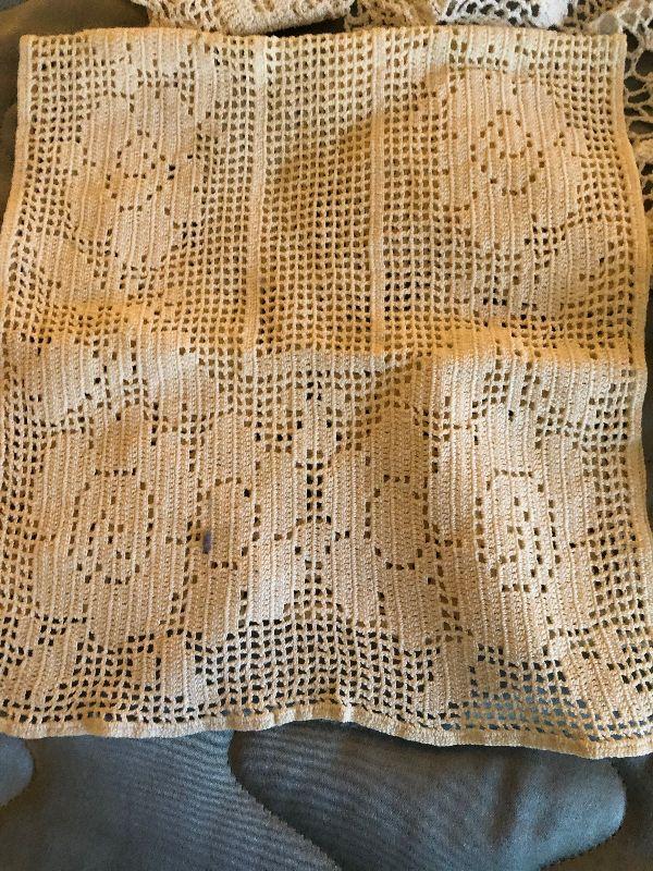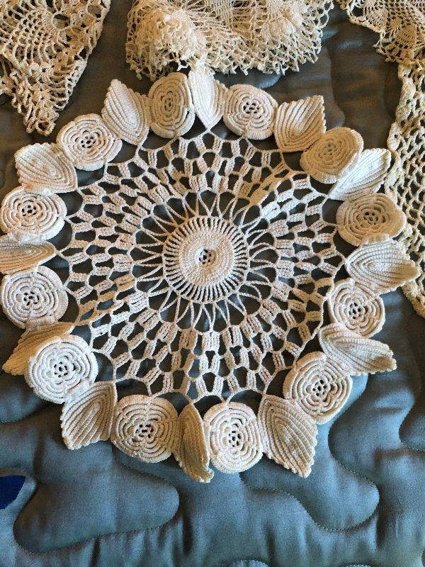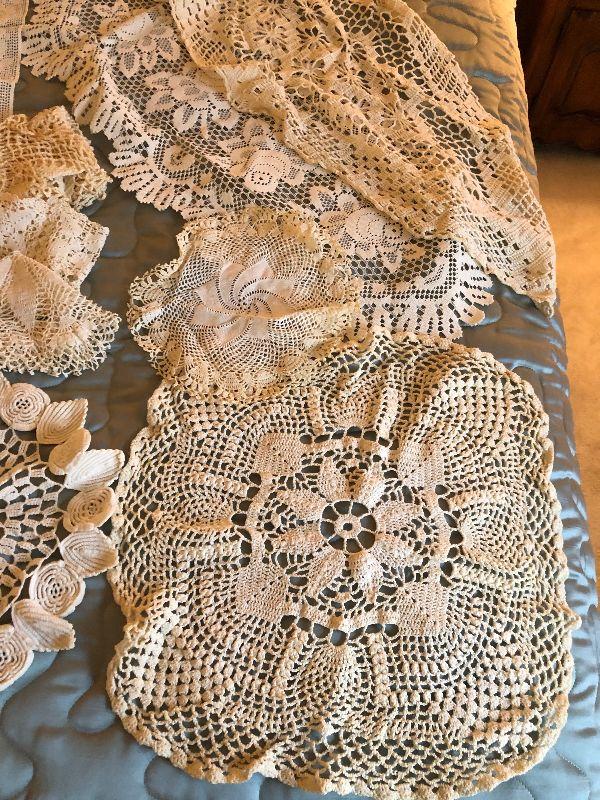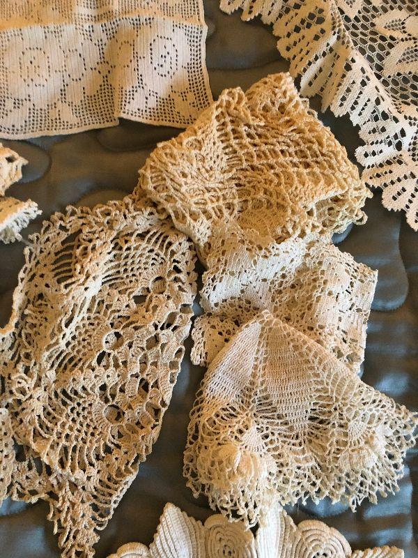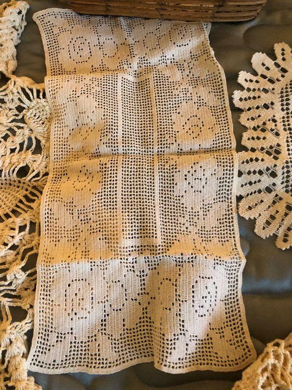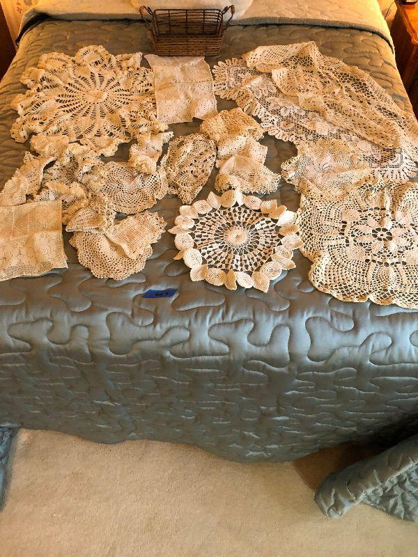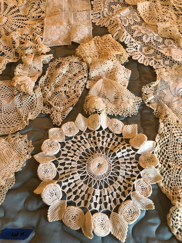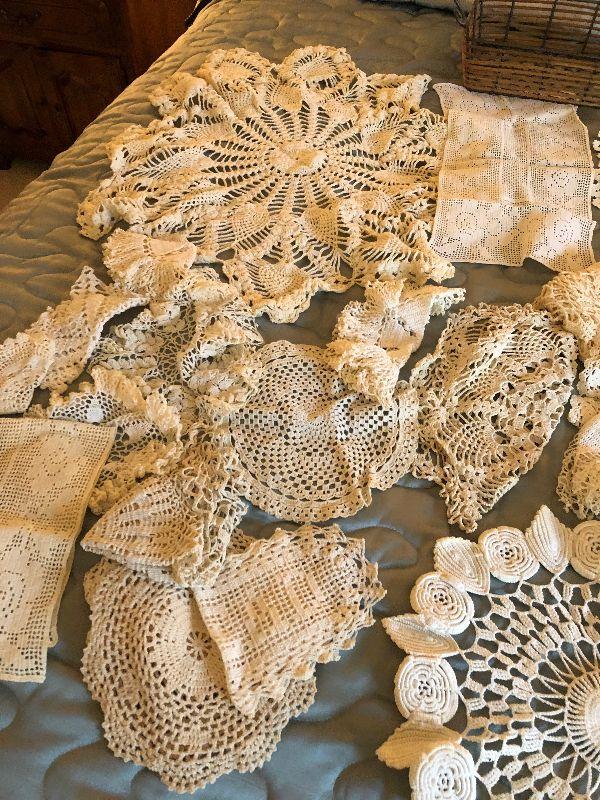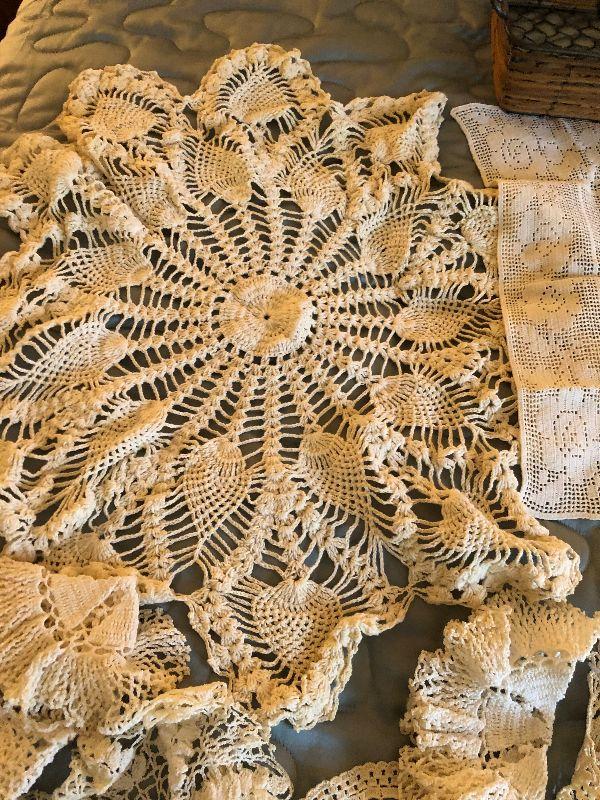 Basket of Assorted Vintage Handmade Lace including Doilies, Runners and Table Toppers.