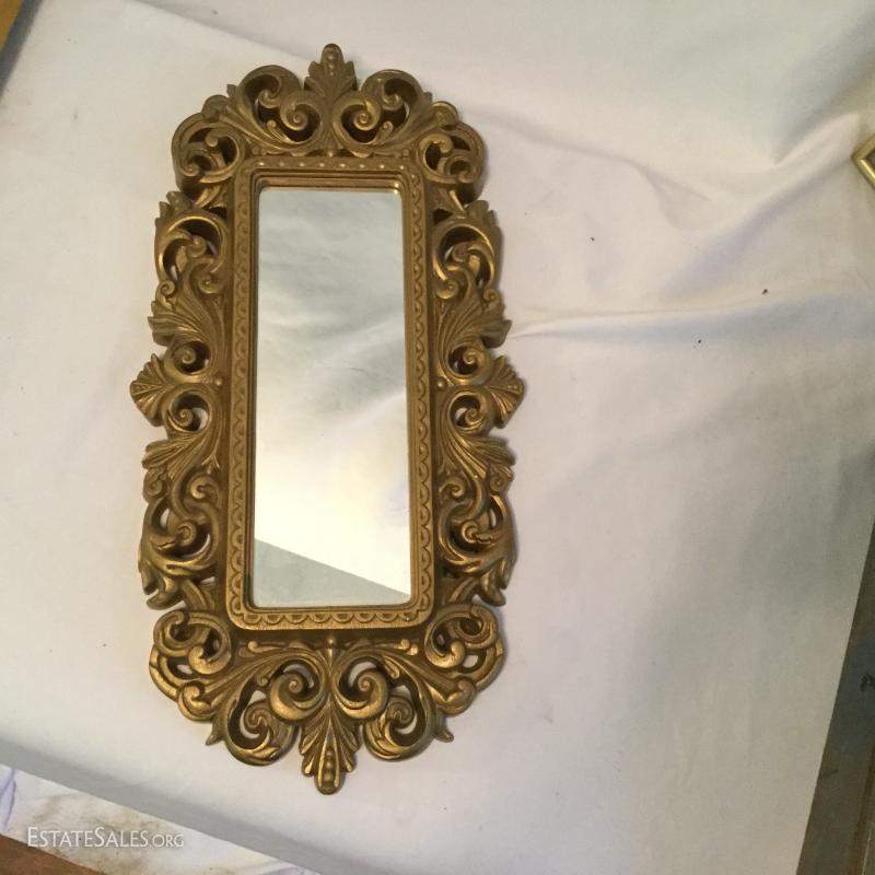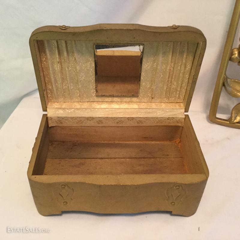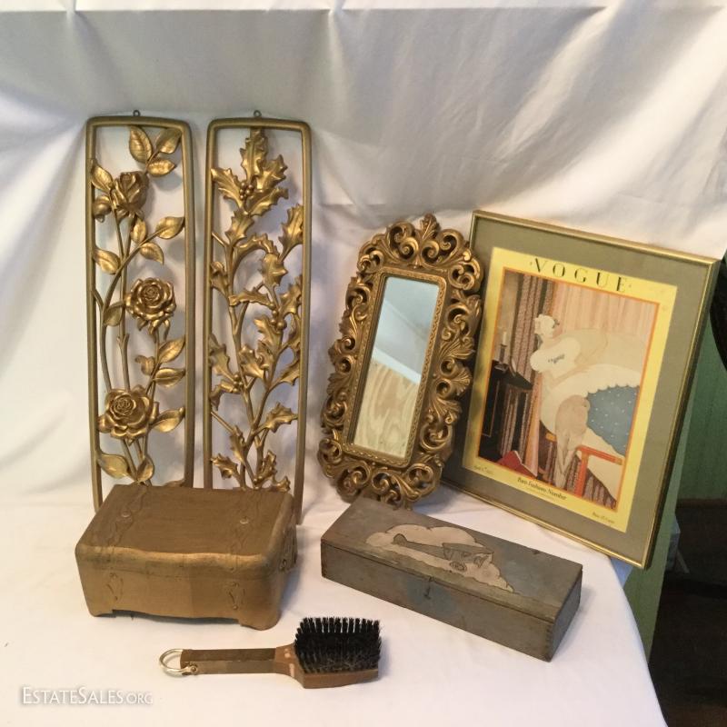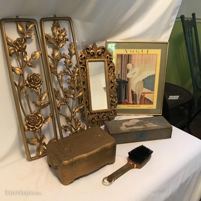 Lot includes two wooden boxes, Burwood Product Company Mirror, Syroco Co Wall Hangings, Vogue Art and Noymer Brush. Shipping available or pick up from Saluda, NC