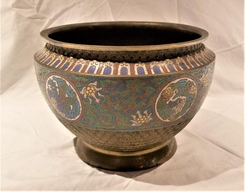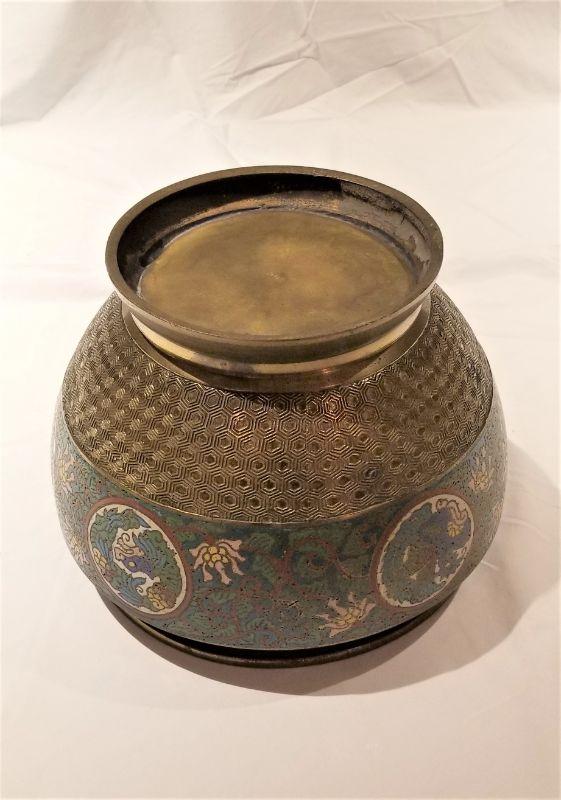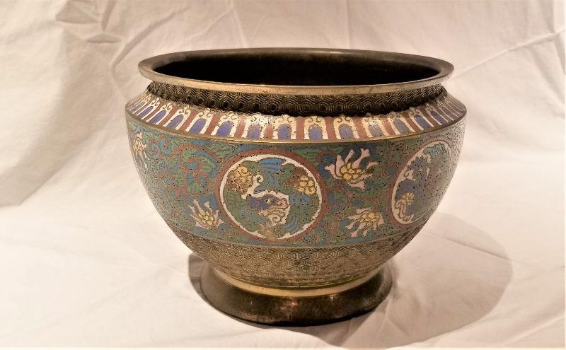 Heavy pot or planter with Asian styling. Brass band at bottom - cloisonne design (colorful) all around. Has a great look. 10 1/4" across, 7.5 inches tall.