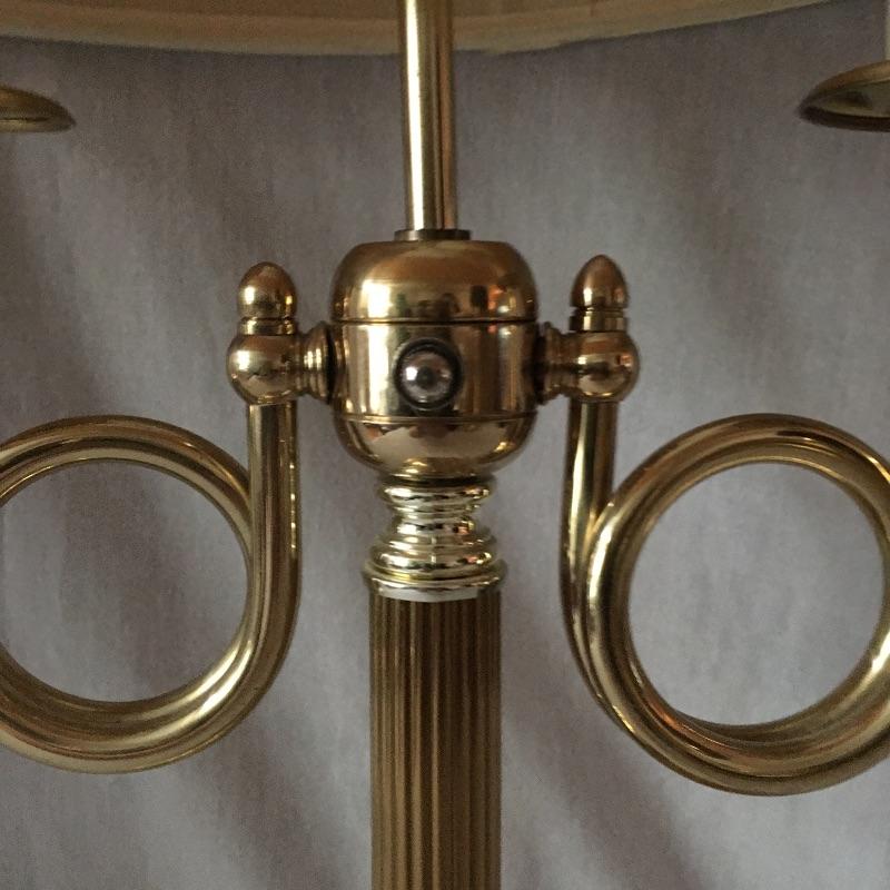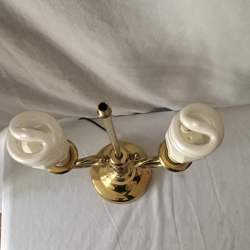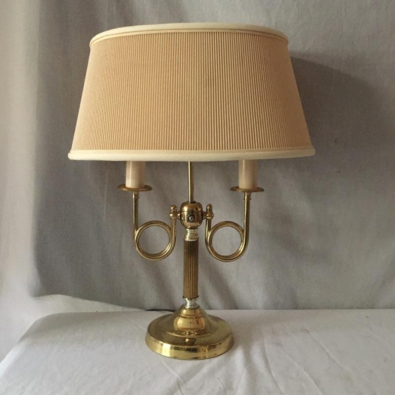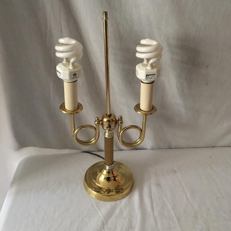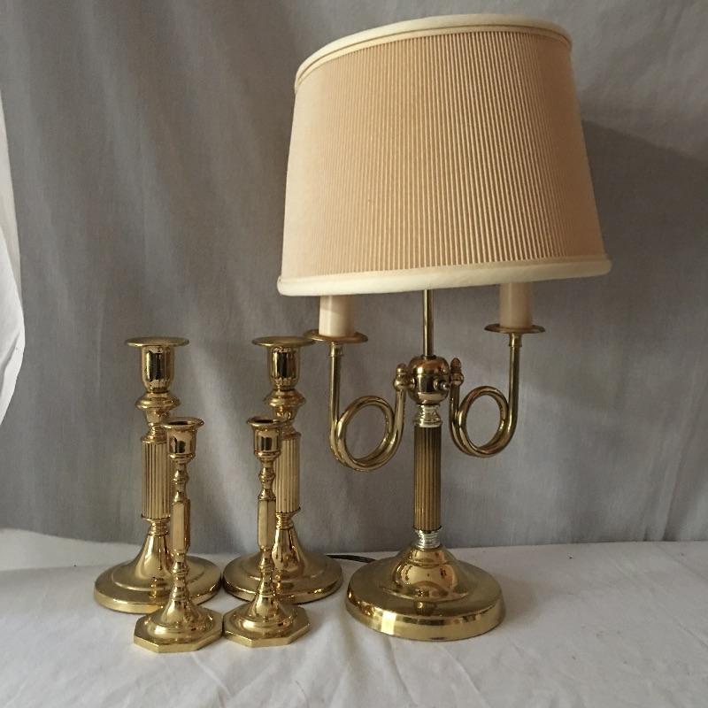 Brass dual bulb lamp and two pair of brass candlesticks. This lamp has a unique style that almost looks like two brass instruments! Lamp measures 19.5” tall. All pieces are in great condition and heavy. Lamp worked when tested.