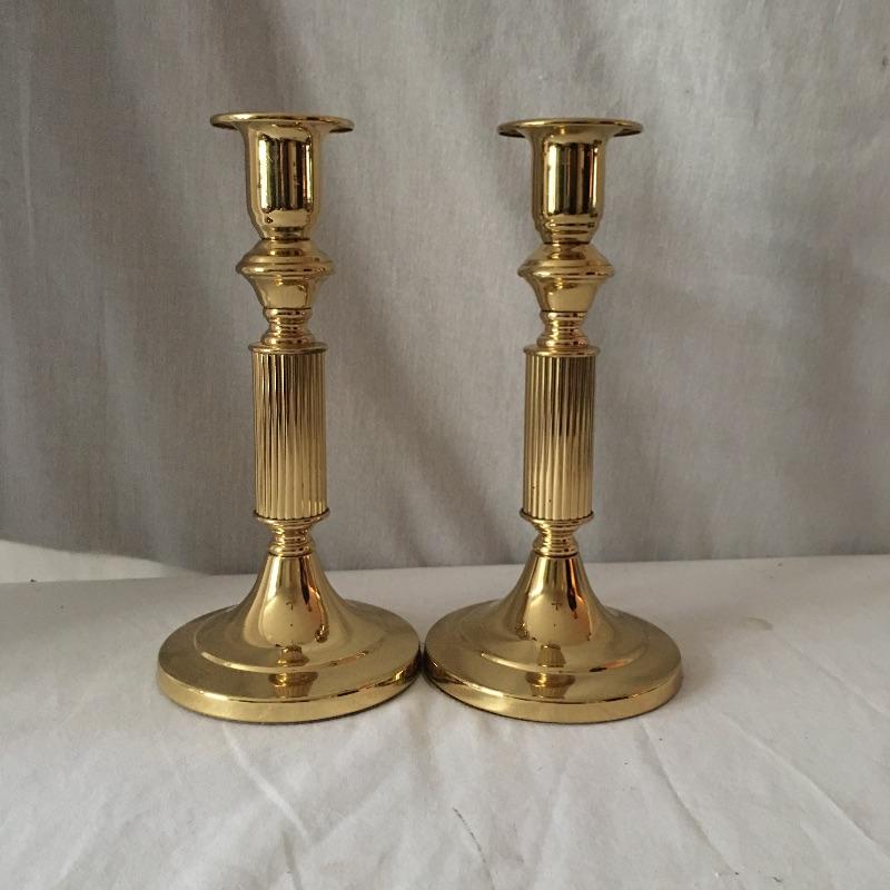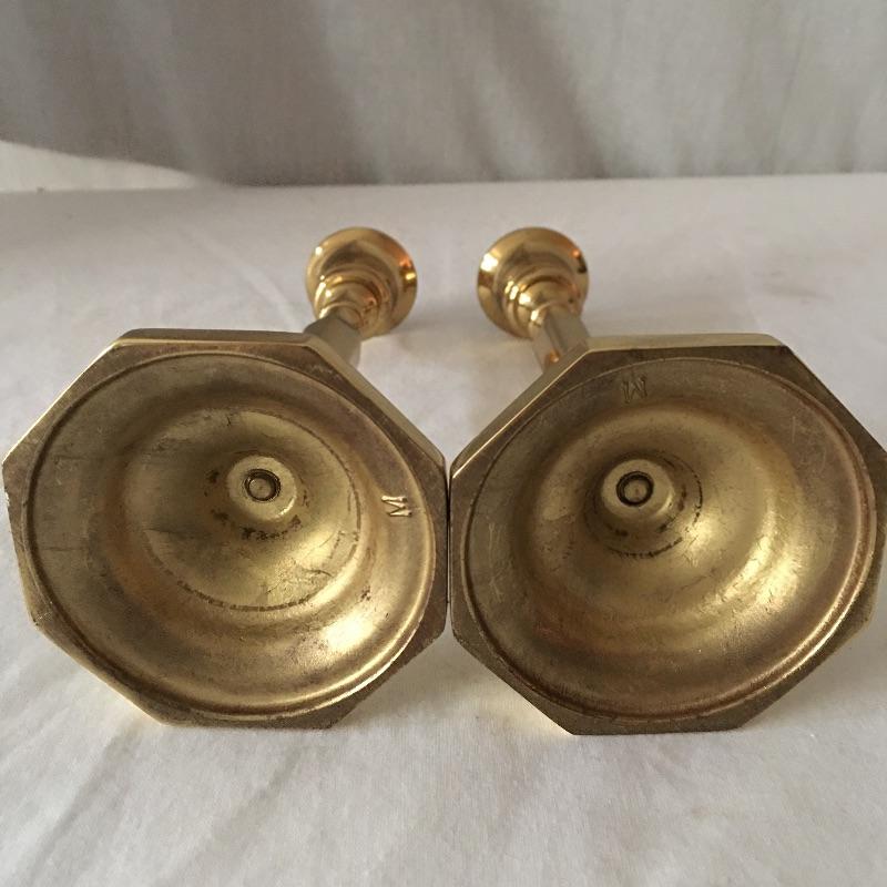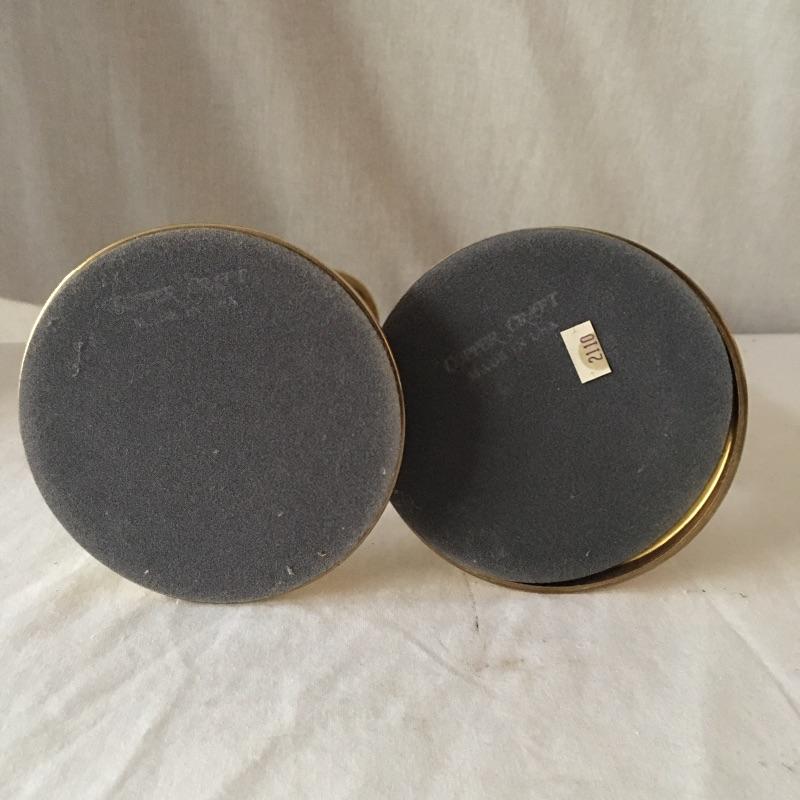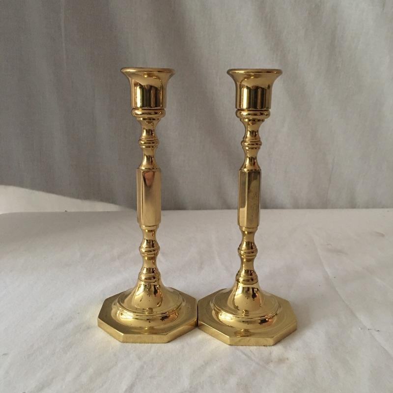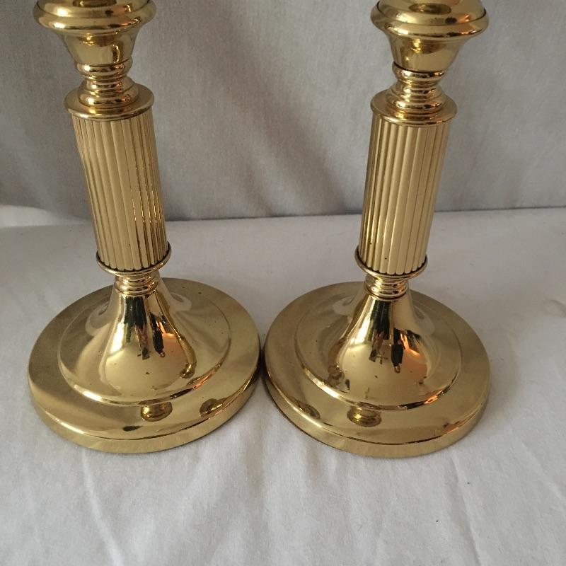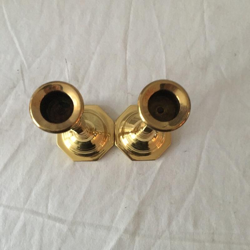 Brass dual bulb lamp and two pair of brass candlesticks. This lamp has a unique style that almost looks like two brass instruments! Lamp measures 19.5” tall. All pieces are in great condition and heavy. Lamp worked when tested.