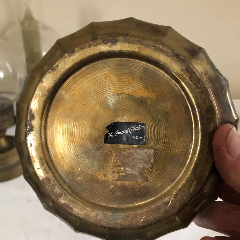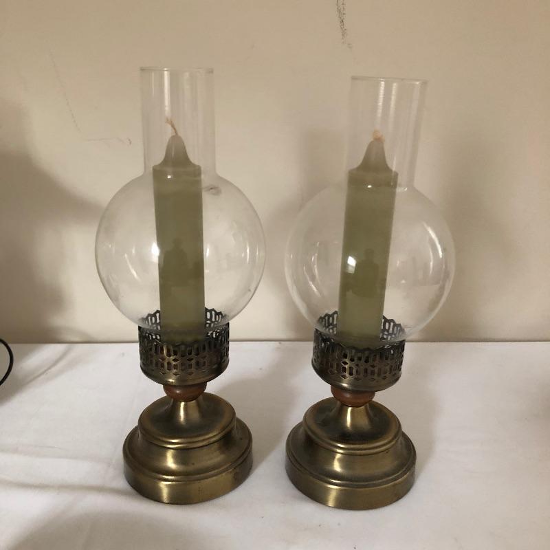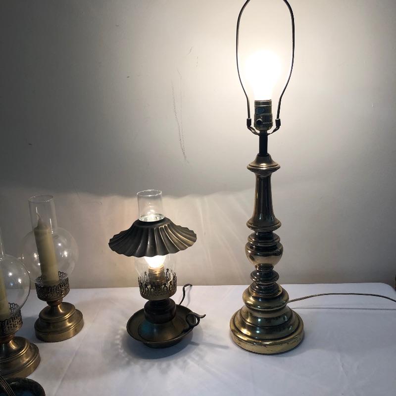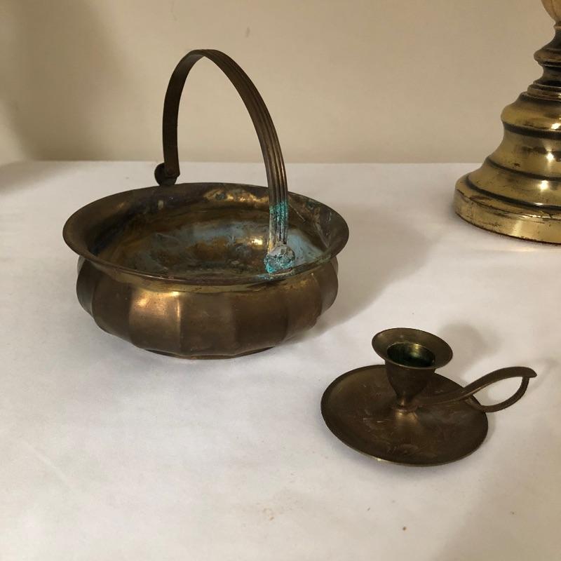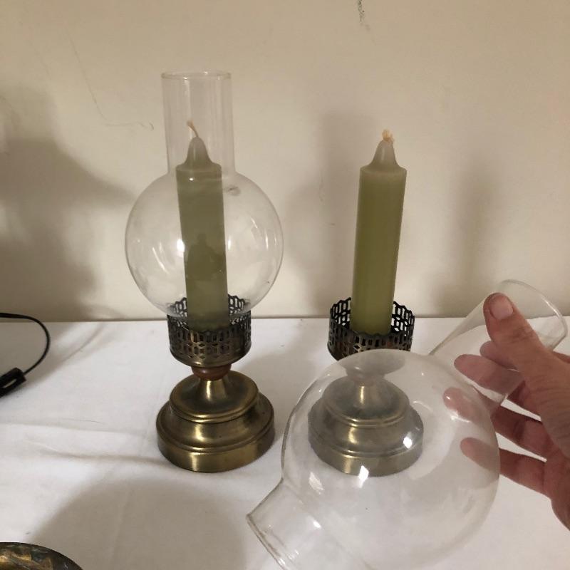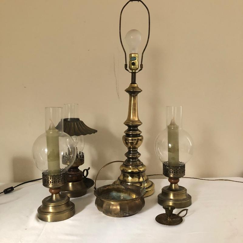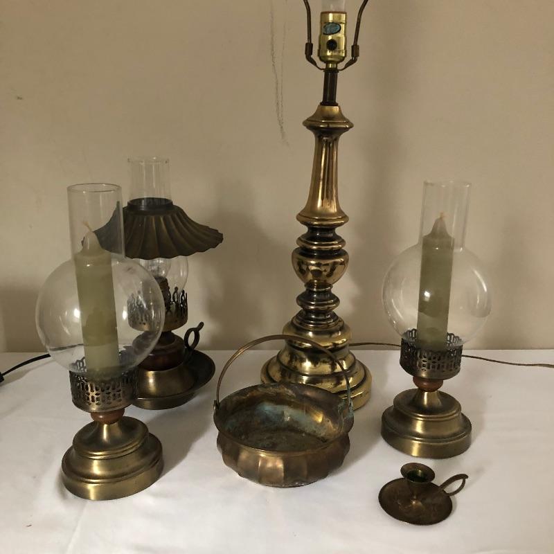 This lovely assortment of brass and brass colored items includes 2 table lamps; they both appear to be brass colored, the smaller lamp a darker aged brass color that has an in-line switch. The two brass colored candle holders have glass dome shades, candles are unused. The small bowl appears to be brass and shows some signs of oxidization and needs a good clean. Last but not least is a brass taper candle holder.