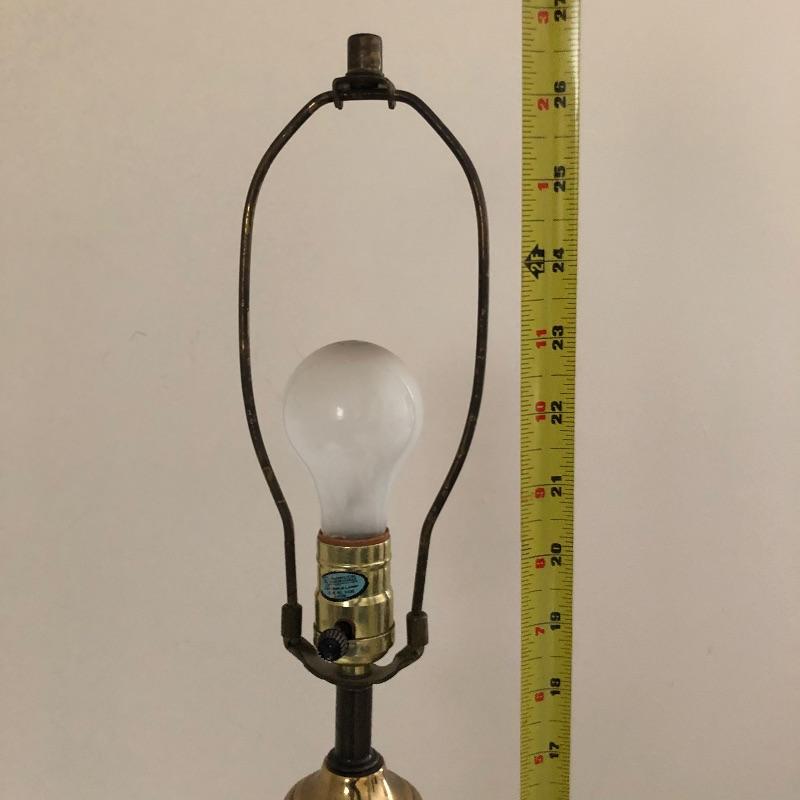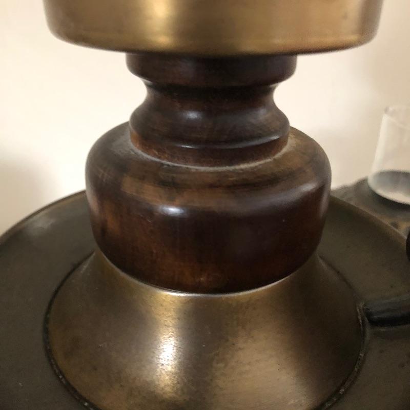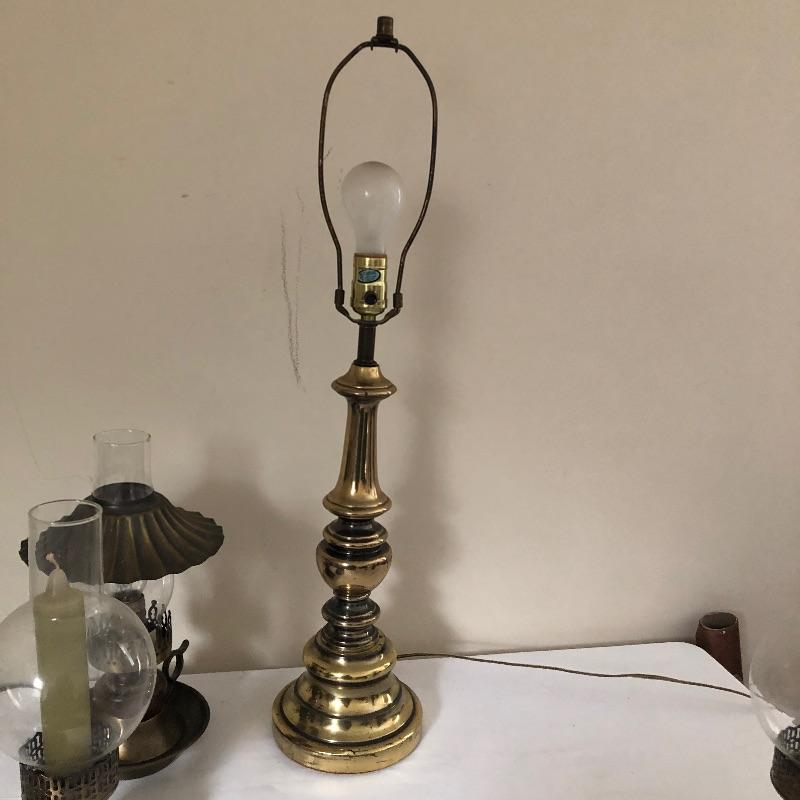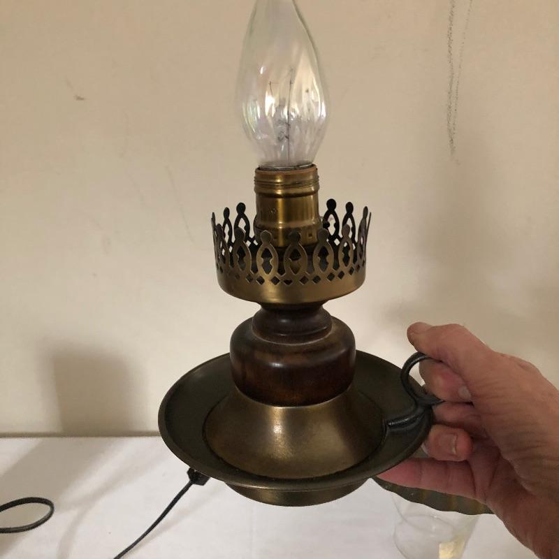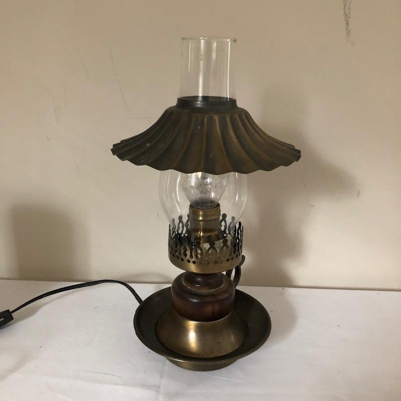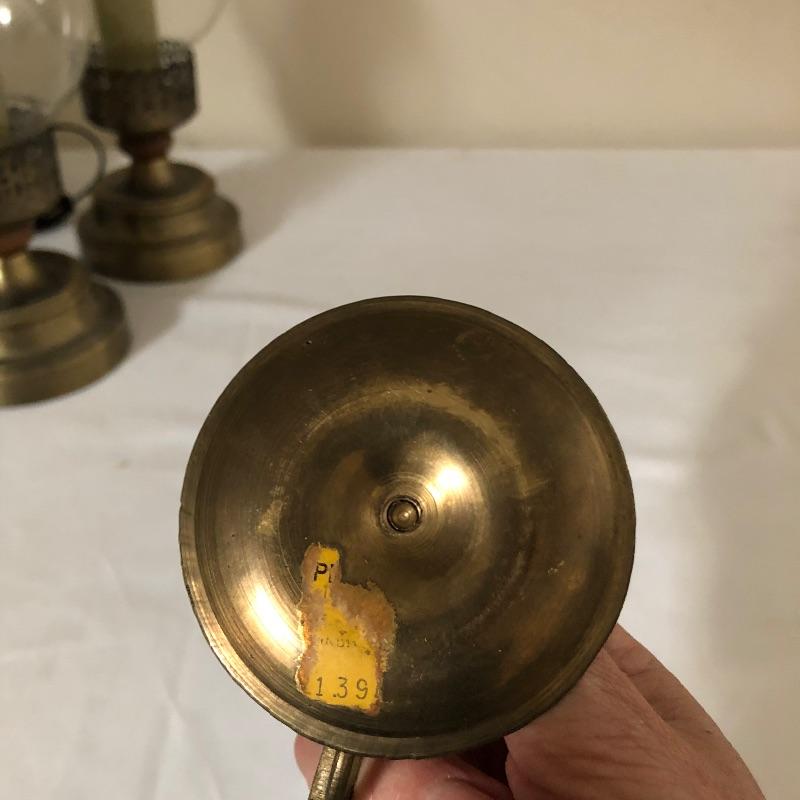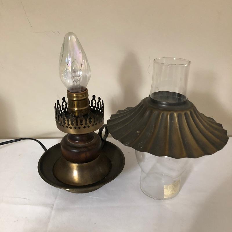 This lovely assortment of brass and brass colored items includes 2 table lamps; they both appear to be brass colored, the smaller lamp a darker aged brass color that has an in-line switch. The two brass colored candle holders have glass dome shades, candles are unused. The small bowl appears to be brass and shows some signs of oxidization and needs a good clean. Last but not least is a brass taper candle holder.