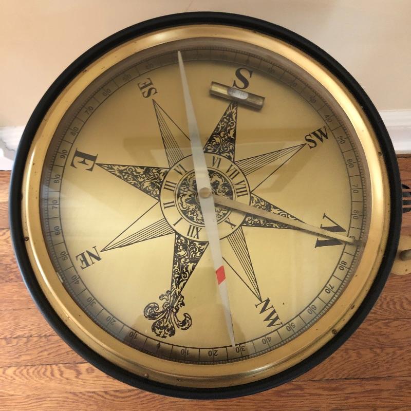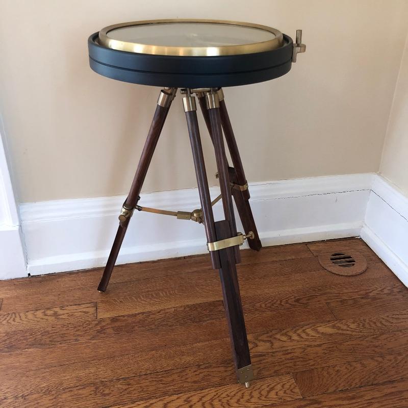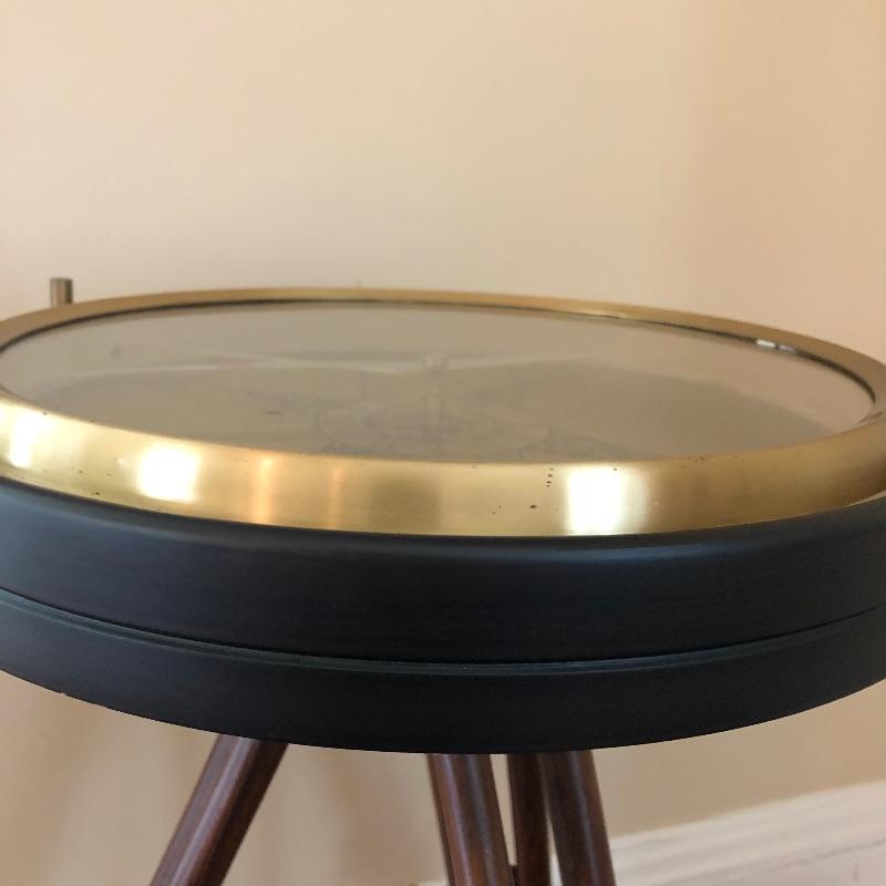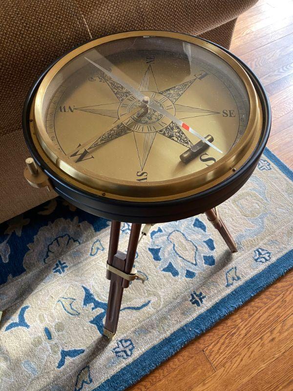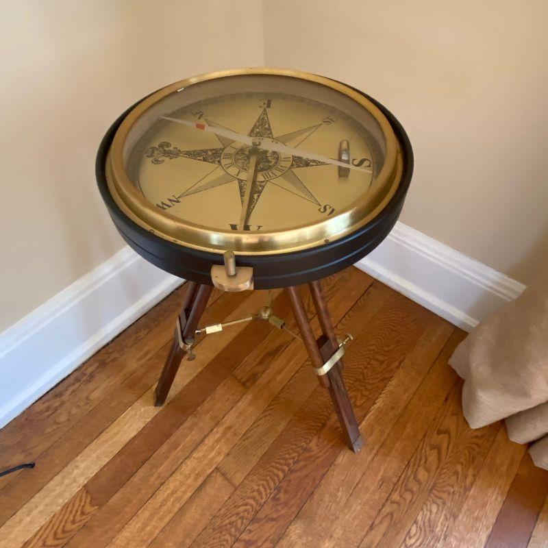 Get the conversation started with this neat compass table. All your friends will want to know where you got this beauty. Compass has adjustable legs with brass fittings and a glass top. A great gift for the study or office.