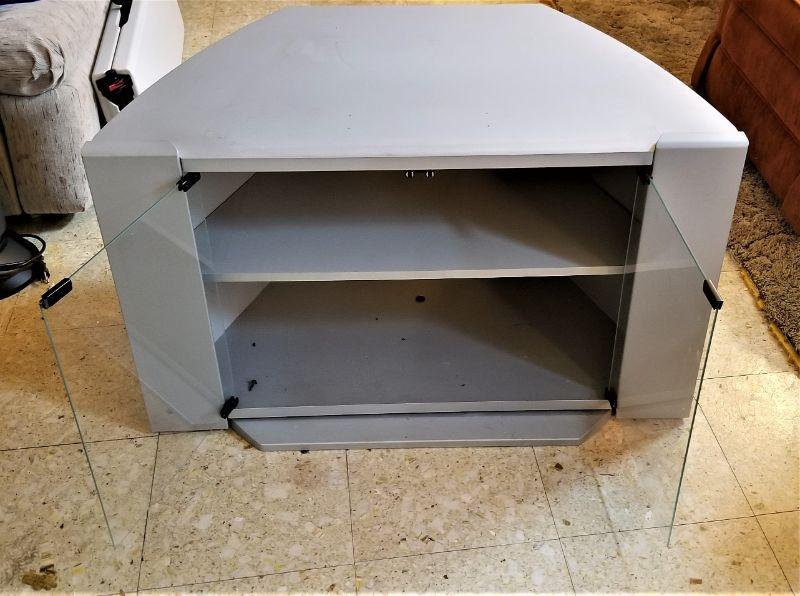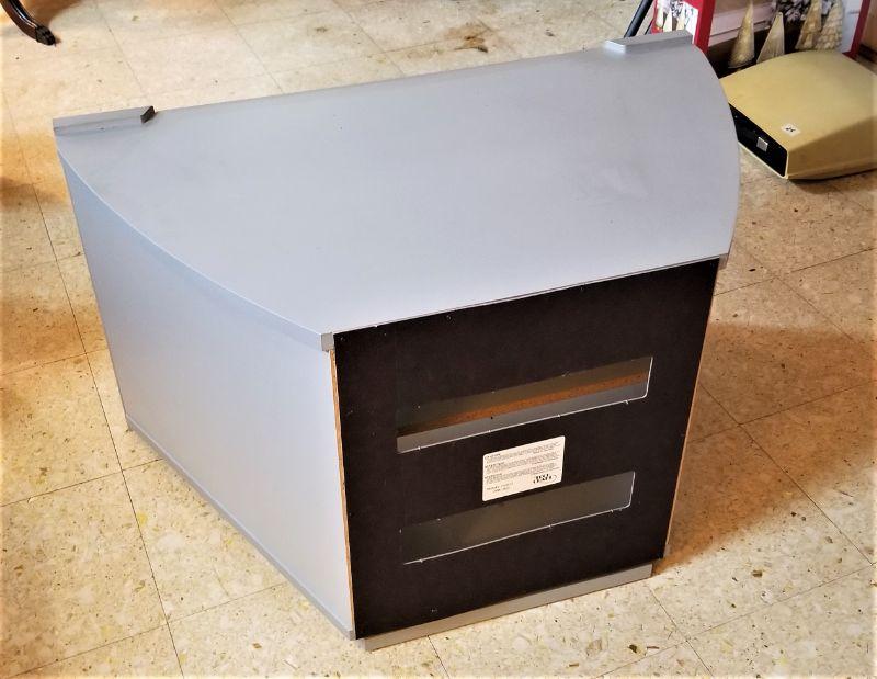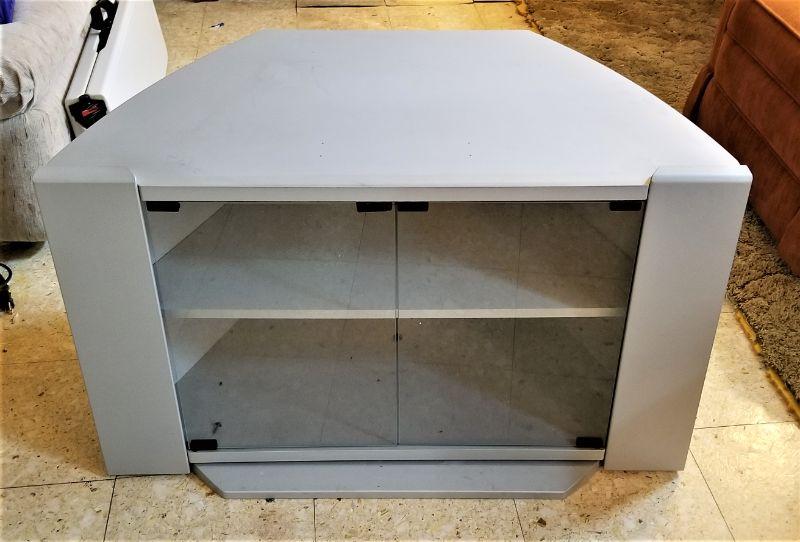 Light Gray contemporary tv or component stand with shelves and glass doors, made by Tech-Craft. 35.5" wide, 21" deep, 21" tall. Swivels. Good used condition.