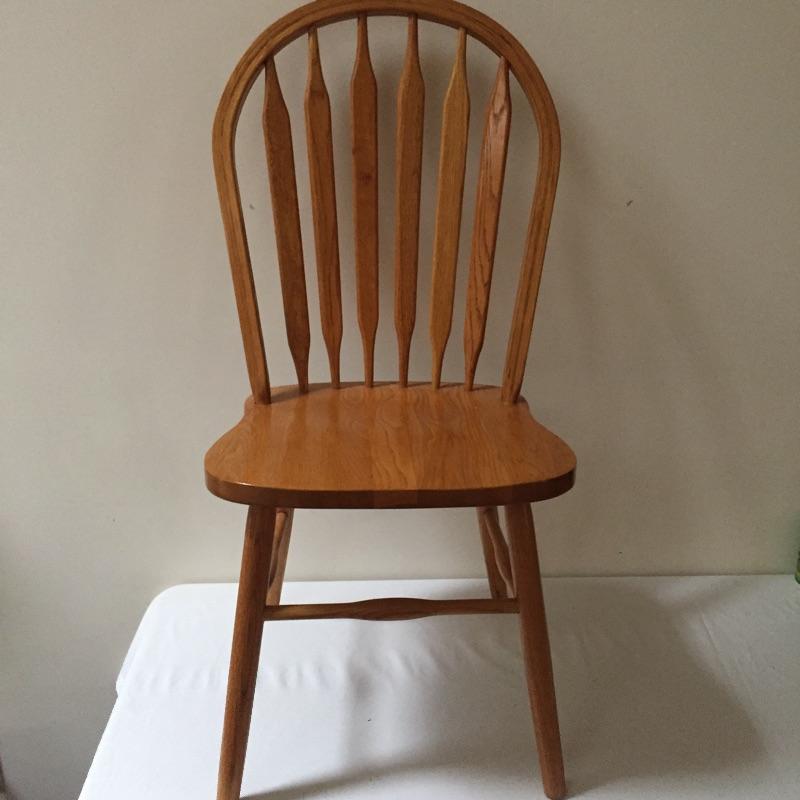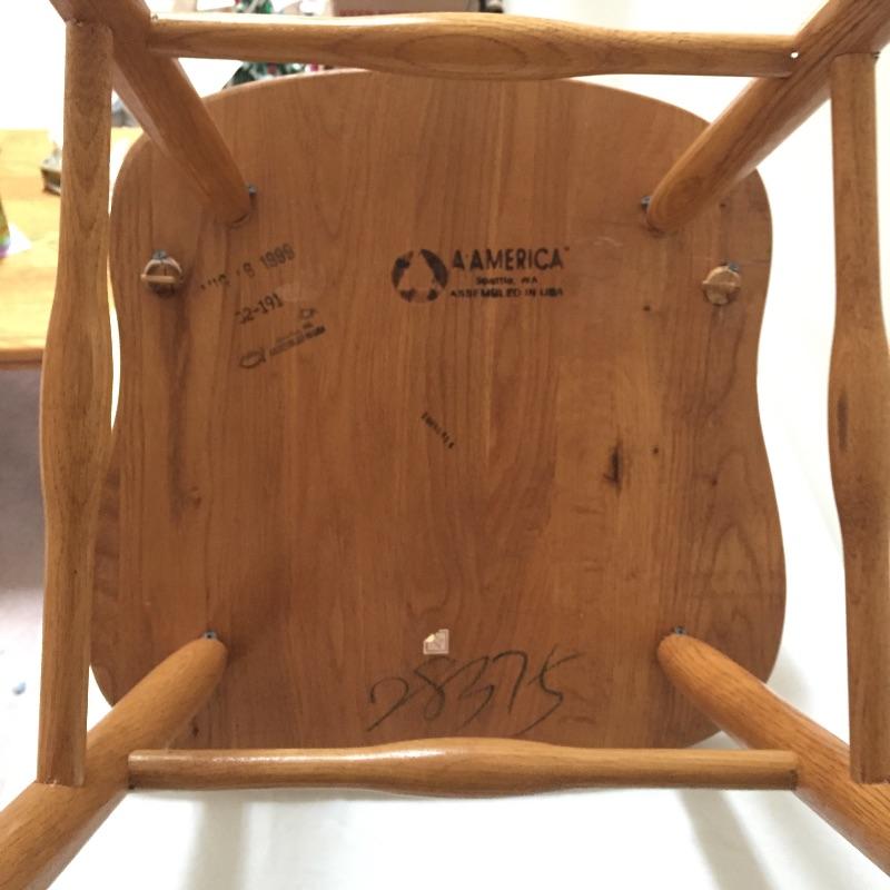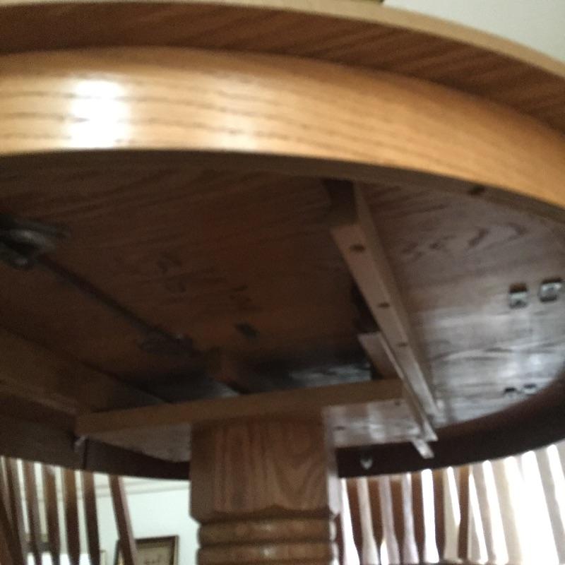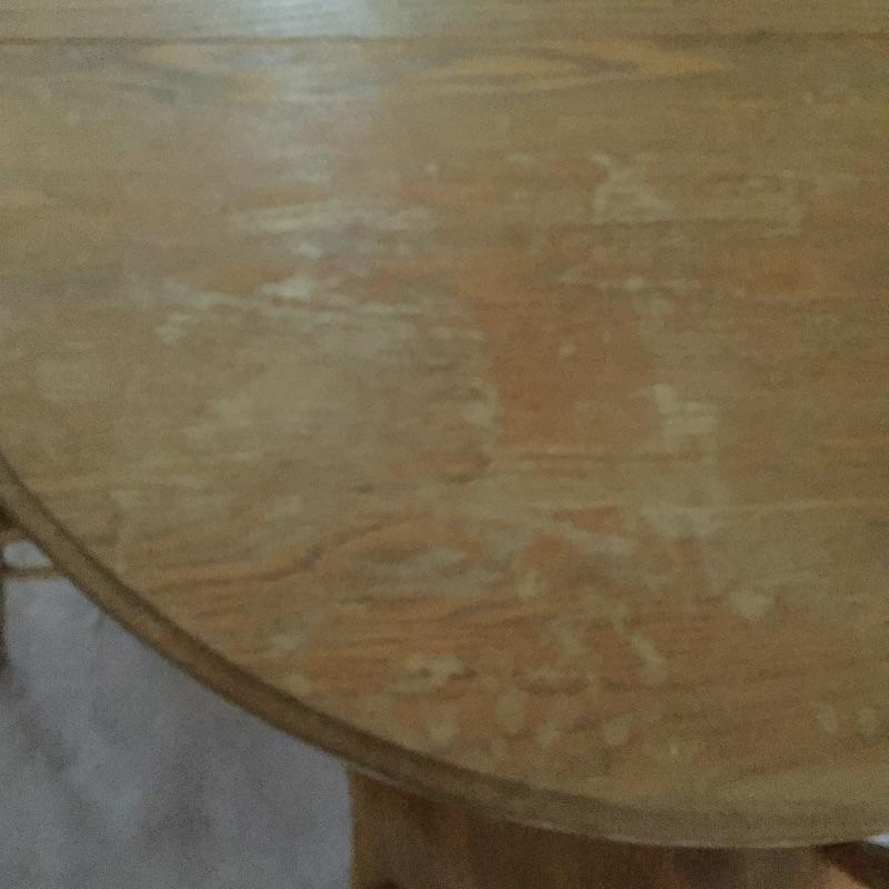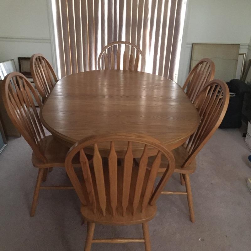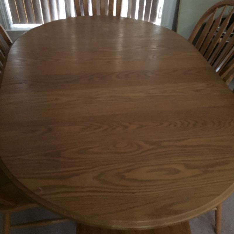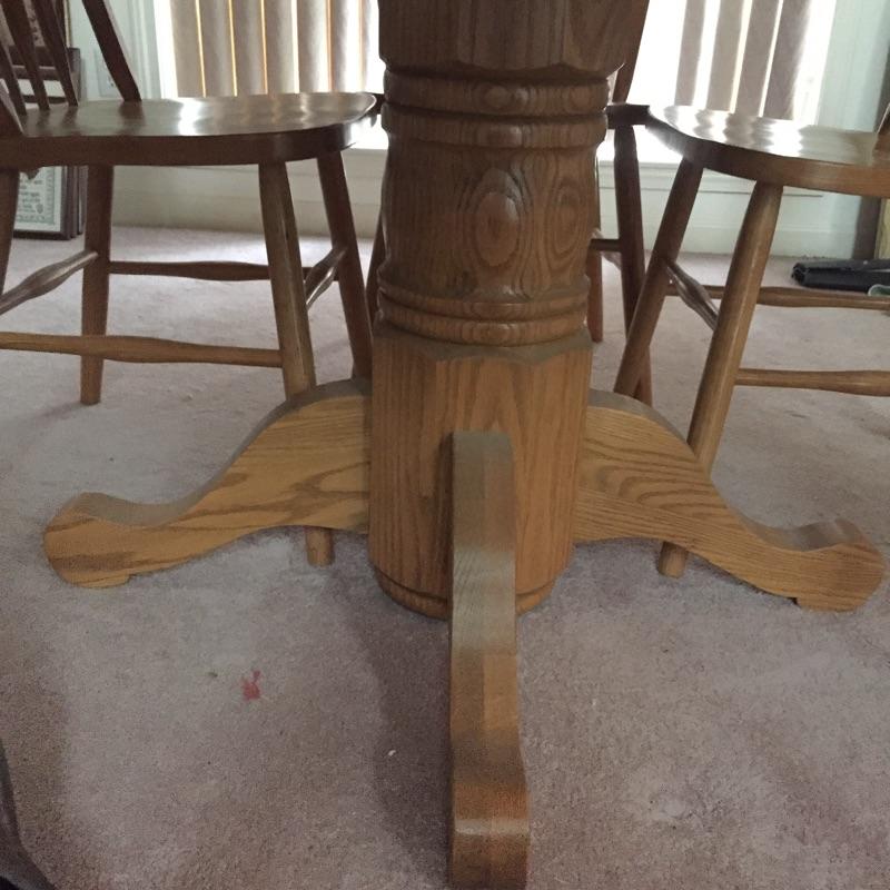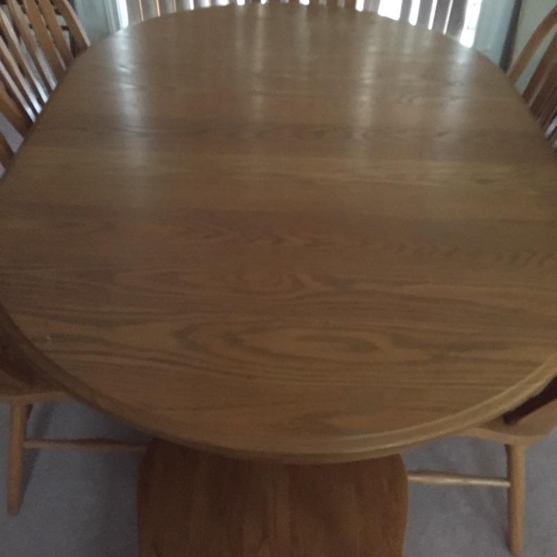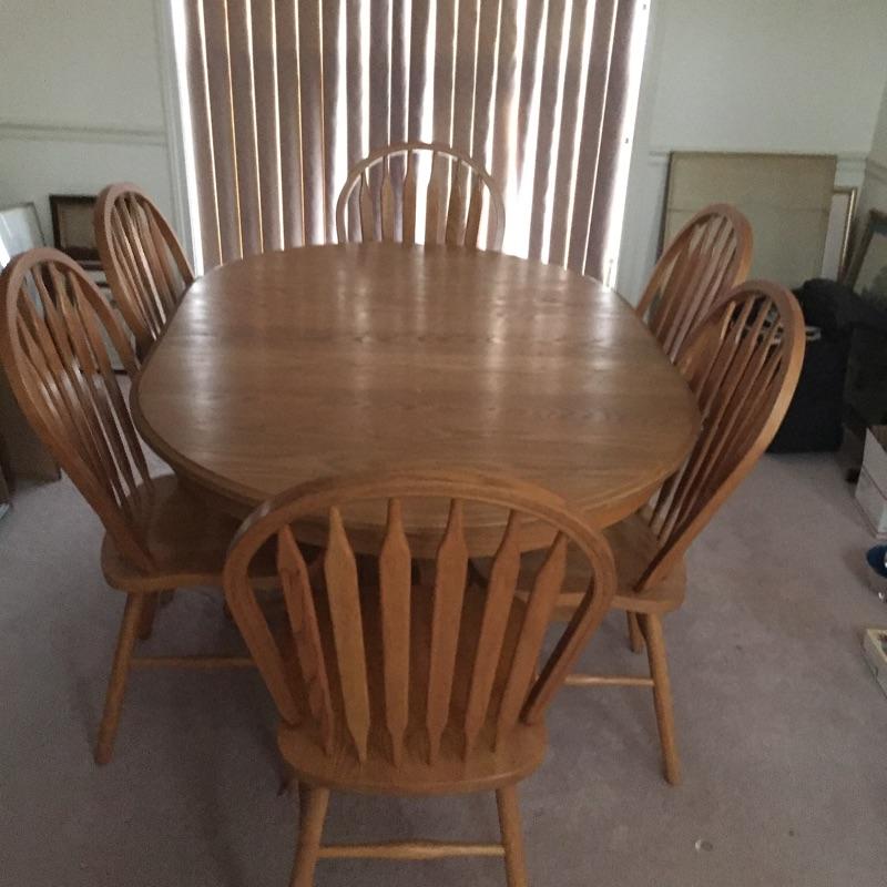 Lovely table with 18” leaf and 6 chairs. Table need top refinished - see pictures. Chairs stamped "A.America" on bottom.