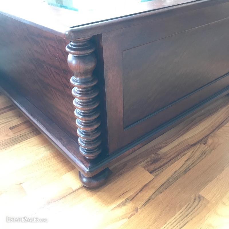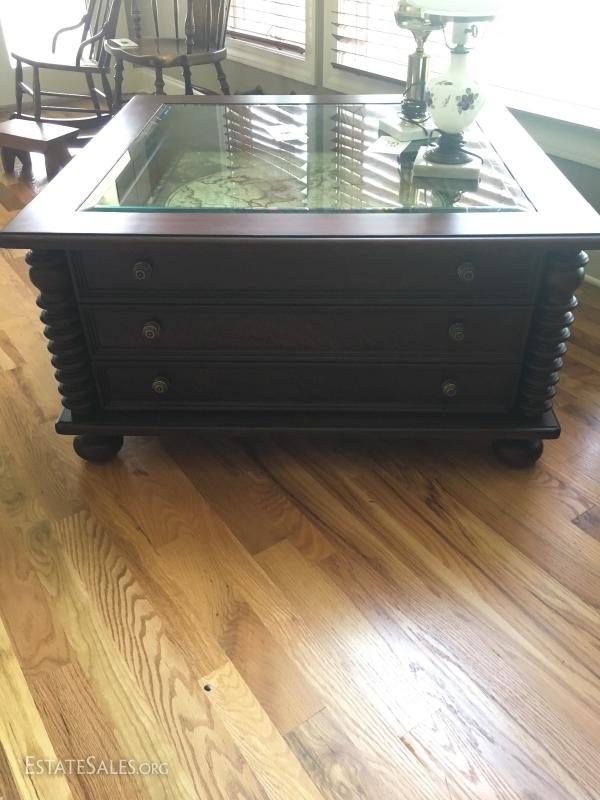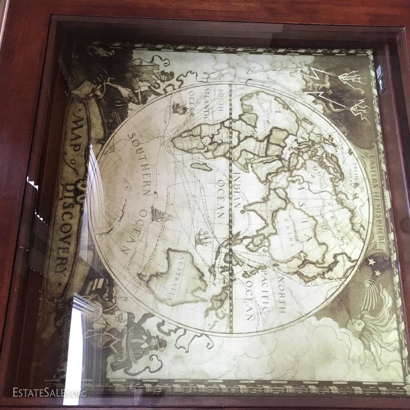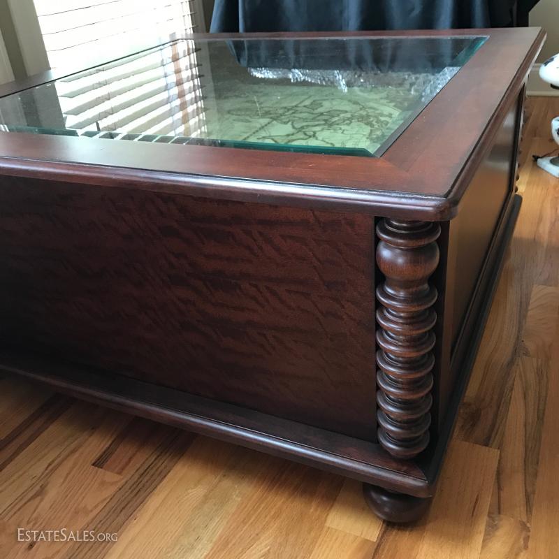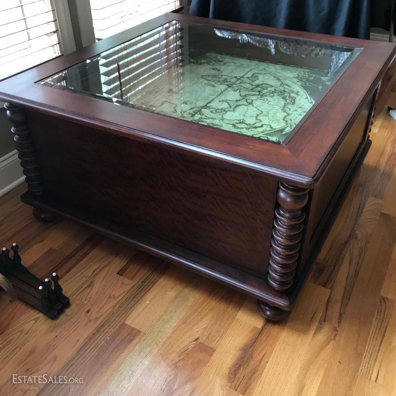 Lane, National Geographic Home Collections coffee table. Two drawers with one opening up to map for display. Map is incidental, you could put anything you'd like on display.