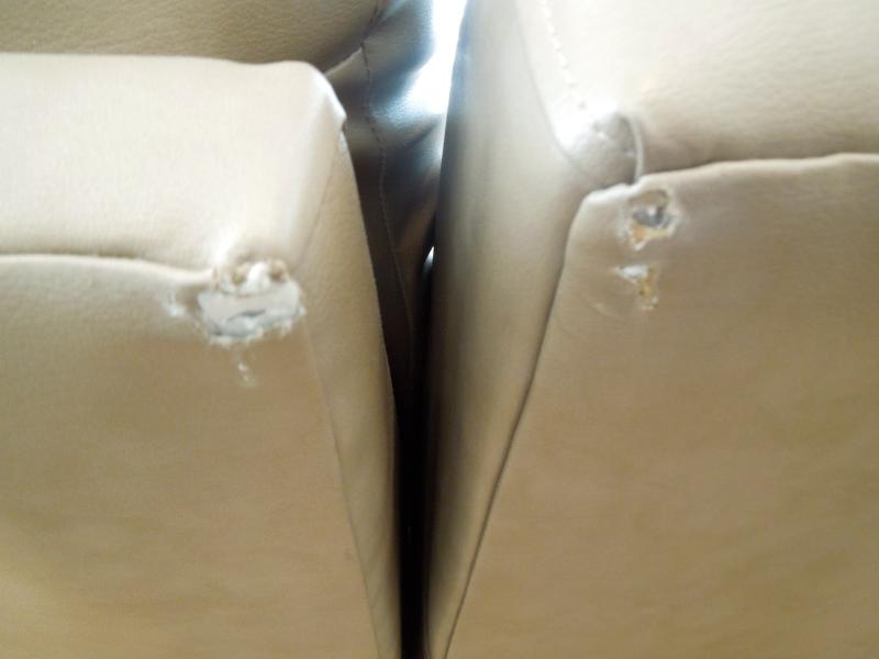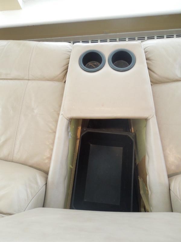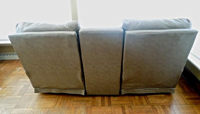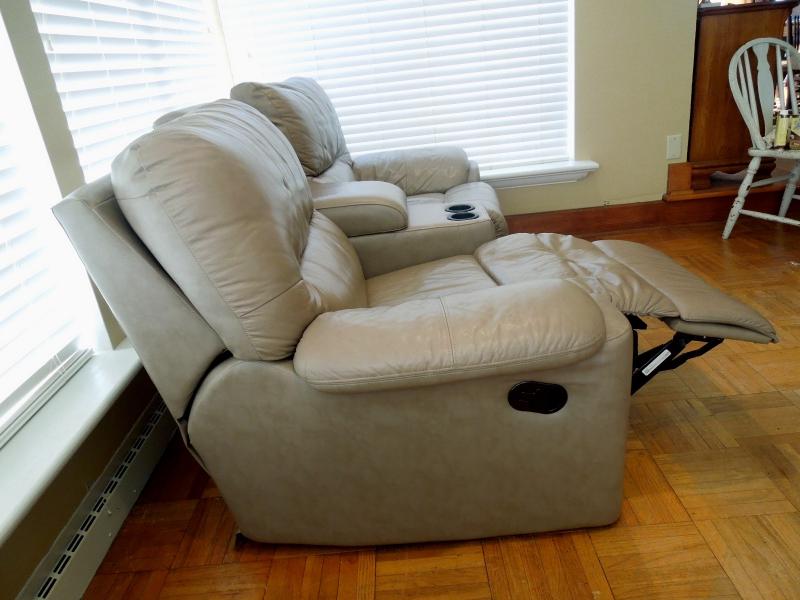 Three interlocking pieces with console center. Console has two drink holders and opens for storage. Chewed area on back edge as shown, otherwise no rips or tears. Bothe sides recline. Reclining mechanism works well. Mushroom colored faux leather upholstery. 82" L x 41" W x 38" H. Three separate pieces can be disassembled.