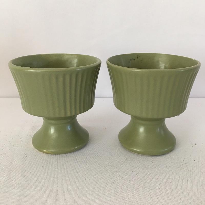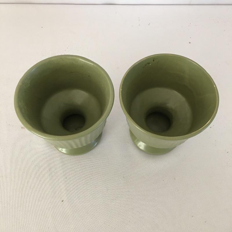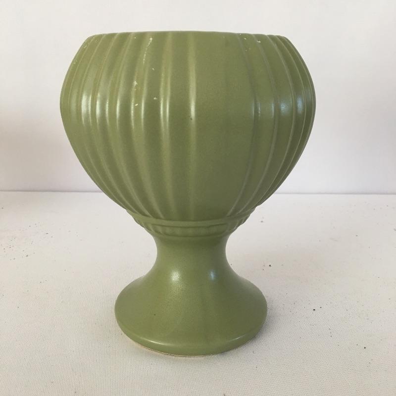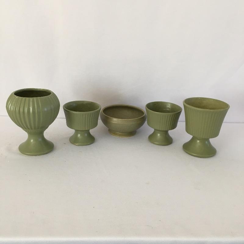 Floraline pottery # 2. Lot includes five pieces all signed and numbered. Includes Two # 470, # 467-0, #407 and # 473. The majority of pieces stand elegantly footed and bowl is a slightly different shade of green. A nice selection of Floraline for you to enjoy. Tallest piece measures 5”D x 6.75” tall.