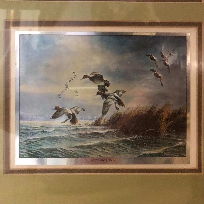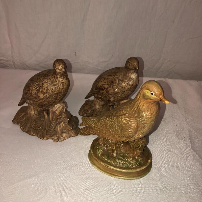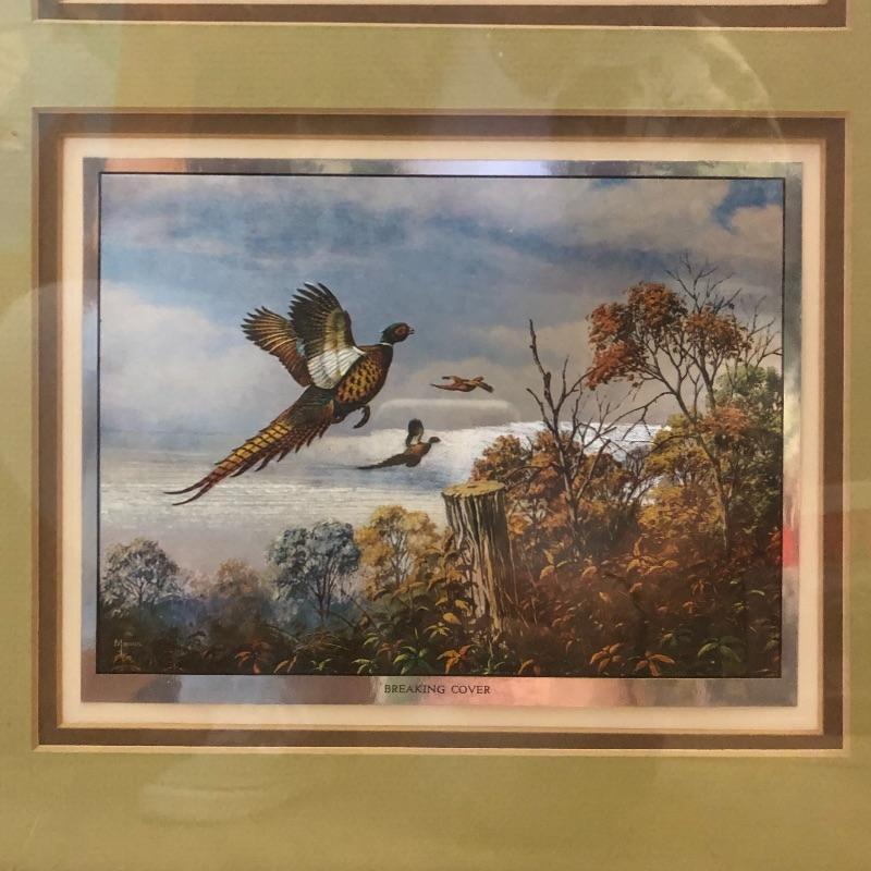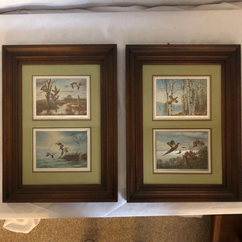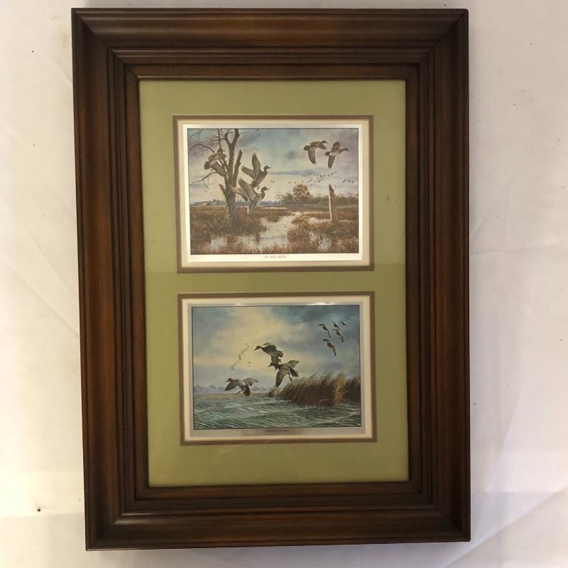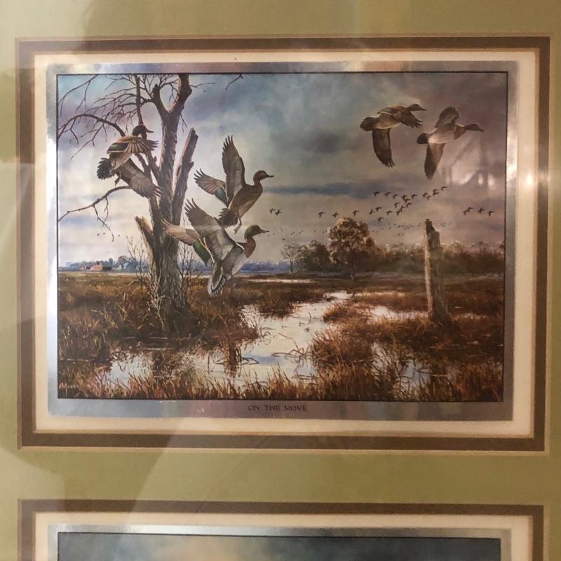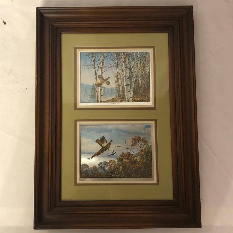 Fowl themed artwork by David Maass and three statues. The two framed artworks are reproduced in a shimmering color-etch to give it a metallic affect. They measure 16.25” long and 22.5” high. The depth of the frames is just under 1.5”. Two of the bird statues are the same, 7.5” x 8”, and the third is different and 7” x 7.5”. All three birds are ceramic and slip casted.
