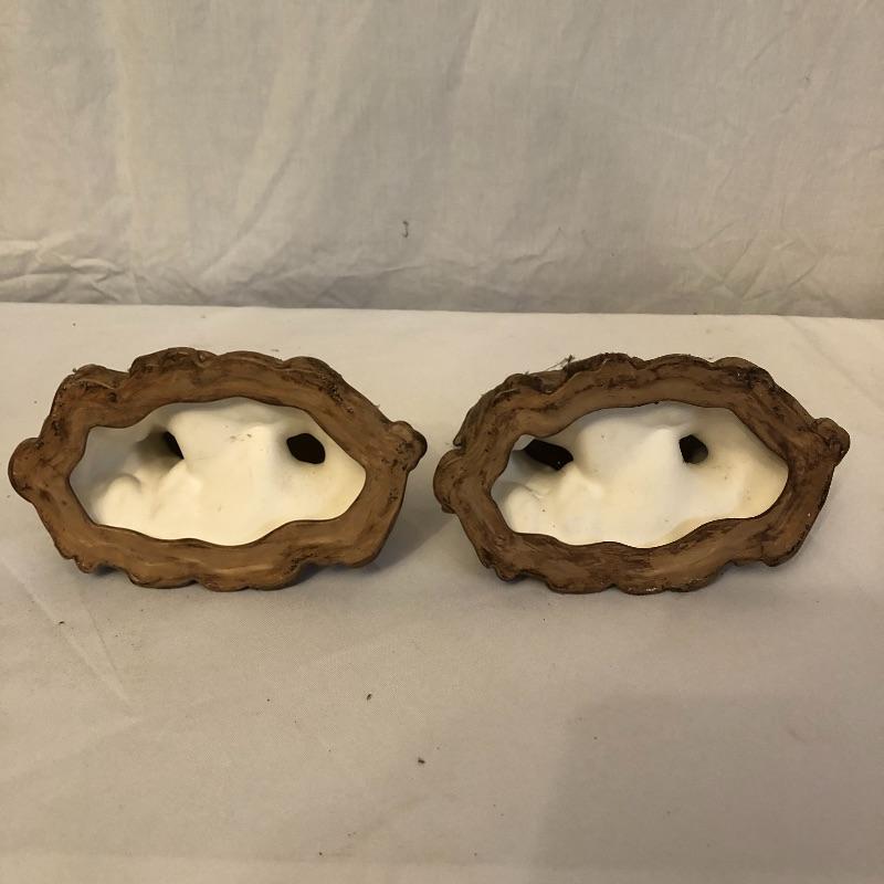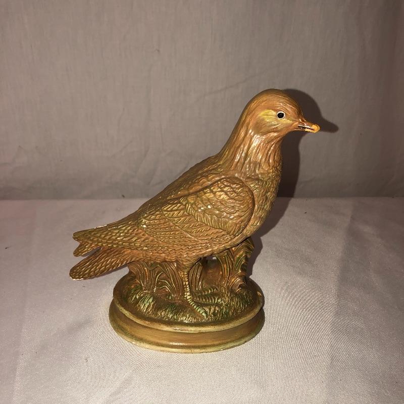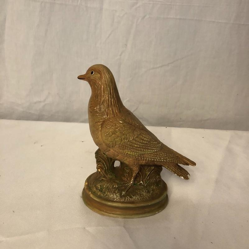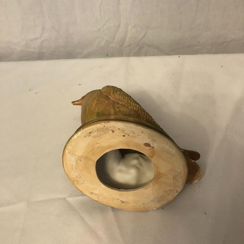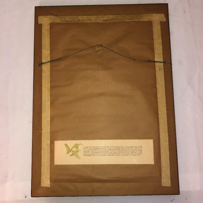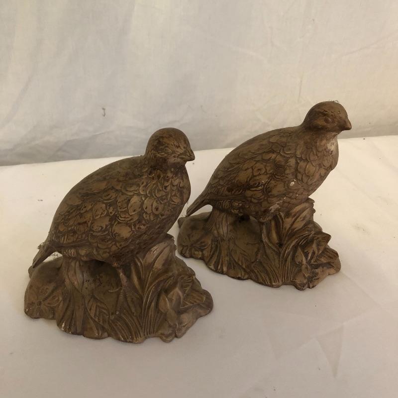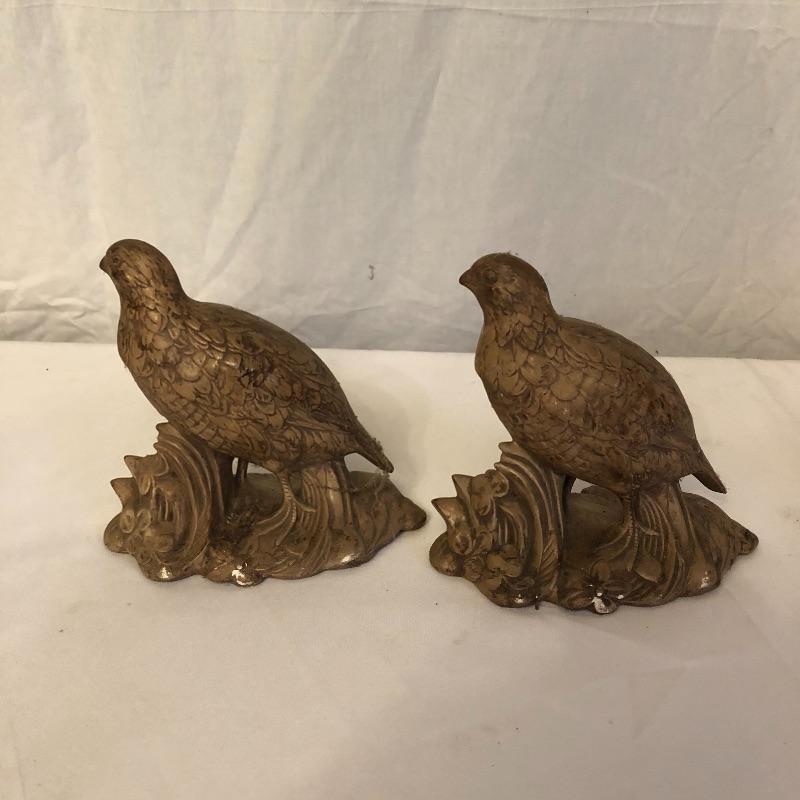 Fowl themed artwork by David Maass and three statues. The two framed artworks are reproduced in a shimmering color-etch to give it a metallic affect. They measure 16.25” long and 22.5” high. The depth of the frames is just under 1.5”. Two of the bird statues are the same, 7.5” x 8”, and the third is different and 7” x 7.5”. All three birds are ceramic and slip casted.