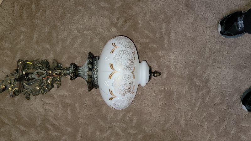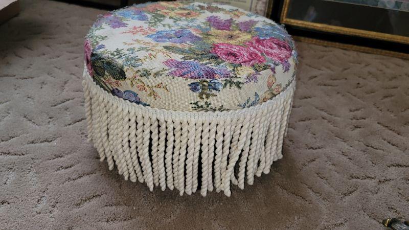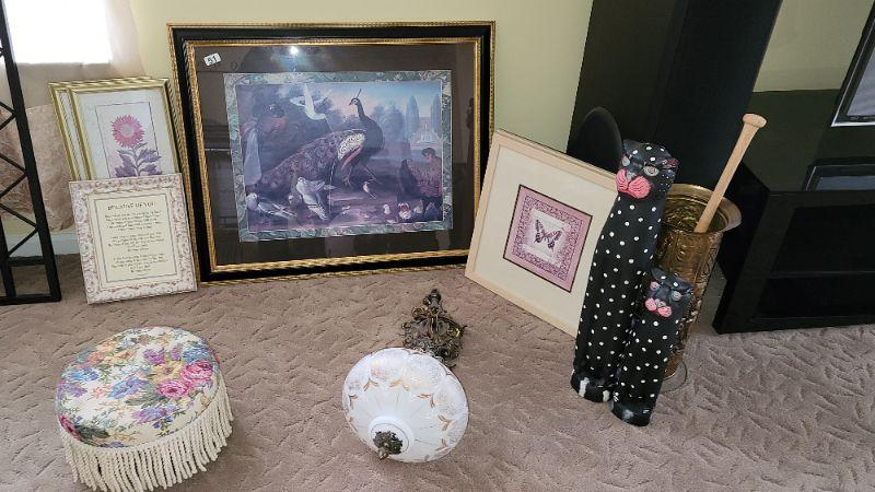 Lot 51: Framed pictures, umbrella stand, handpaited wooden cats , Beautiful Vintage hanging light and fringed footstool