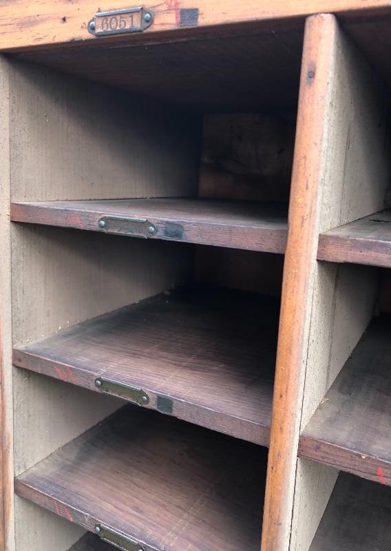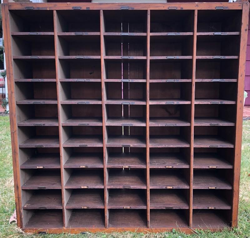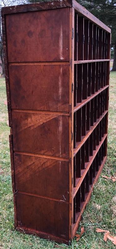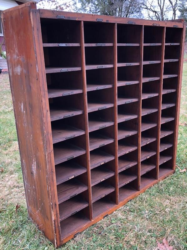 Antique Wood Letter/Mail Sorter. Please see all pictures for condition. You will need to be able to move yourself. Thank you for looking and have fun bidding! 33” L x 9-1/2” W x 33” H. 50 slots 6” L x 2-3/4” H x 8-1/2” D Please see all pictures for content of the lot, condition of the lot, and measurements if taken. Pictures are the best representation of the items listed and items are untested unless indicated in description. Thank you for looking and have fun bidding!