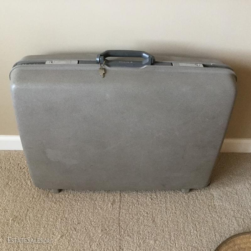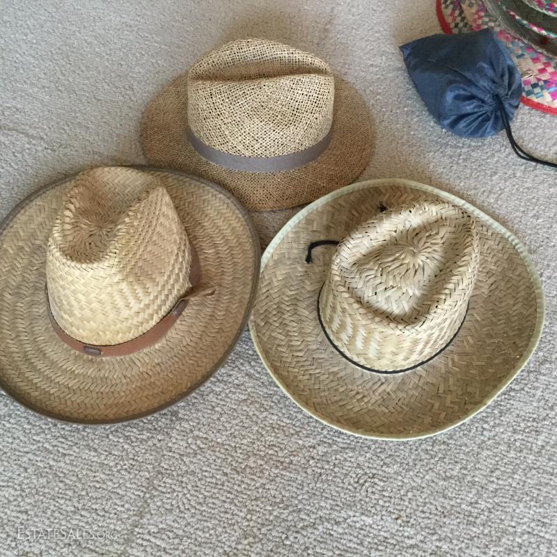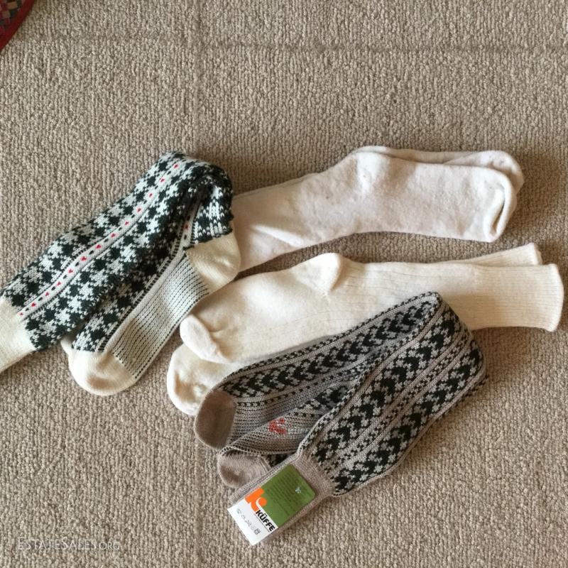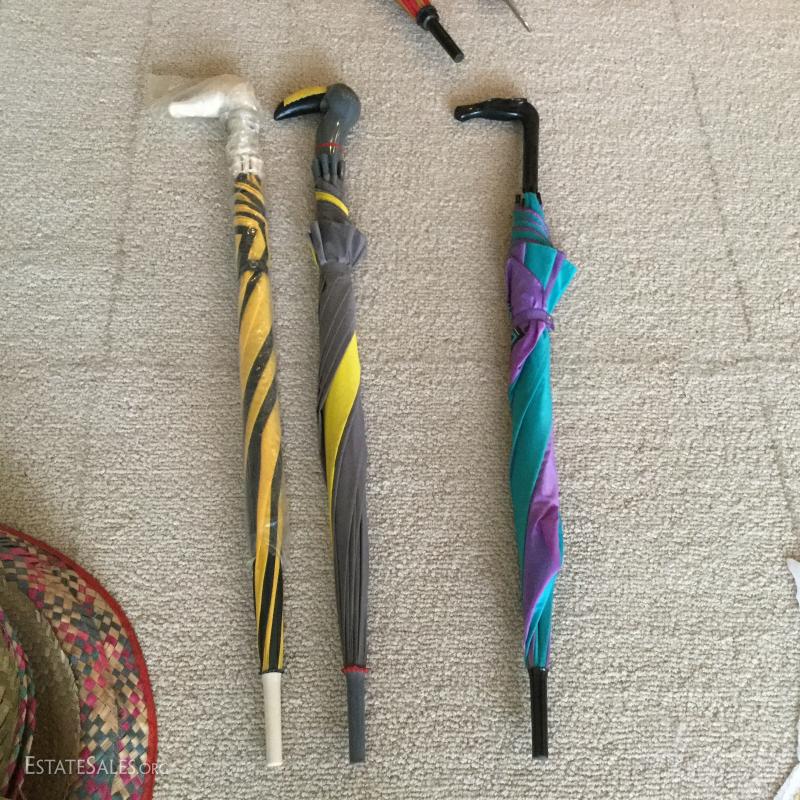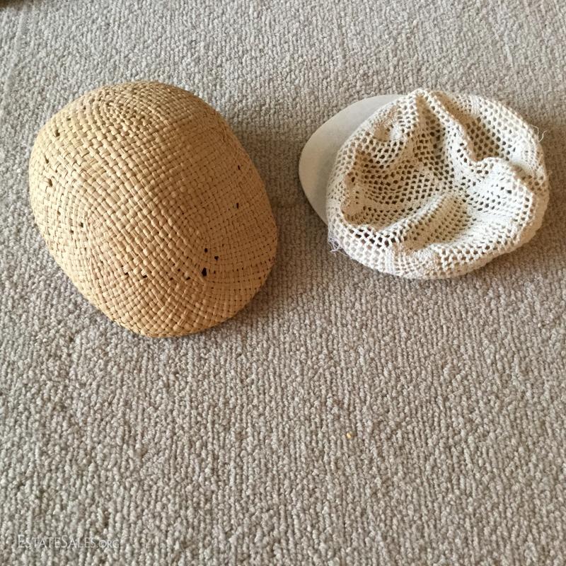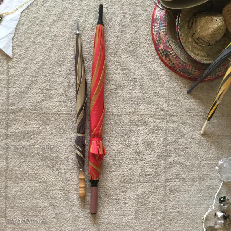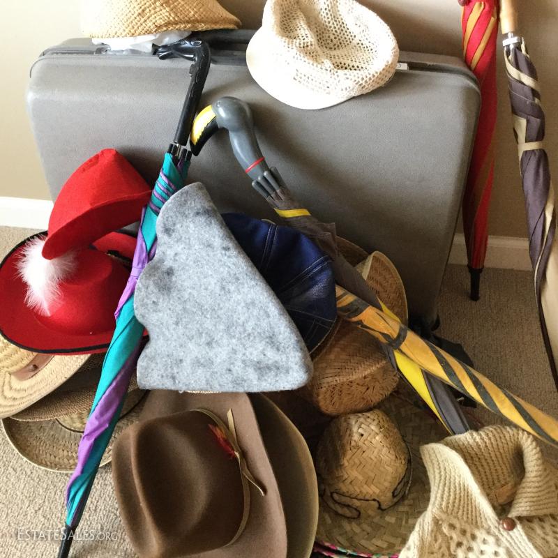 Hats in various styles. Chunky wool socks and sweater, likely men's small/medium. Samsonite Luggage, 28"l x 21"w with key. Several Umbrellas.