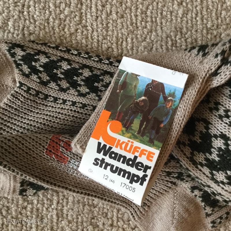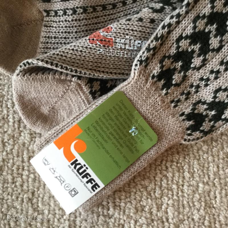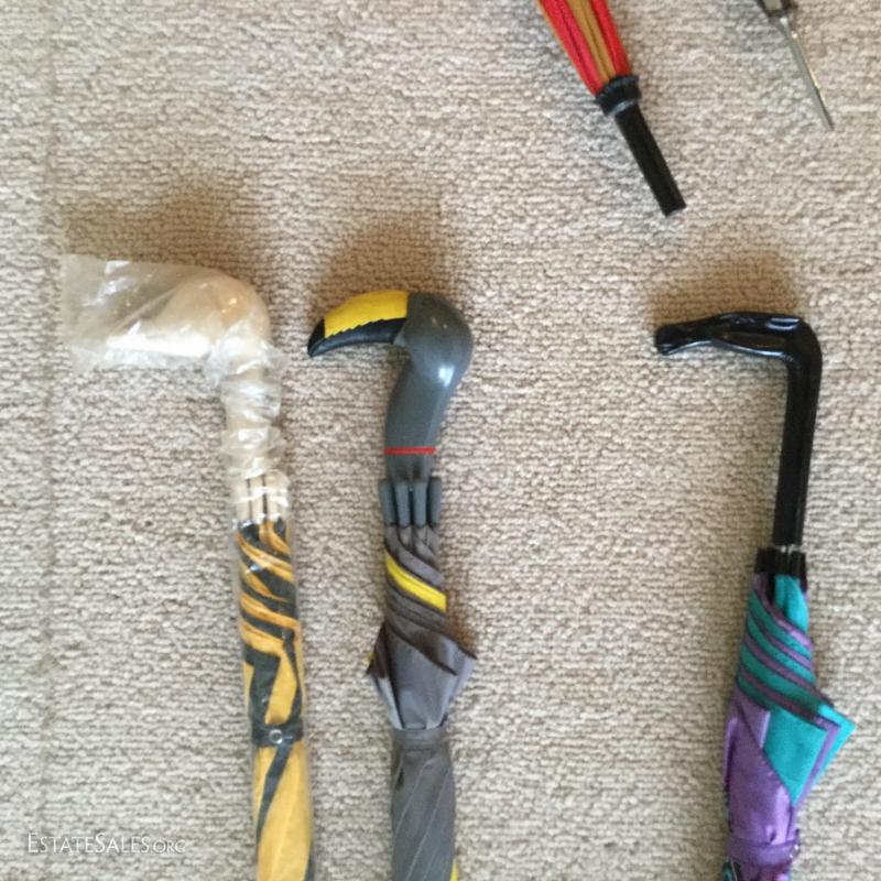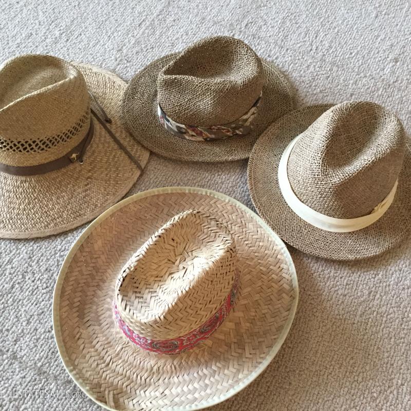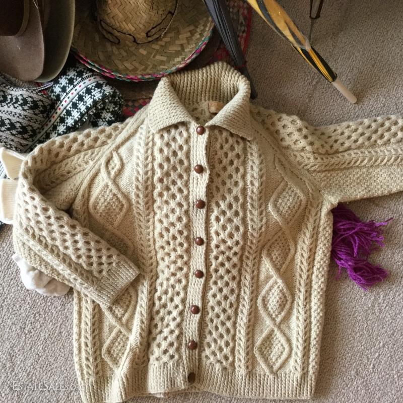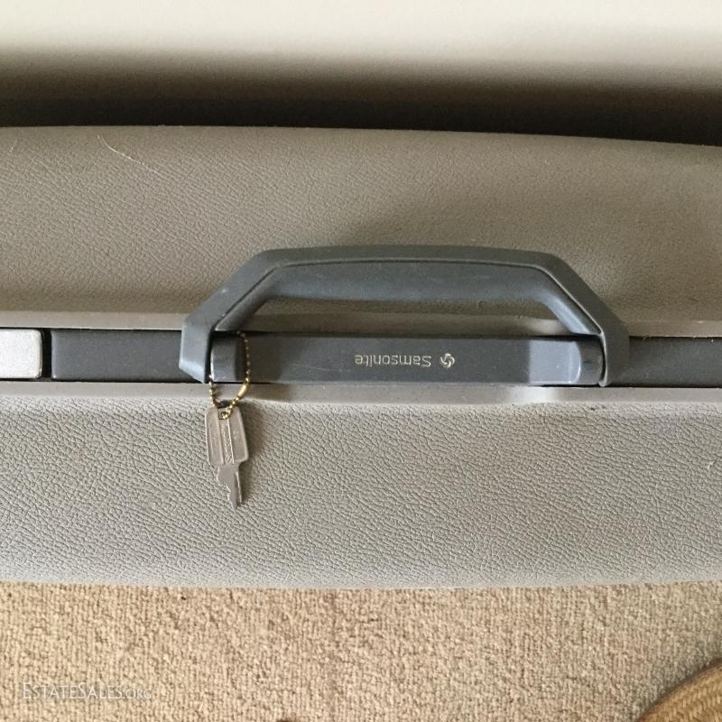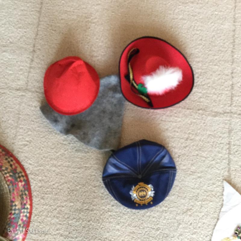 Hats in various styles. Chunky wool socks and sweater, likely men's small/medium. Samsonite Luggage, 28"l x 21"w with key. Several Umbrellas.