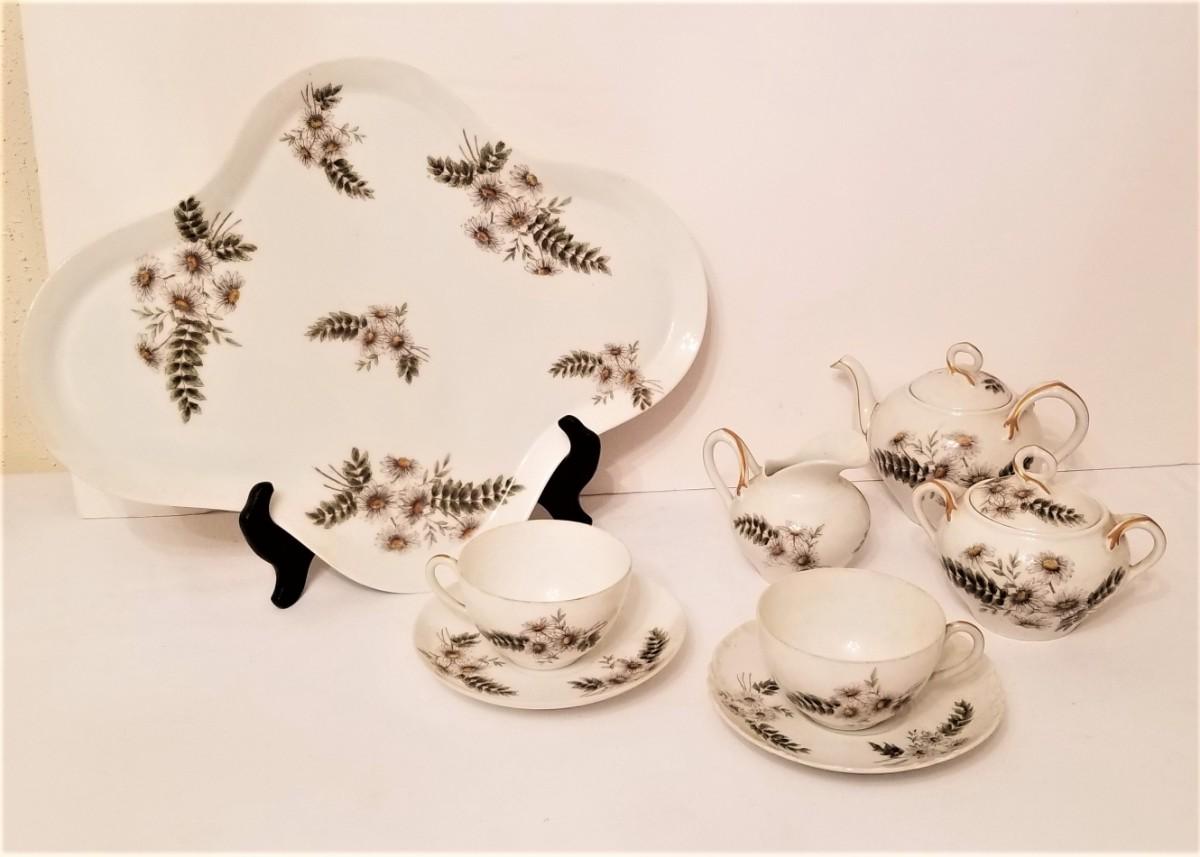 Tea set for two - comes with all you see here - Platter measures 15.5" x 12". Good antique condition. Note: the saucers are different - pattern the same but size is different.