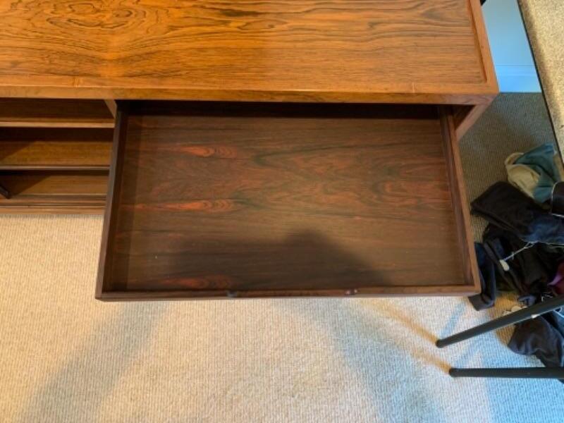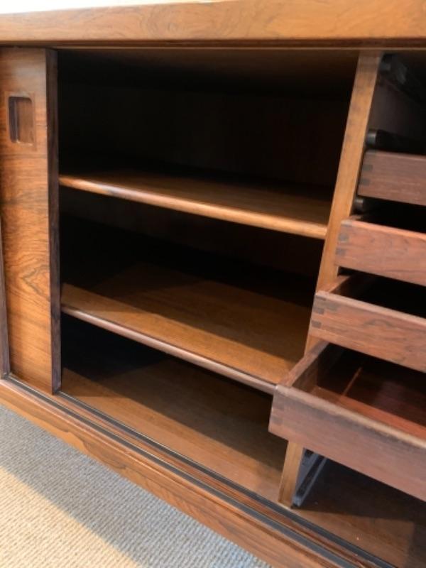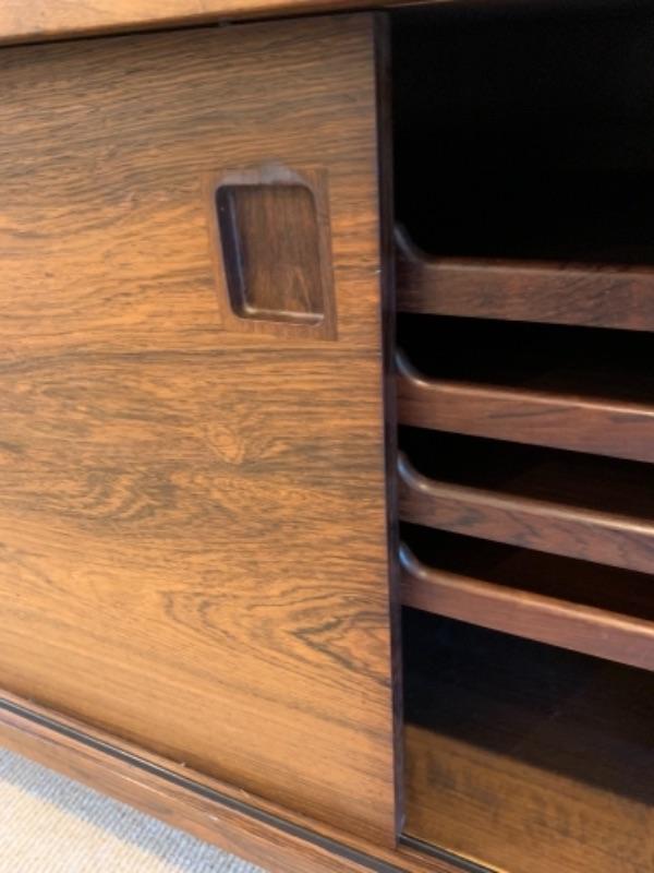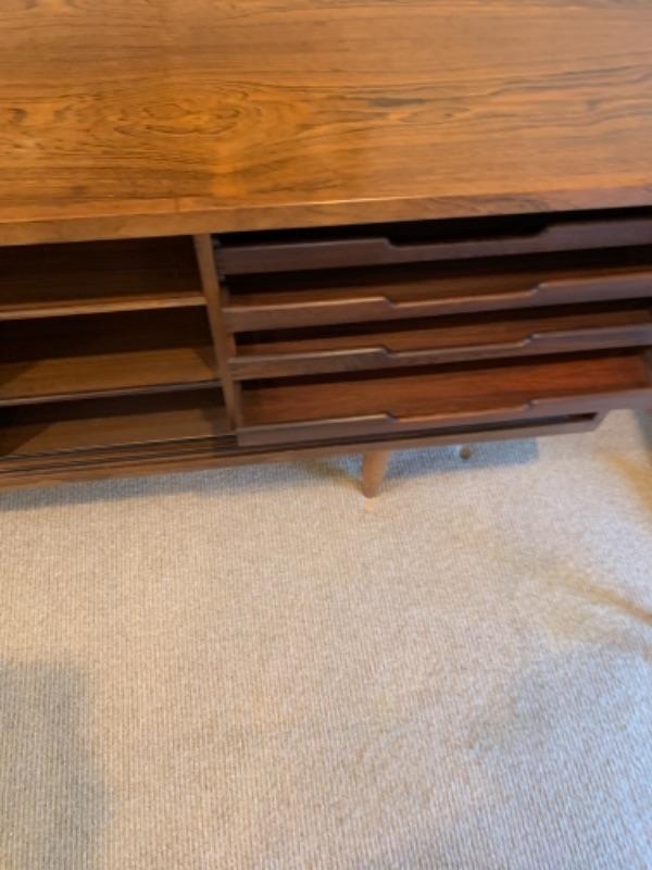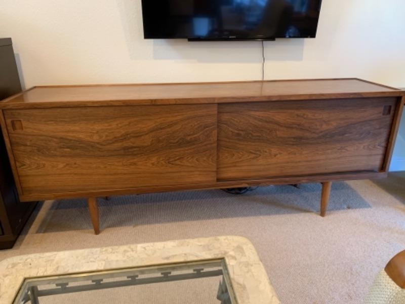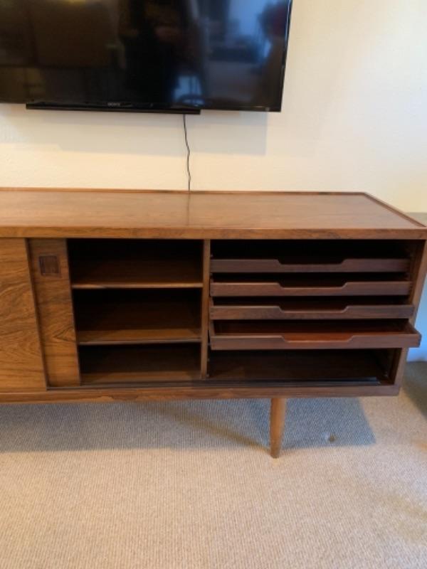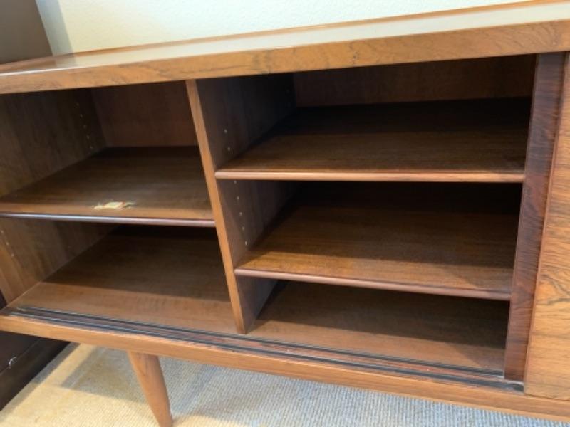 Lot 51. J. L Moller mid-century walnut credenza with trays and shelves. Measurements: 83” wide, 30” high, 19” deep--$1200