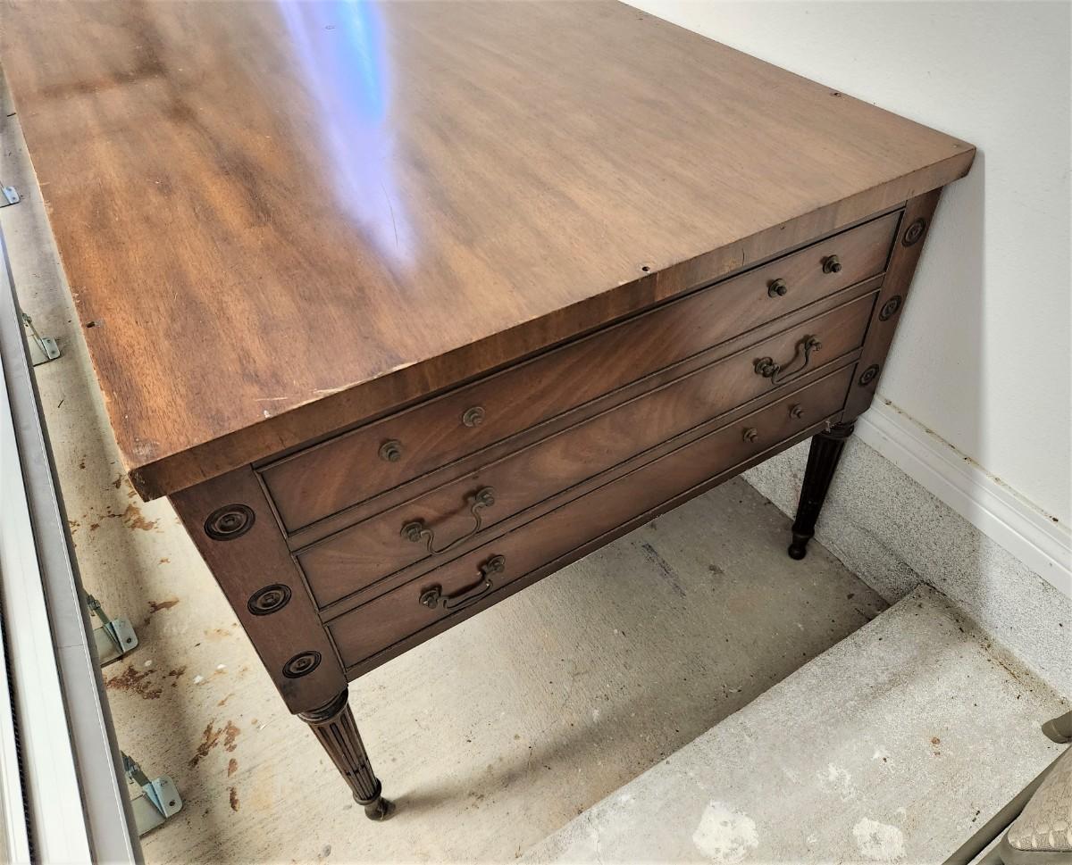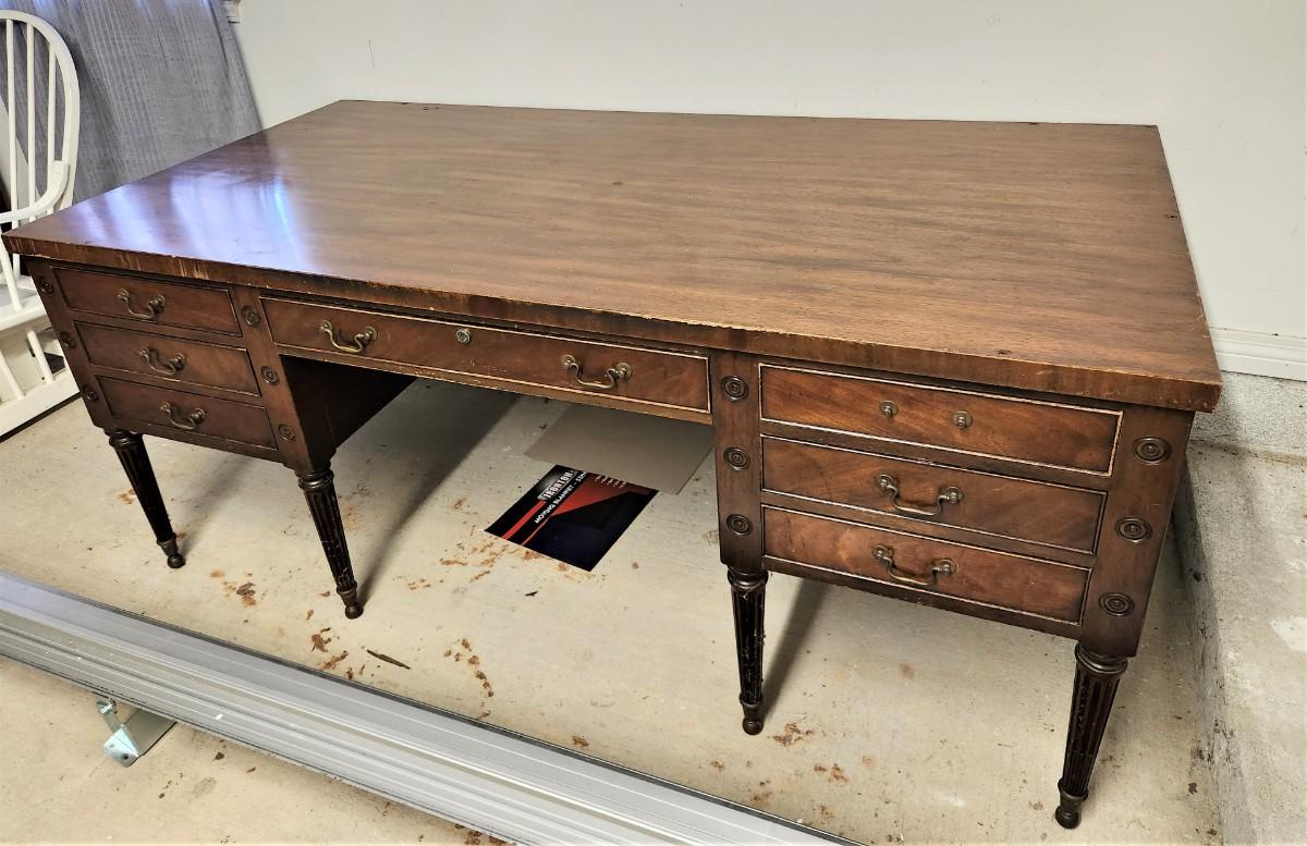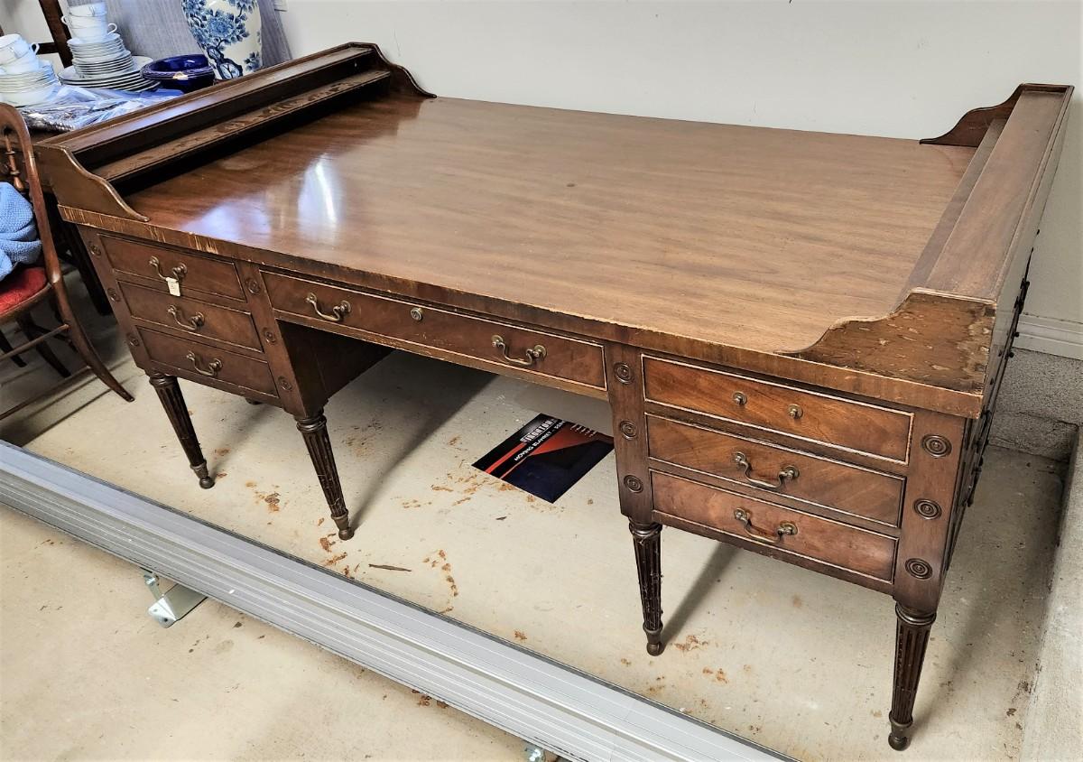 Large 7 drawer desk made in the form of a Partner's Desk (drawers on back are faux) - Kittinger Furniture Company label, 100th anniversary (1966) reproduction of a piece they had made 100 years before. It's a big one - 3 feet deep, 6 feet across, 30.75" tall. Some missing hardware - definitely needs some love. The pegs that originally held on the side galleries are now missing. Still, this was a very expensive piece of furniture when it was purchased.