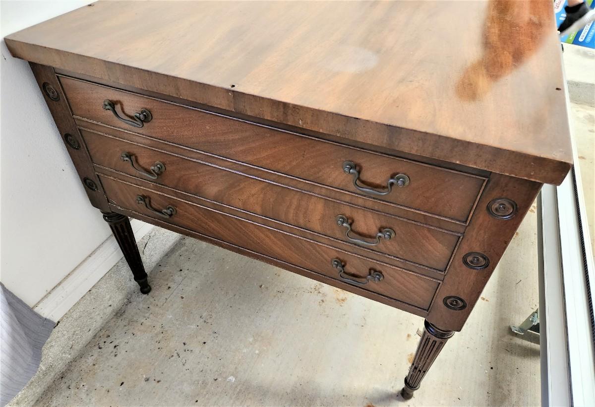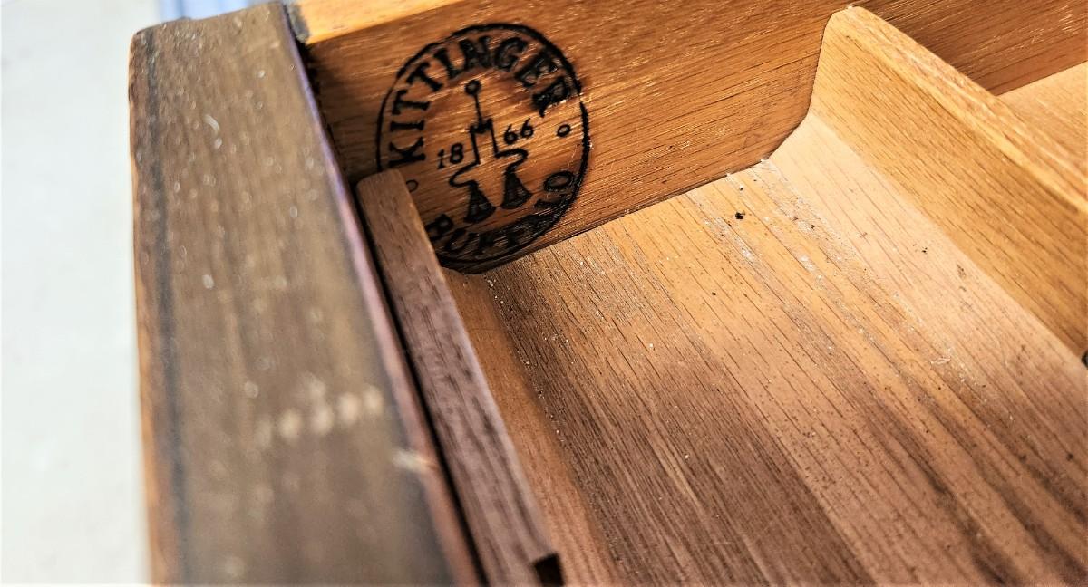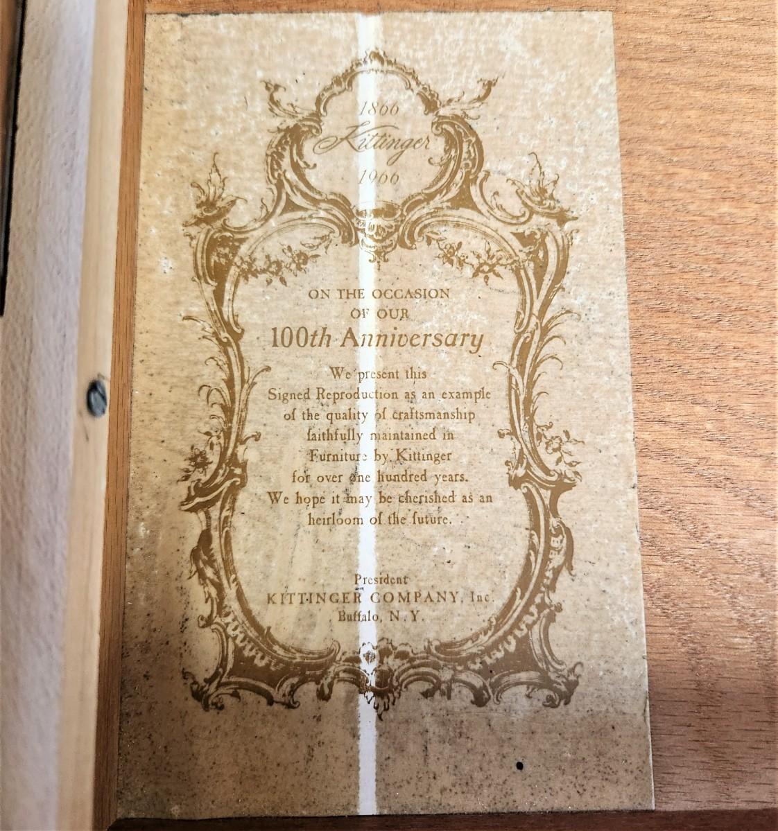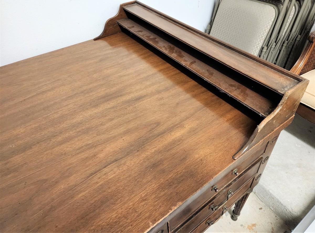 Large 7 drawer desk made in the form of a Partner's Desk (drawers on back are faux) - Kittinger Furniture Company label, 100th anniversary (1966) reproduction of a piece they had made 100 years before. It's a big one - 3 feet deep, 6 feet across, 30.75" tall. Some missing hardware - definitely needs some love. The pegs that originally held on the side galleries are now missing. Still, this was a very expensive piece of furniture when it was purchased.