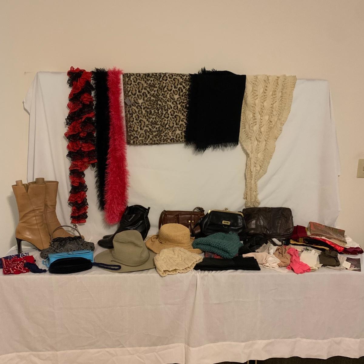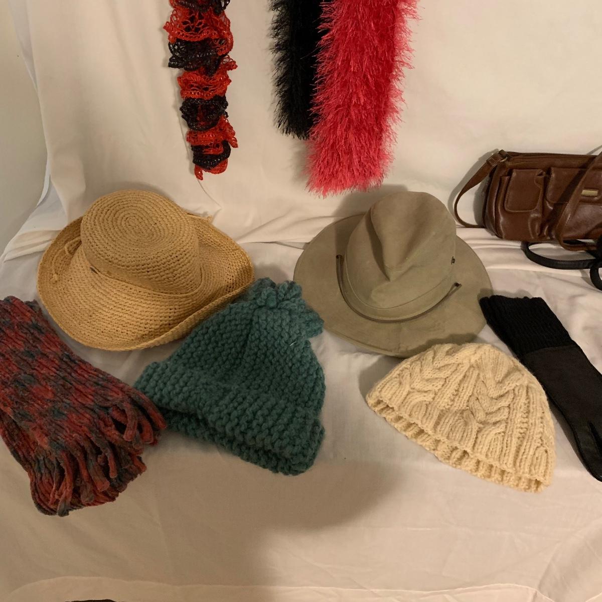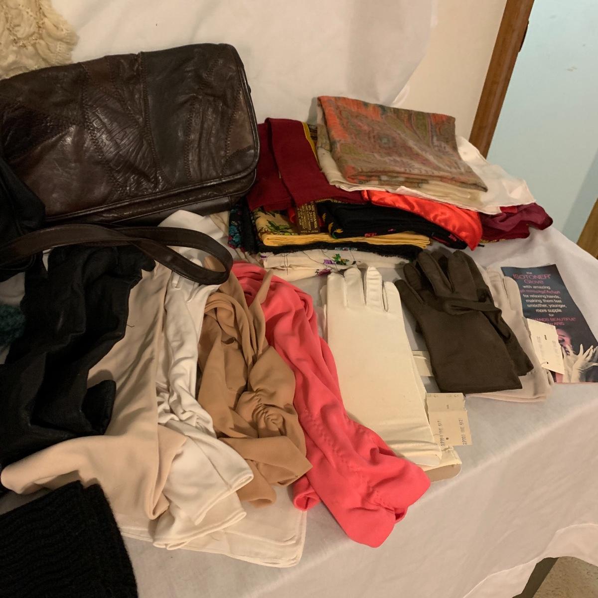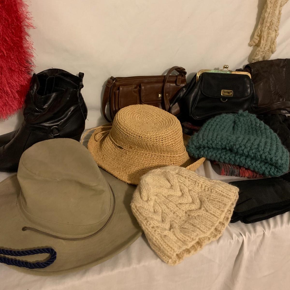 Lot includes two pairs of ladies boots, the tan taller ones are Size 9.5 and the short black are size 10. Four hats in the lot with the best being the Henschel Hat in a size medium. Approximately nine wool scarves with lovely patterns and floral designs and gloves of all lengths and color will give you plenty of options to accessorize. Gloves appear to be a size 8, but only one is marked. A few formal and every day purses completes the lot. You have great options if you get this lot. Shipping available.