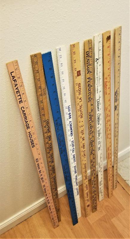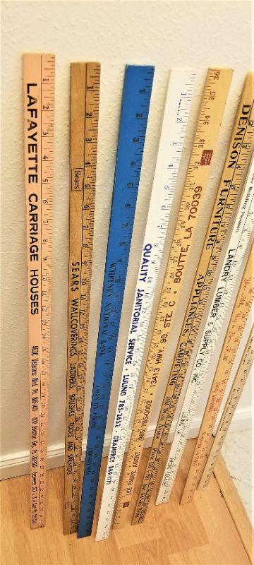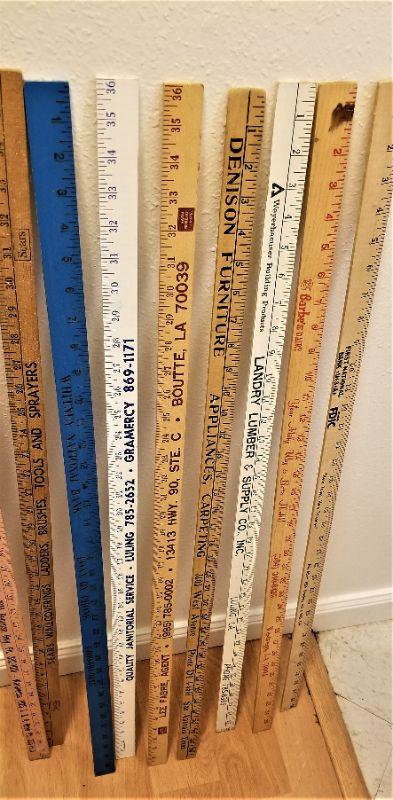 Lot of 9 different wooden yard sticks - advertising. Denison Furniture (San Antonio - VINTAGE) - Landry Lumber (Luling) - First National Bank (Boutee/Laplace) - Farm Bureau (Boutte) - Lafayette Carriage House (Westbank) - Quality Janitorial (Gramercy) - Whitney Bank - Sears - Barbe's Dairy (Westwego). All in good condition.