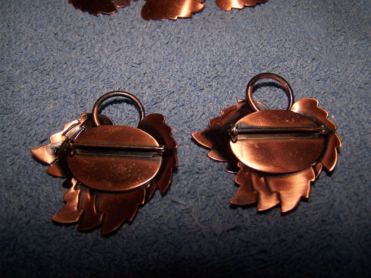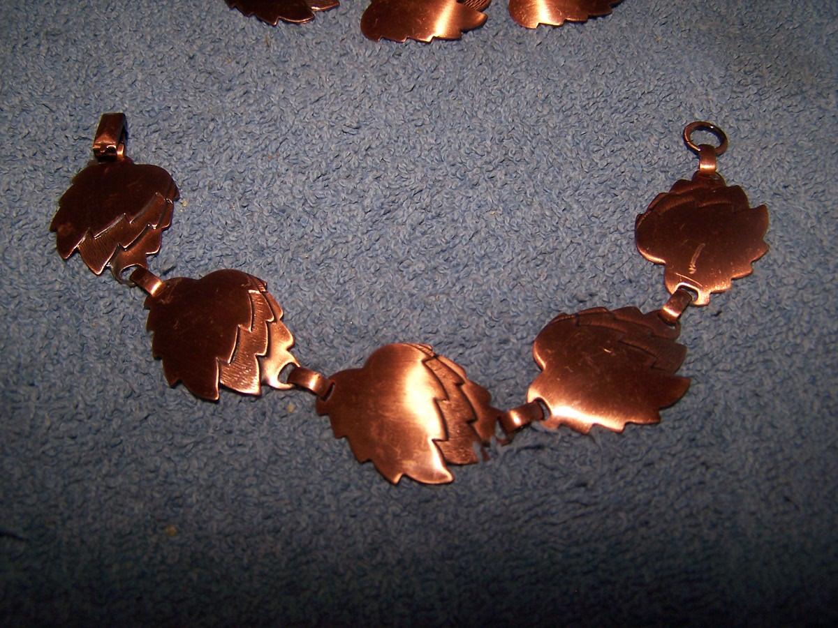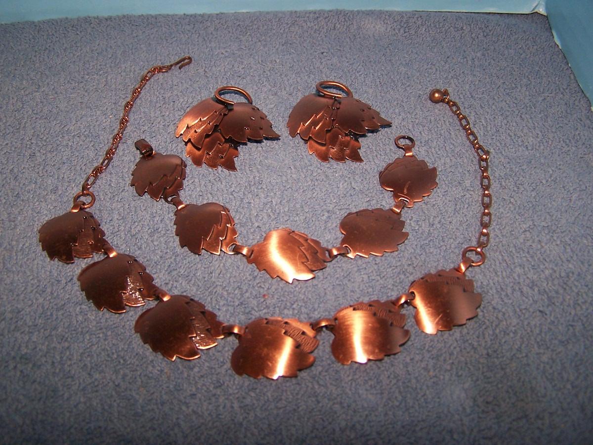 THIS IS A LOVELY VINTAGE COPPER LEAVES SET!!! UNMARKED.. BRACELET-7 3/4'', PAIR PINS-1 7/8'' ACROSS.. LIGHT WEAR..